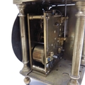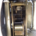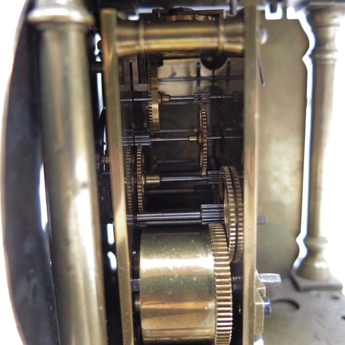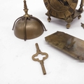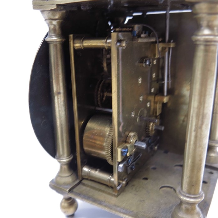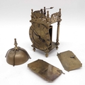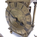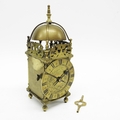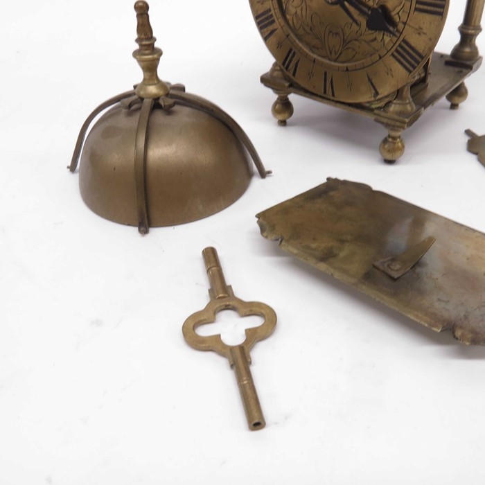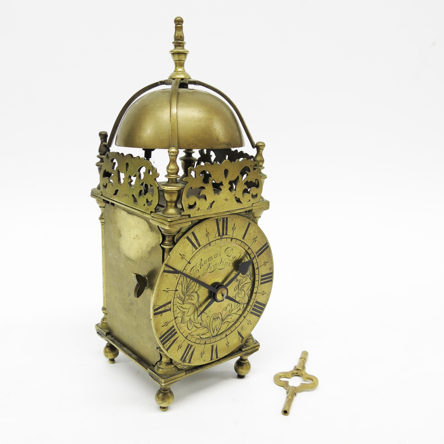 A brass lantern clock, brass chapter ring and brass engraved face, signed Thomas Dyde, London, fret carved gallery with turned finials and cross caged bell, on turned ball feet, 24cm high
