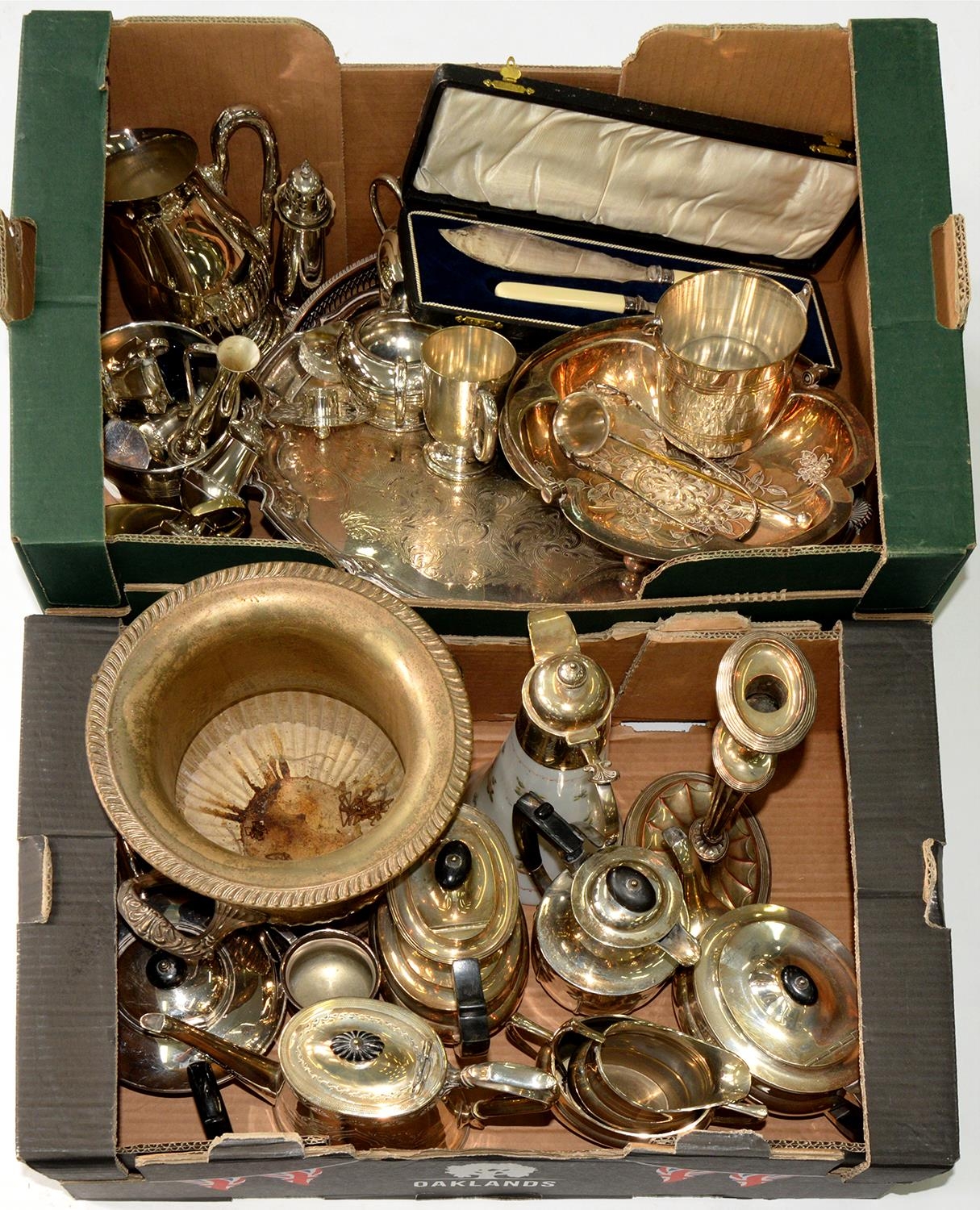 MISCELLANEOUS PLATED WARE, VICTORIAN AND LATER, TO INCLUDE TEA AND COFFEE SERVICES, EPNS MOUNTED ENAMELLED OPAL GLASS CLARET JUG, SALVER, DISH AND WINE COOLER