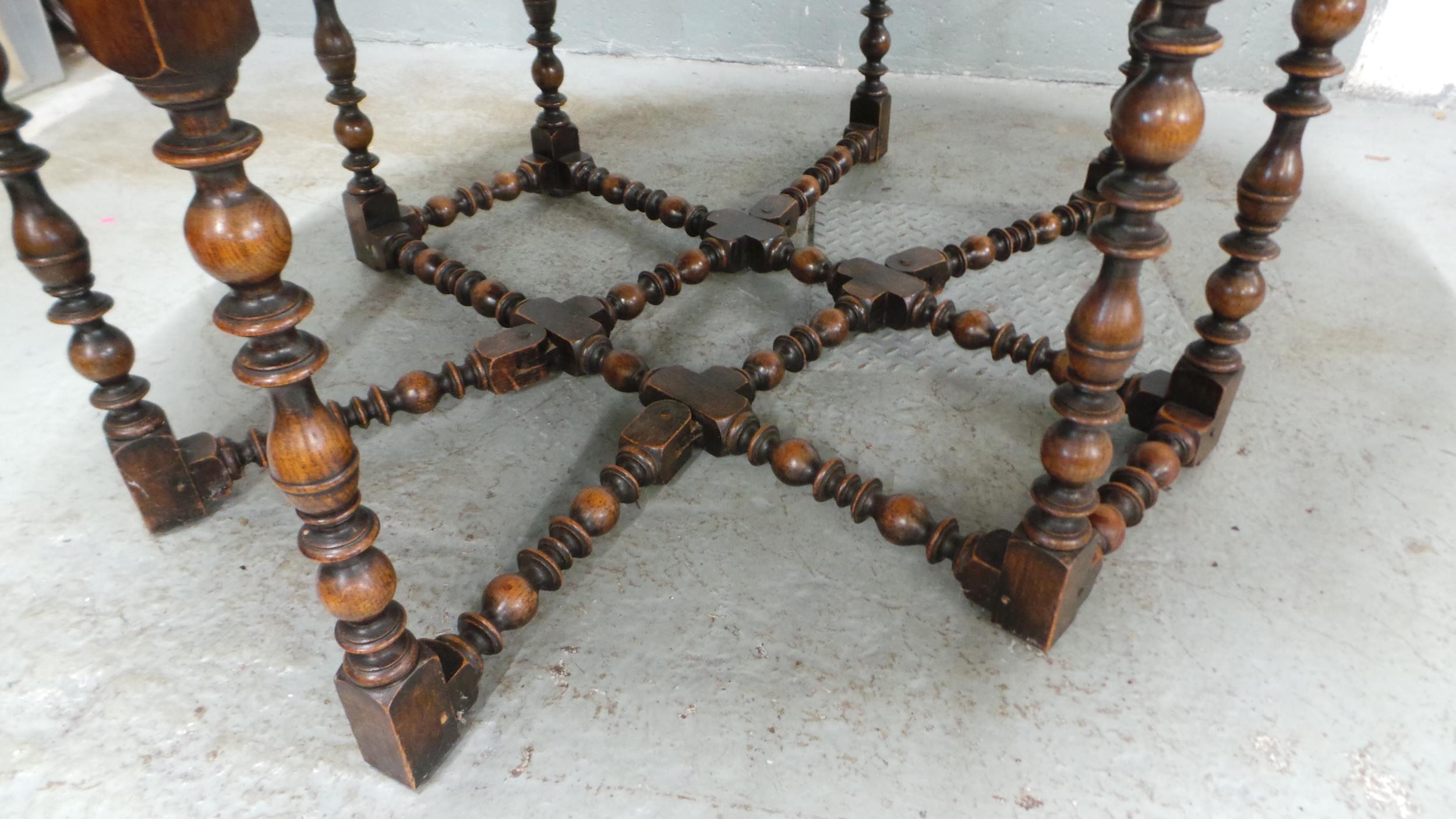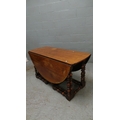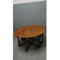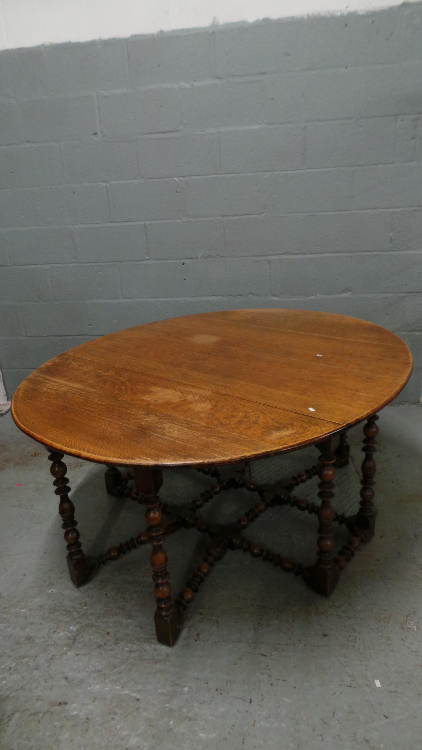 An oak drop leaf dining table with bobbin style turned legs. It measures approx' closed 137 x 58 and open, 137 x 159cm