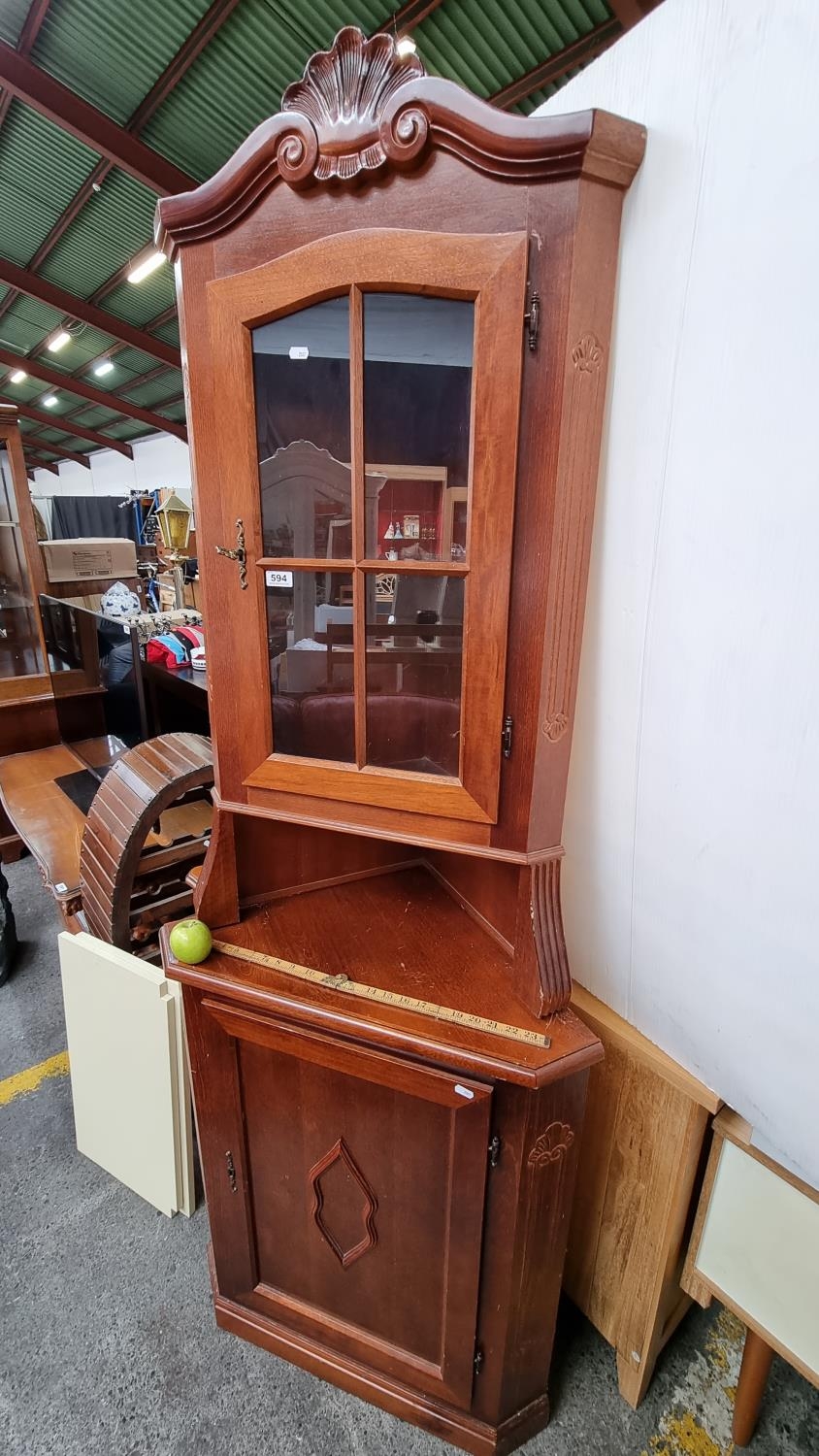 A Single Door Corner Cabinet with Bottom Storage and Scallop and Scroll Detail with Original Key.