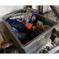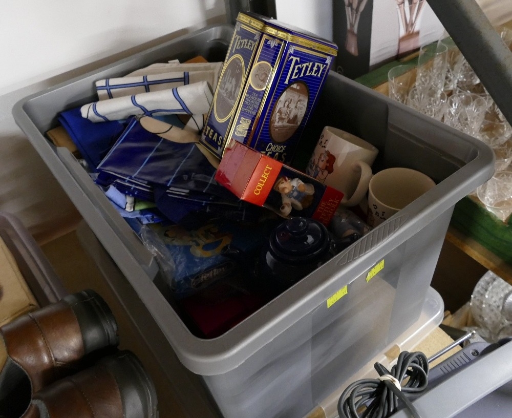 Box of Tetley commemorative ware, tea towels etc