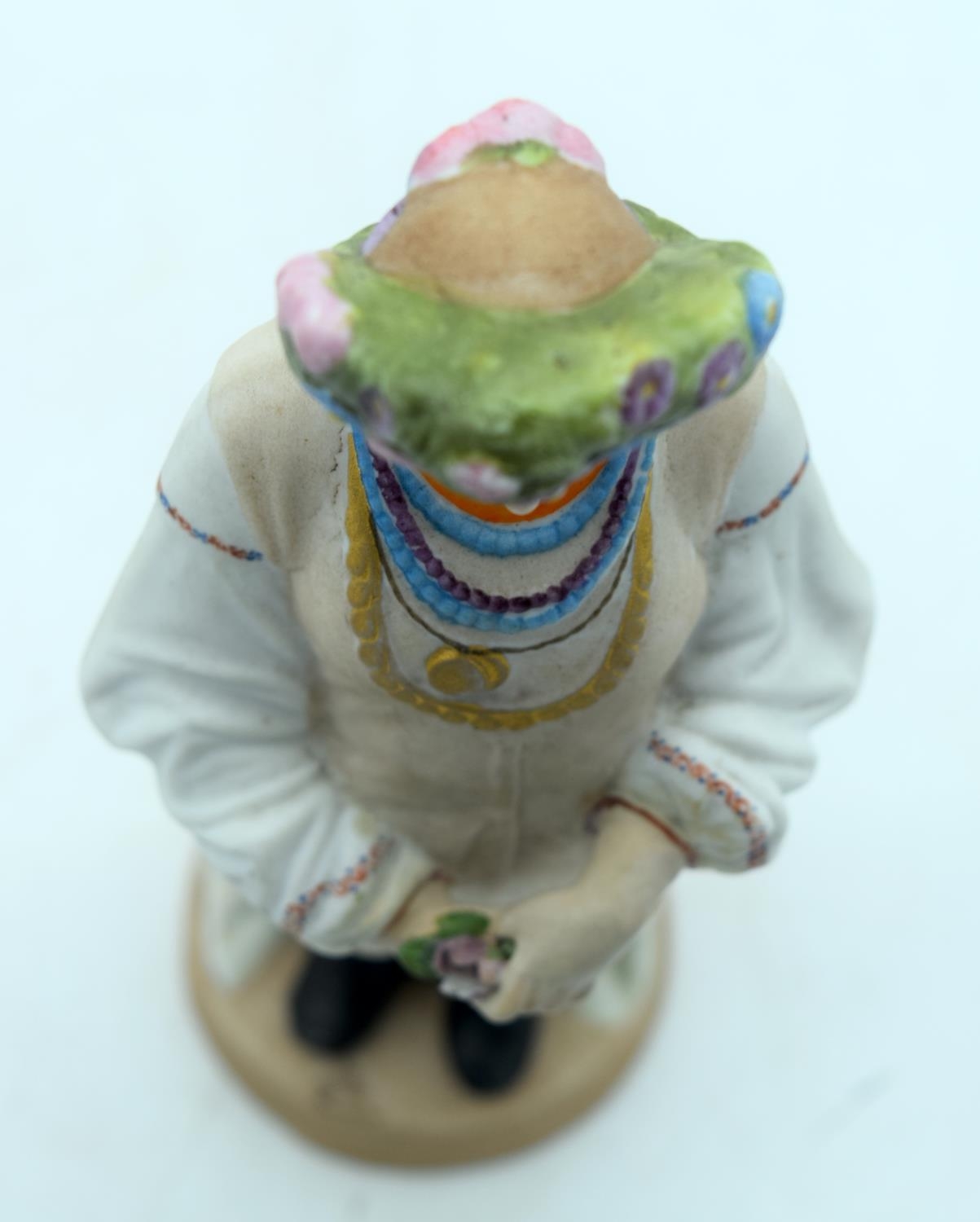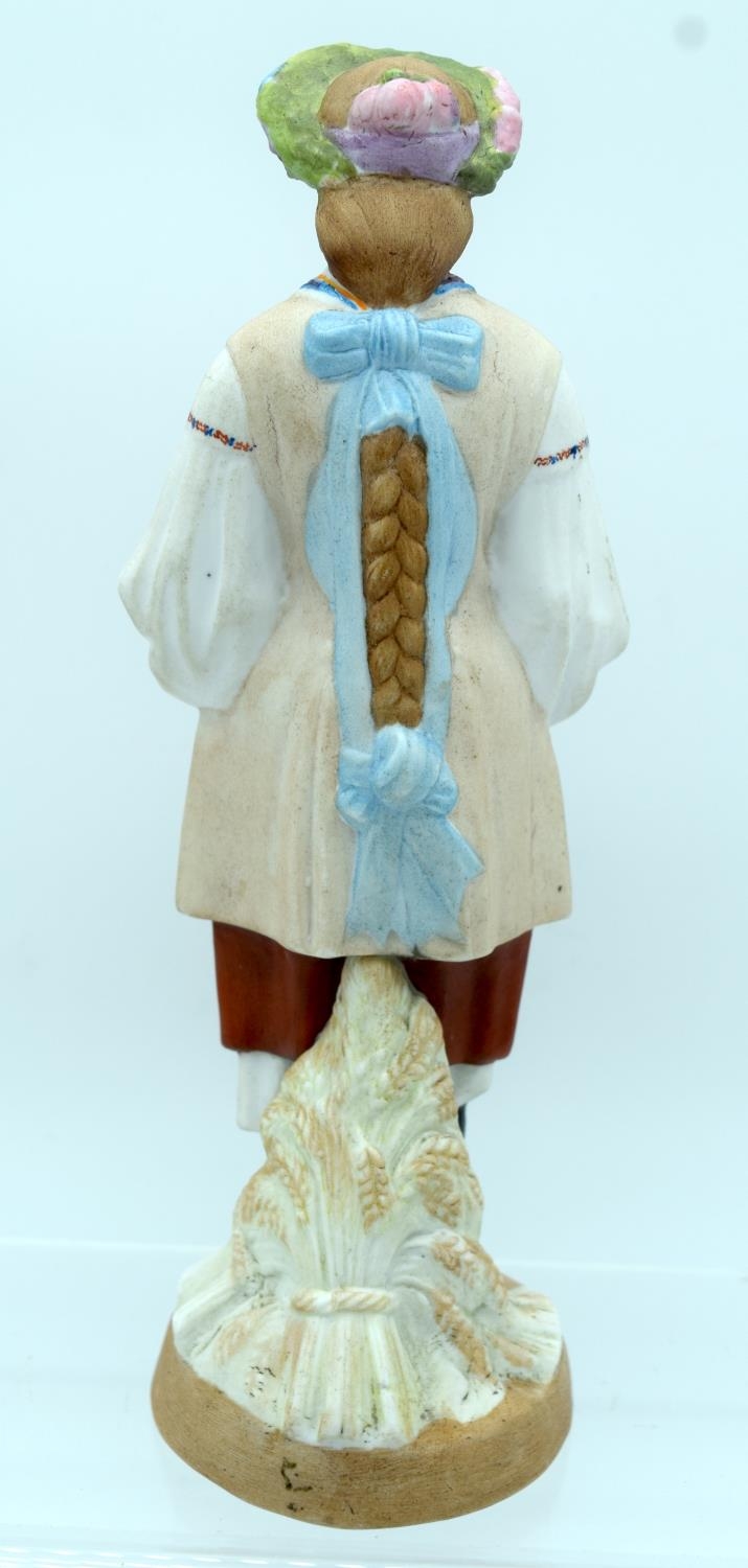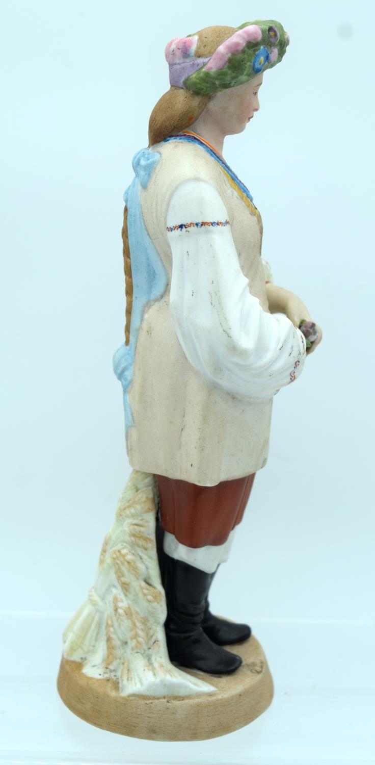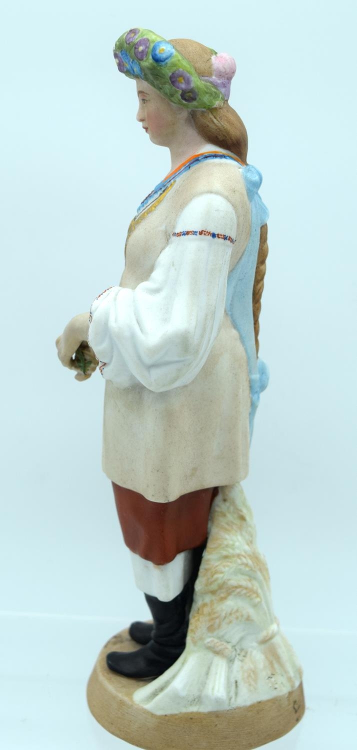 A 19TH CENTURY RUSSIAN BISQUE PORCELAIN FIGURE OF A STANDING FEMALE Gardner factory, modelled as a female wearing a floral wreath. 21 cm high.