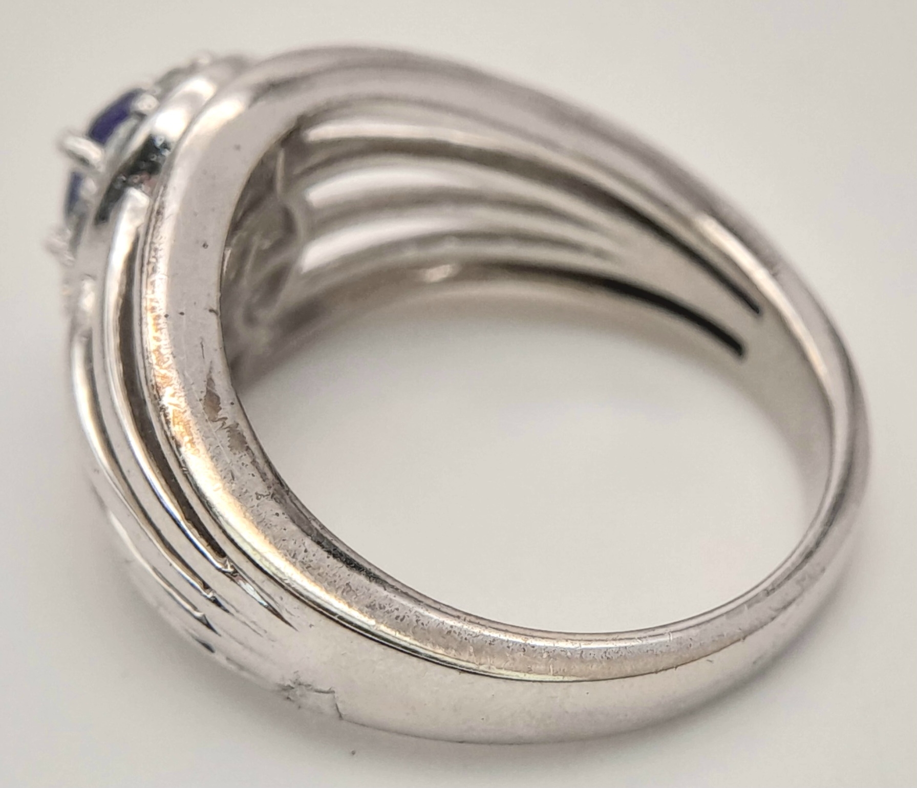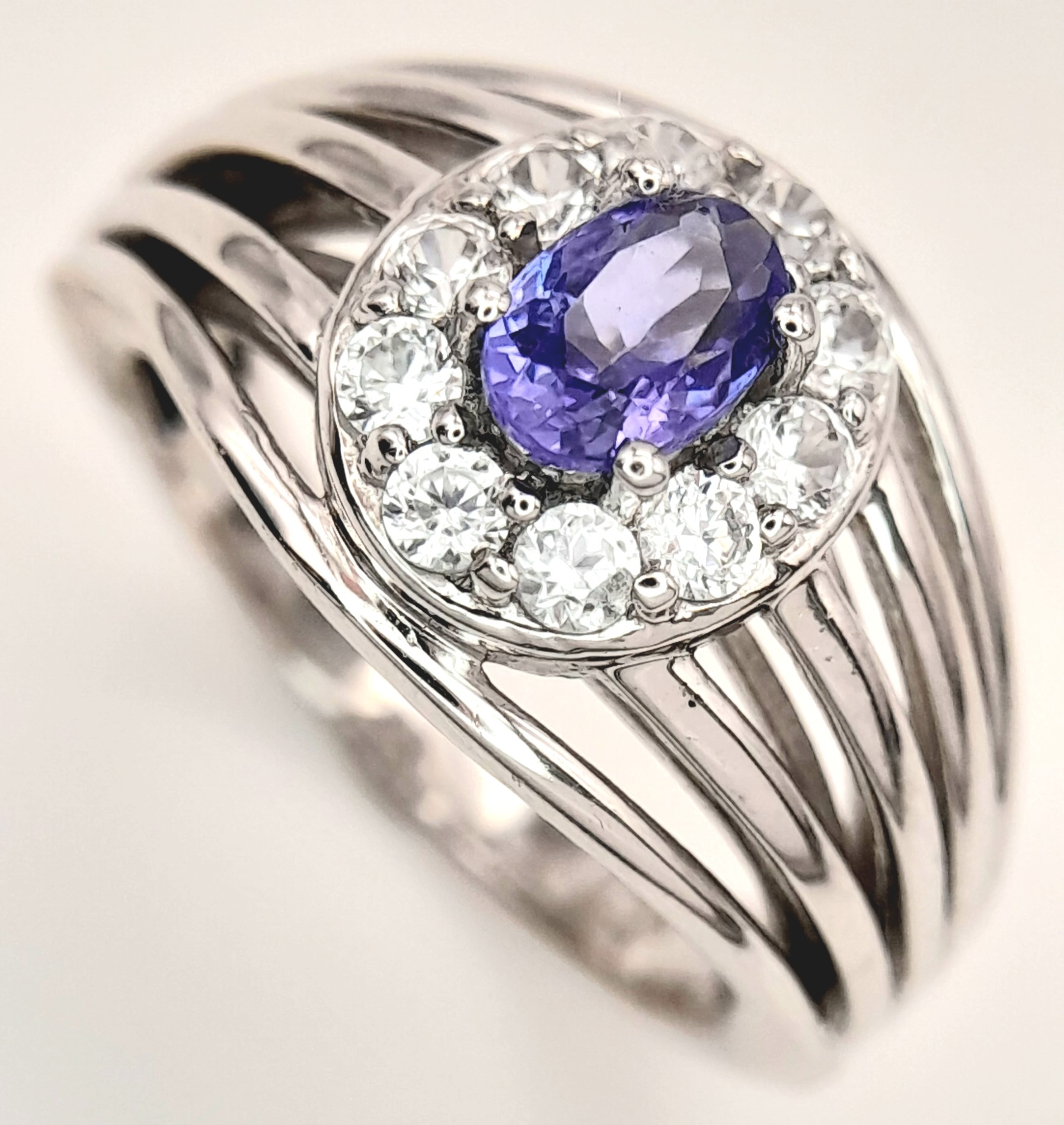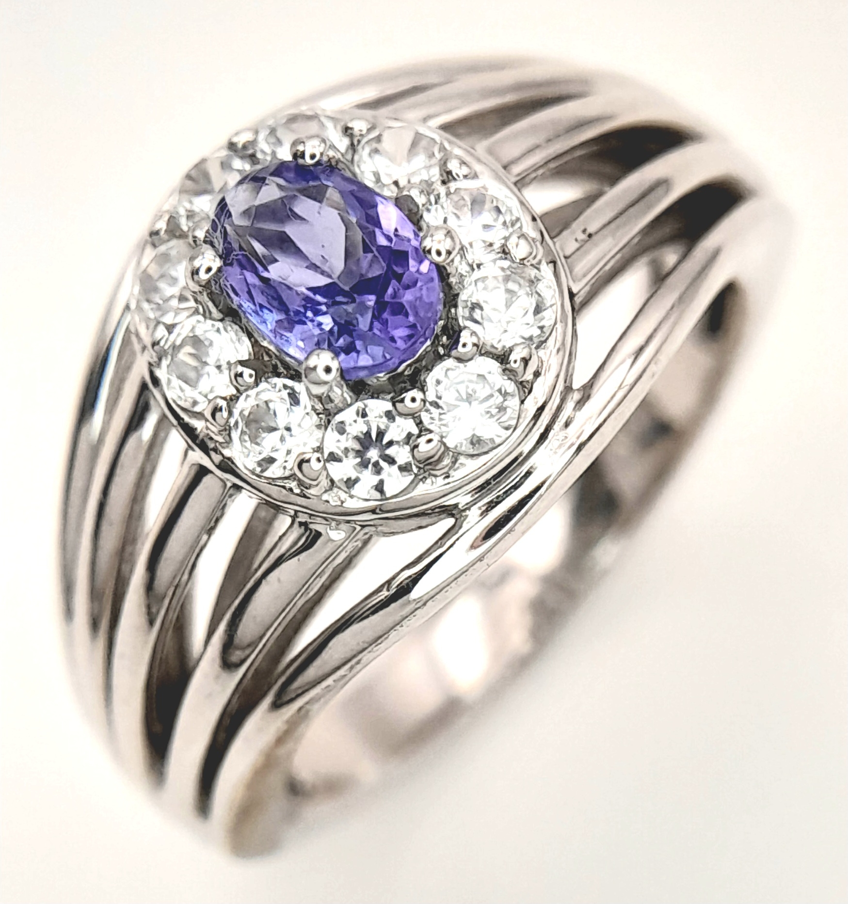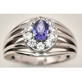 An Impressive Sterling Silver Tanzanite and White Topaz Ring Size P. The Ring is set with a 7mm Oval Cut Tanzanite with White Topaz surrounding with Open Work Shoulders. Gross Weight 5.83 Grams.