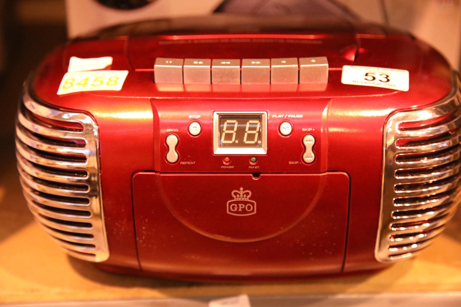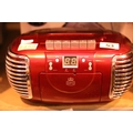 Red 3 in 1 FM/AM radio, CD and cassette player, boxed GPO PCD299. Not available for in-house P&P