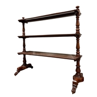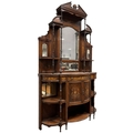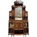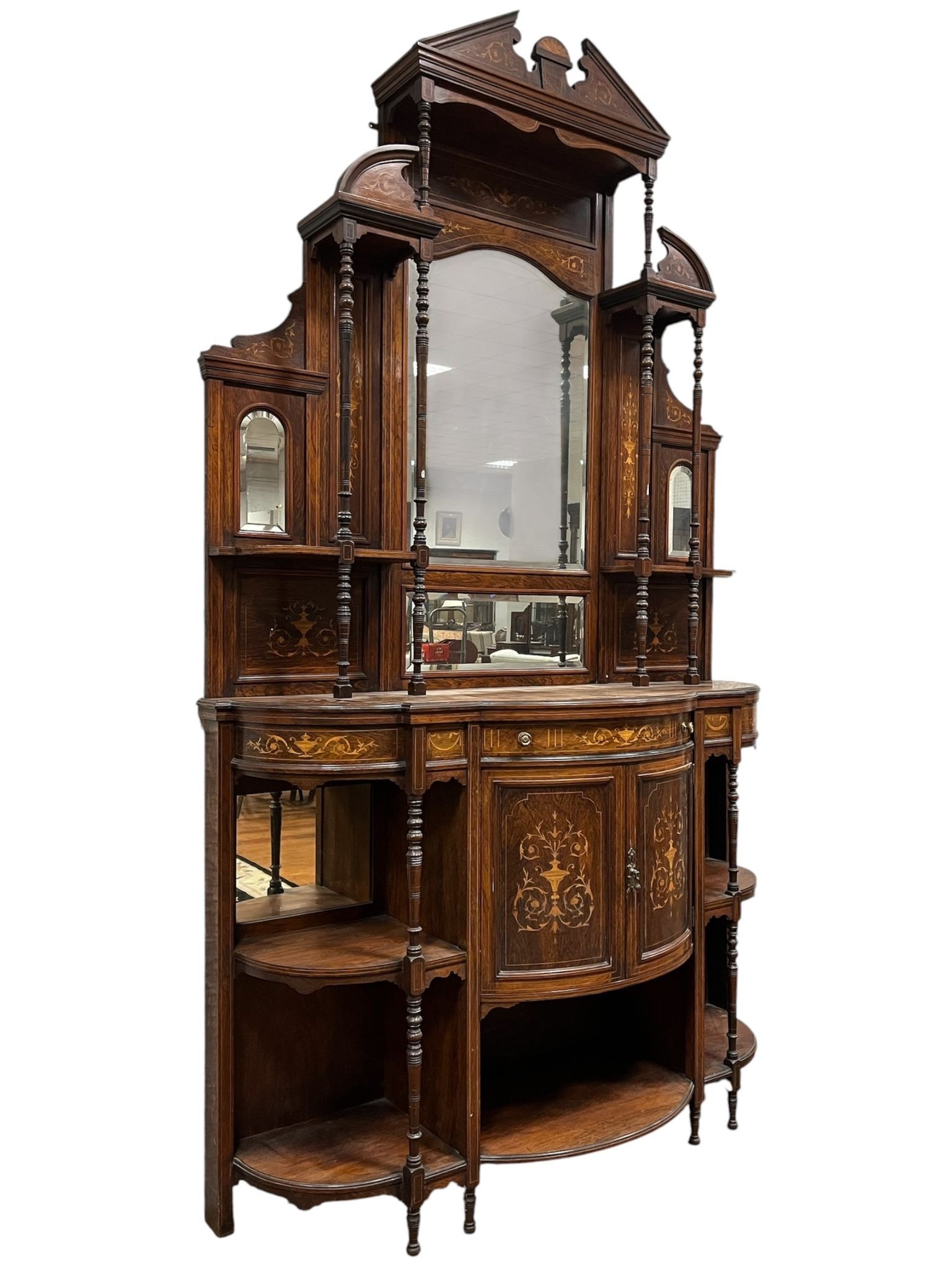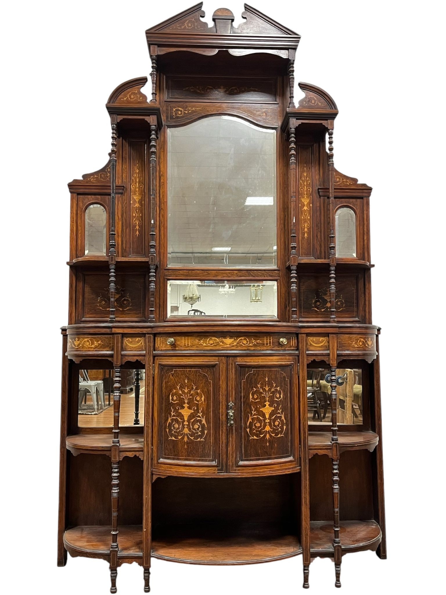 AN EDWARDIAN ROSEWOOD AND SATINWOOD INLAID SIDE CABINET the superstructure with architectural pediment above bevelled glass mirrors with open shelves the base on demi lune outline with frieze drawer and cupboards flanked by open compartments raised on ring turned supports 254cm (h) x 152cm (w) x 48cm (d)