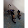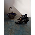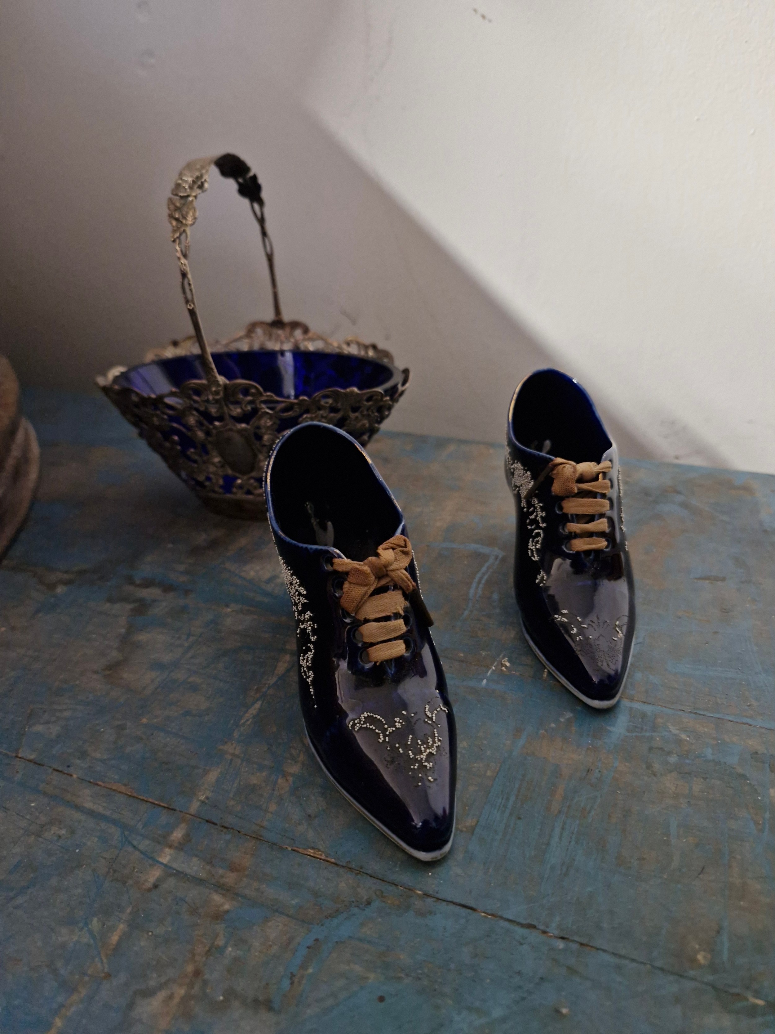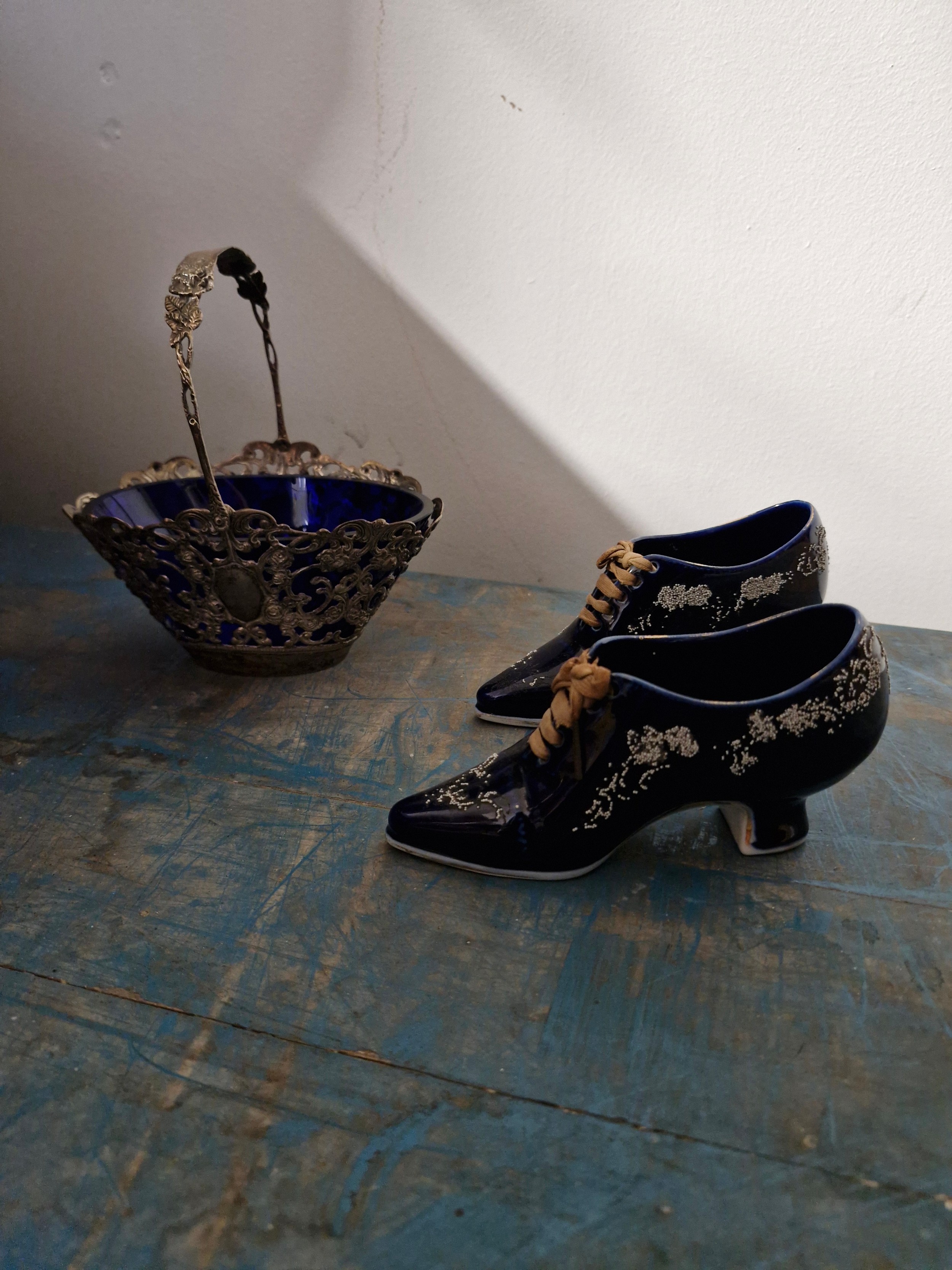 Two porcelain shoes and a silver plated basket with blue glass.