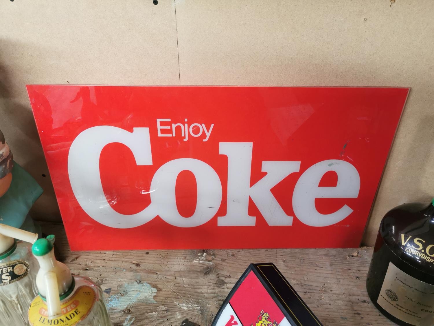 Enjoy Coke Perspex advertising sign {38 cm H x 66 cm W}.