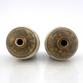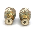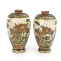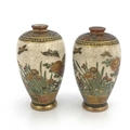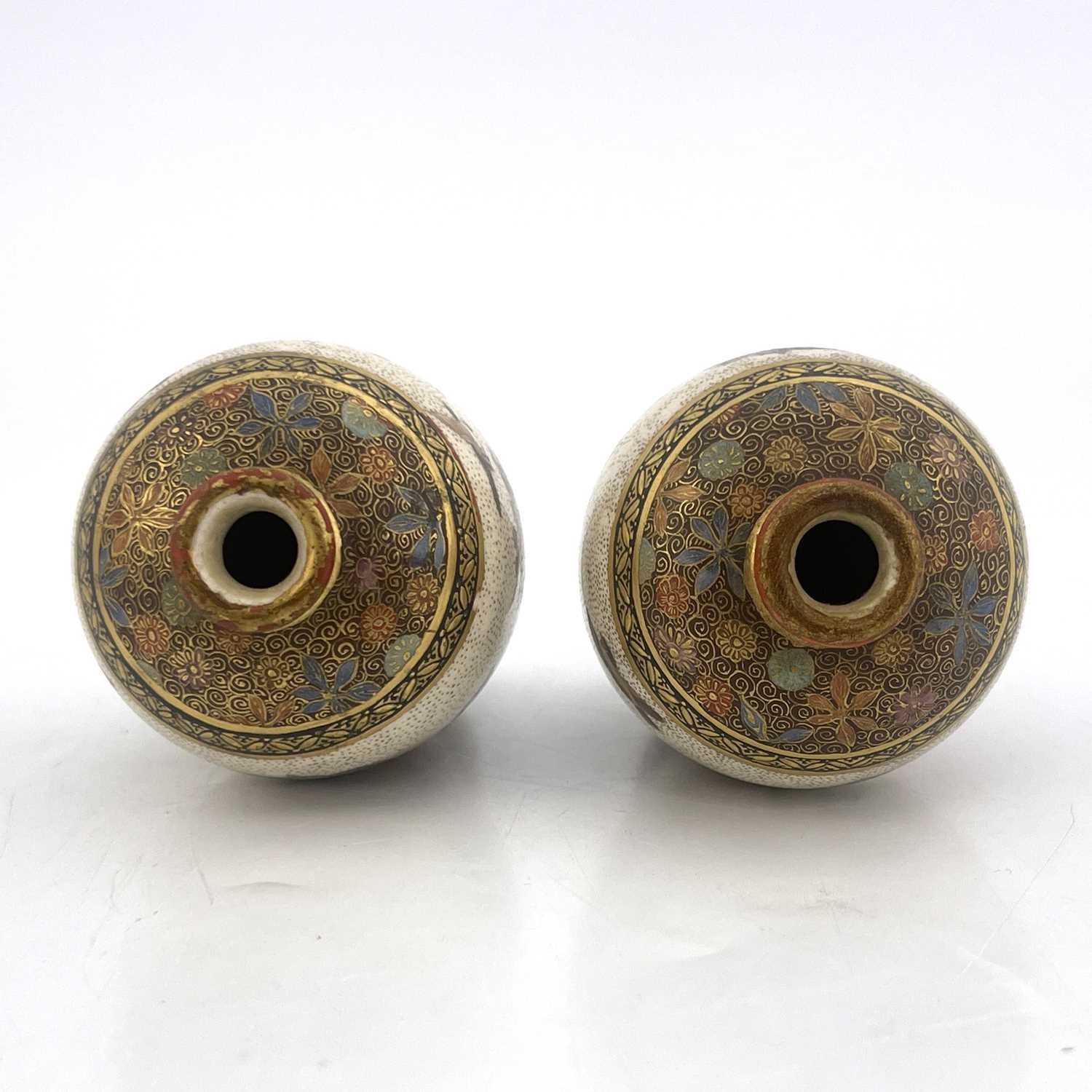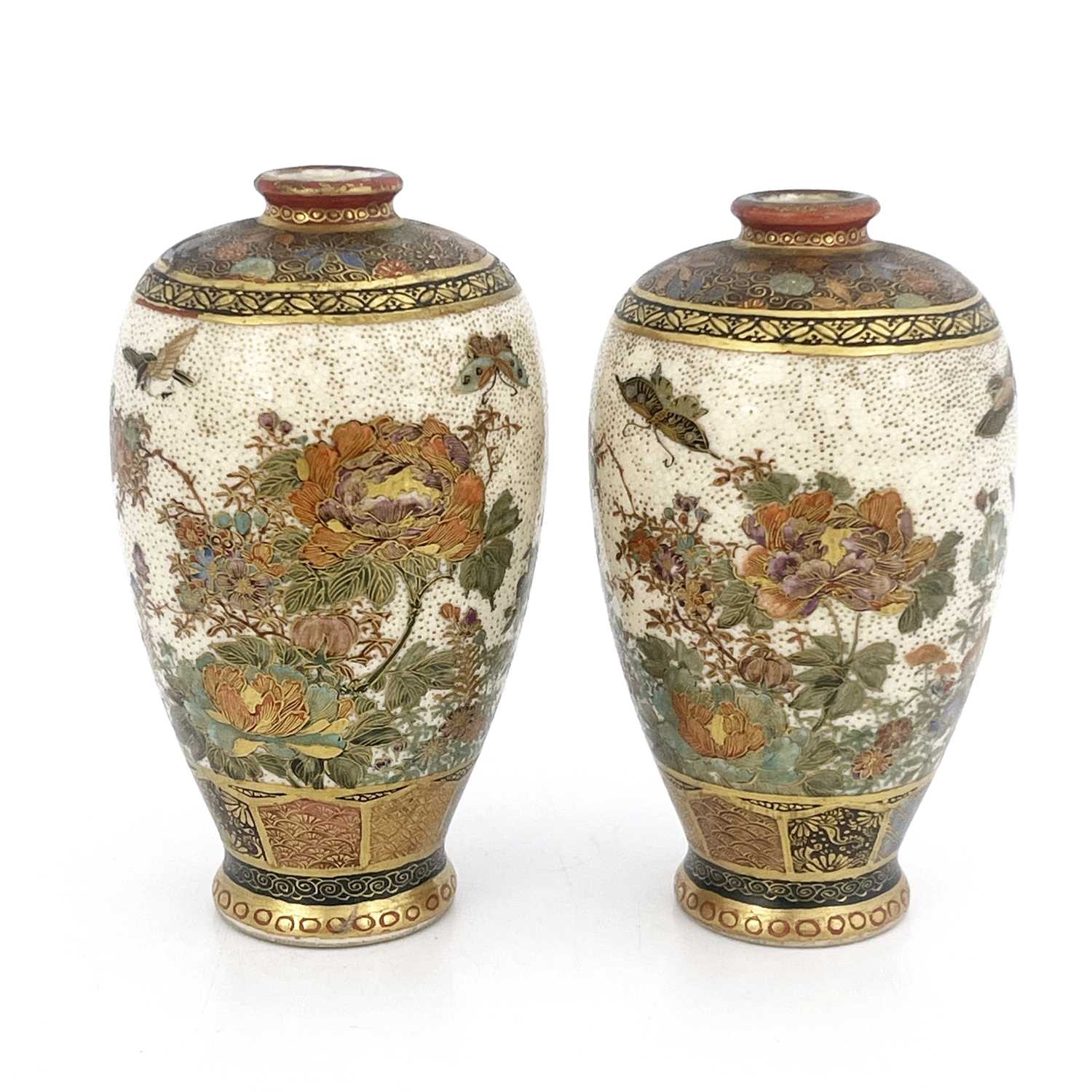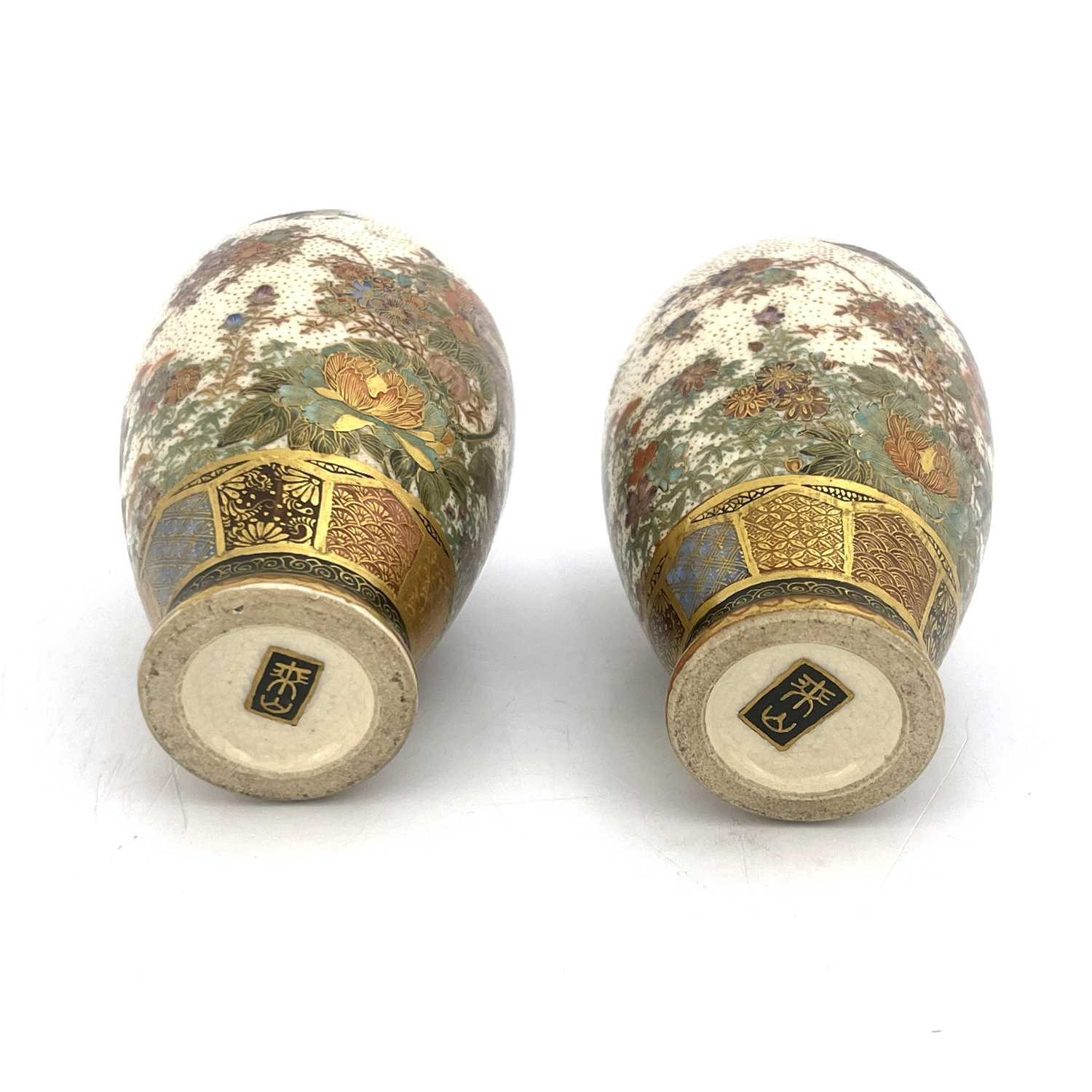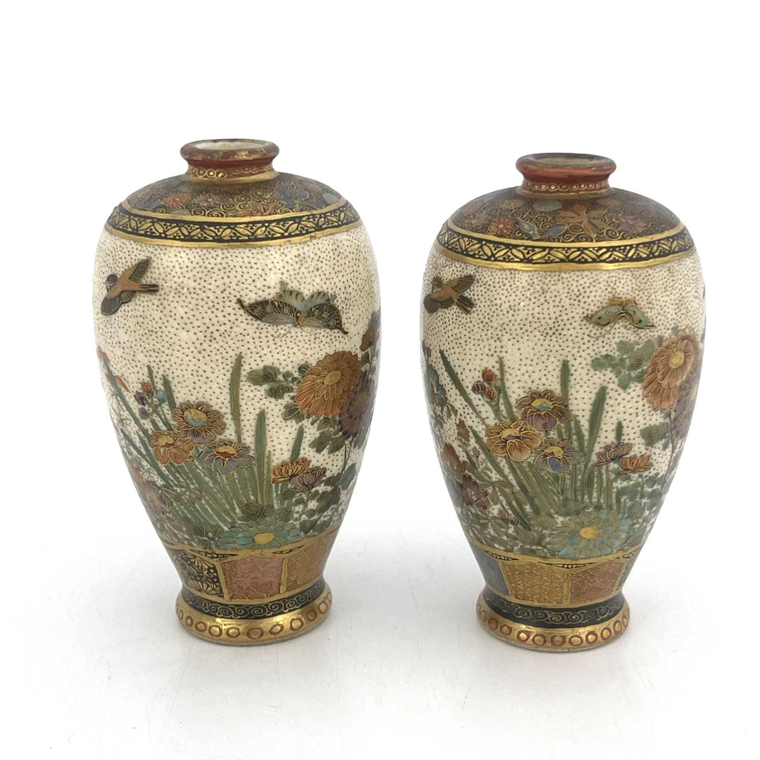 A pair of Japanese Satsuma small vases, 'zan' mark, Meiji, shouldered form, painted in the round with birds and insects in flight over wildflowers including peonies, chrysanthemums, irises and prunus,above a border of geometric lappets, the shoulder with rosettes on a foliate scroll ground, gilt marks, 9cm high (2)