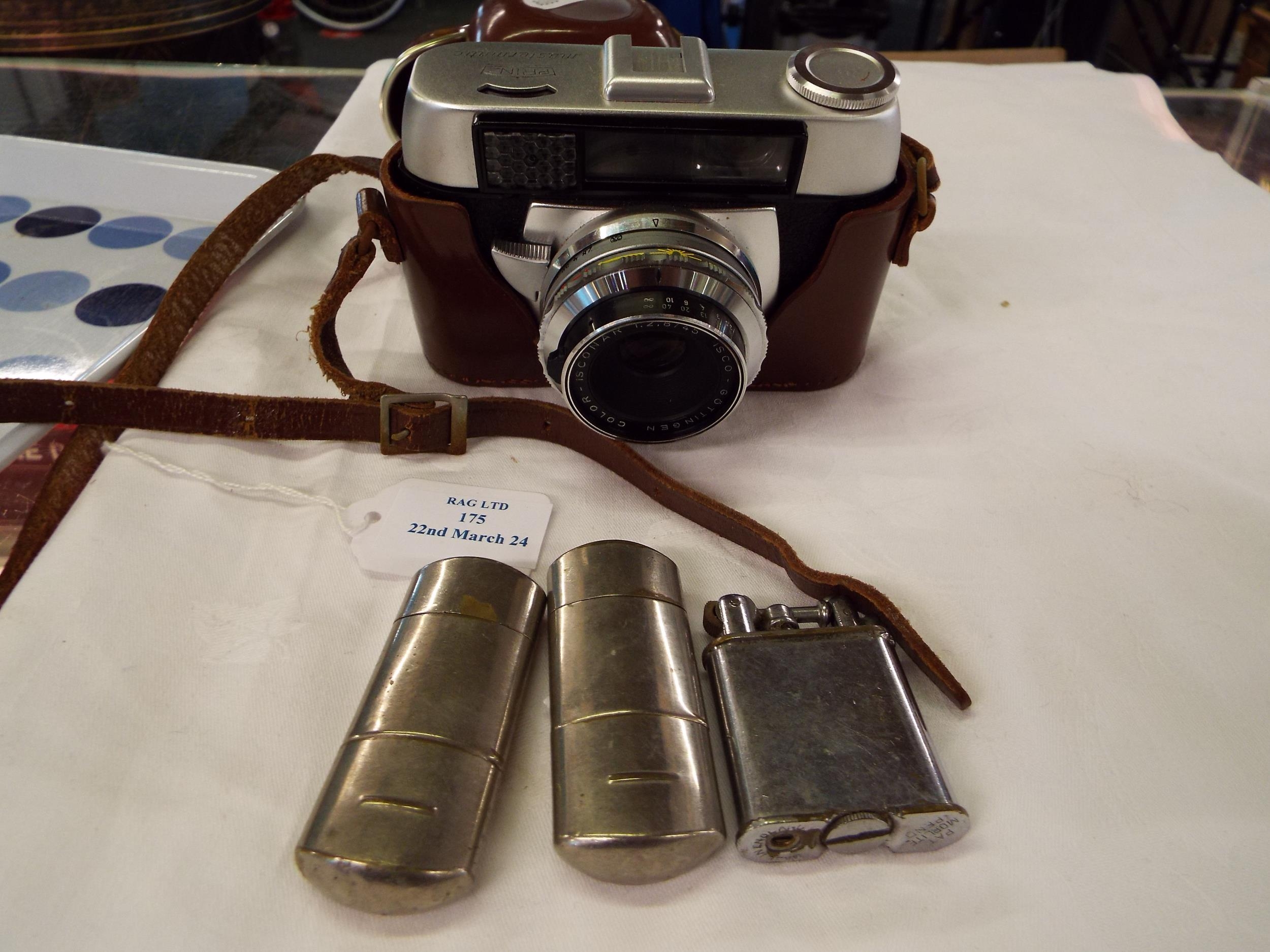 A vintage Prinz Mastermatic camera and three vintage lighters
