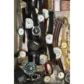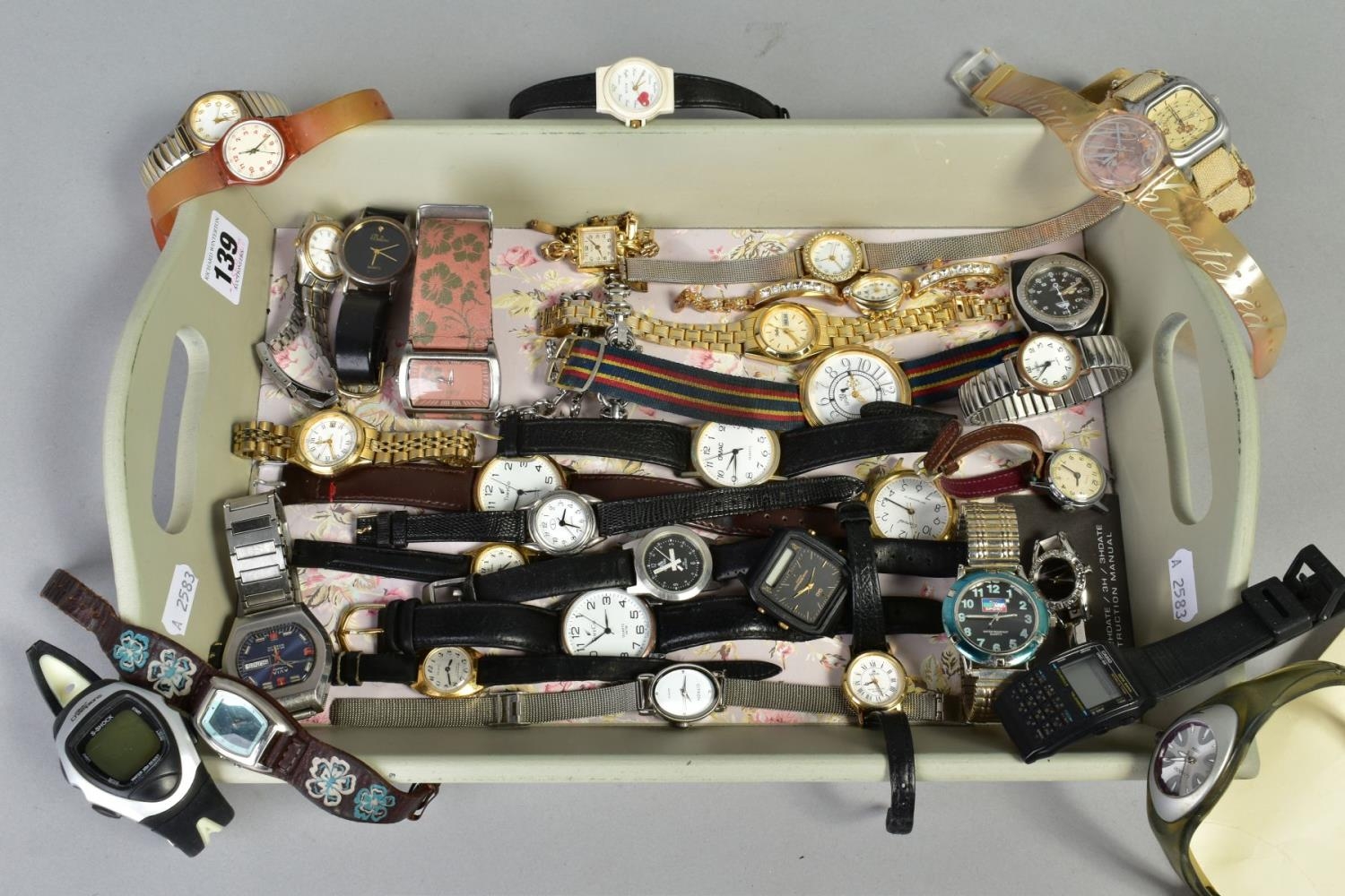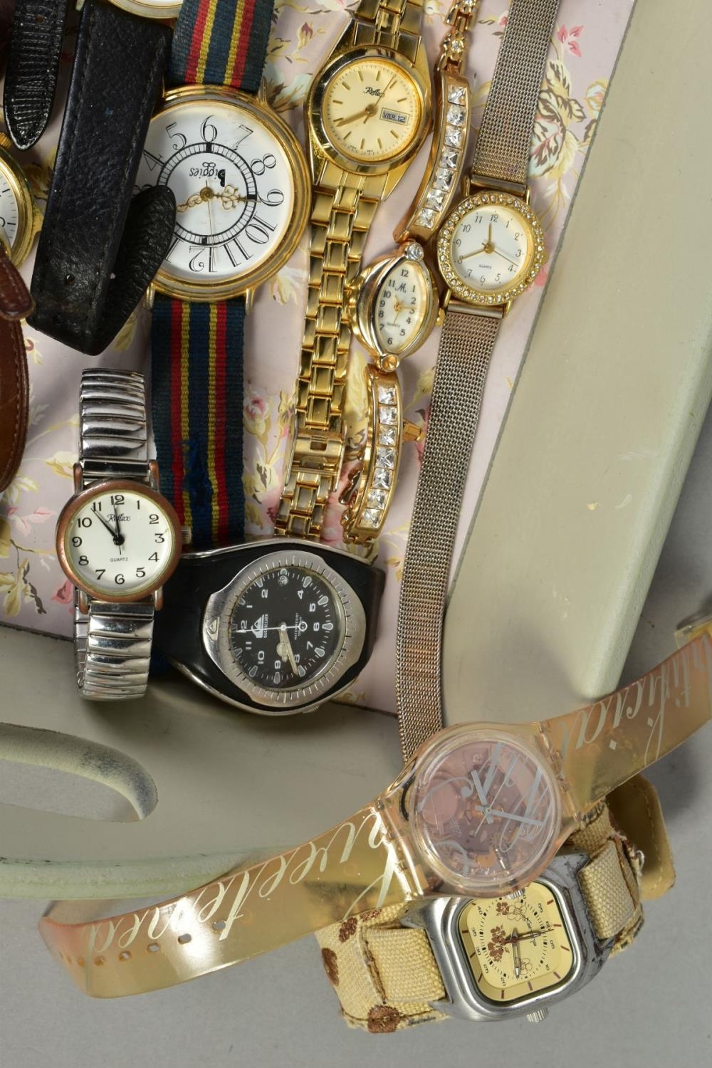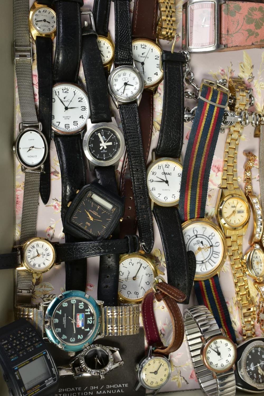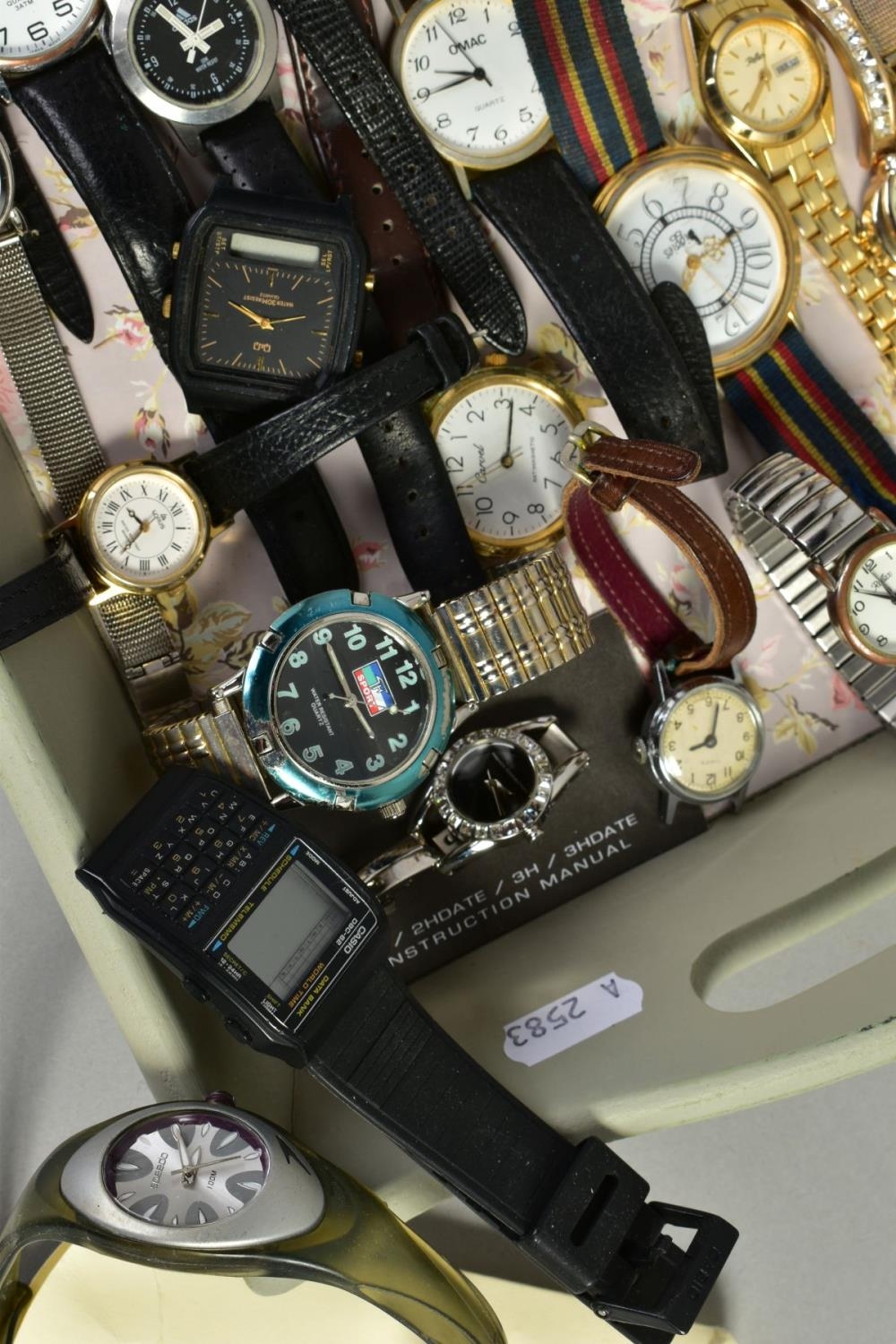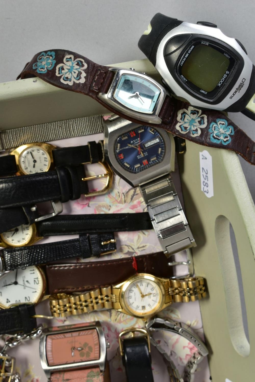 A COLLECTION OF WRISTWATCHES, to include an Avia-matic 25 jewels incabloc wristwatch, featuring a blue day date dial, red markers at six, nine and twelve and with a horizontal carry case, fitted with an expandable strap(crack to the glass), also included are Pulsar, Rotary, Citizen, Lorus and a snumber of electronic wristwatches