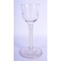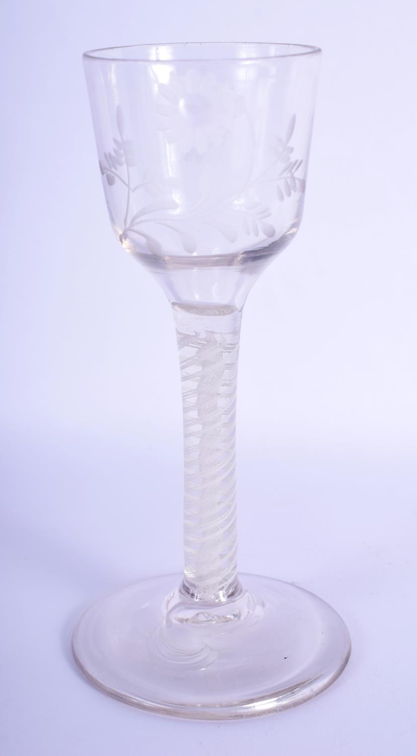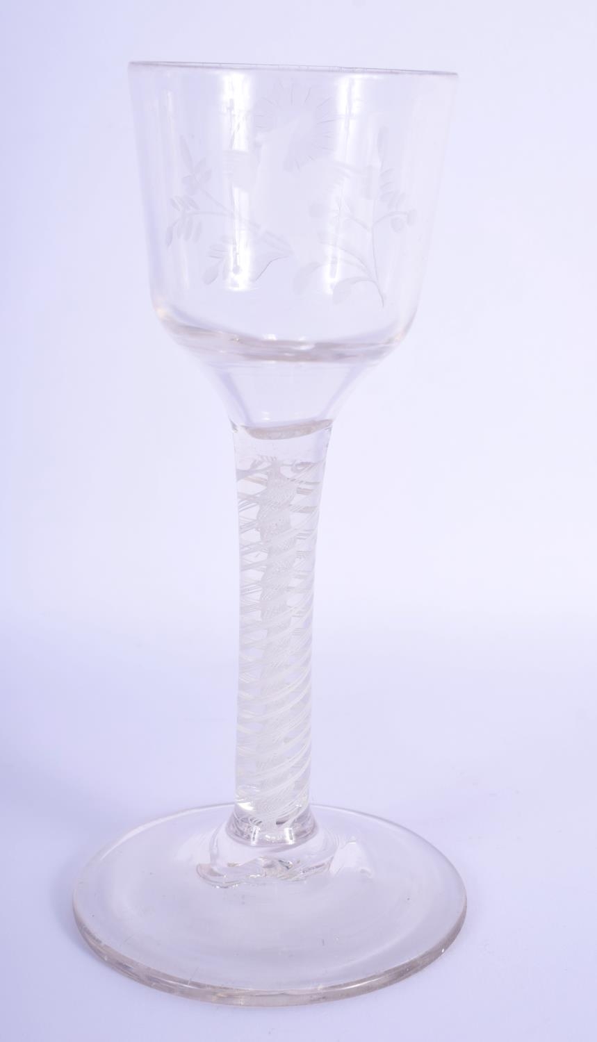 A GEORGE III GLASS with engraved bowl and spiral twist stem. 14.5 cm high.