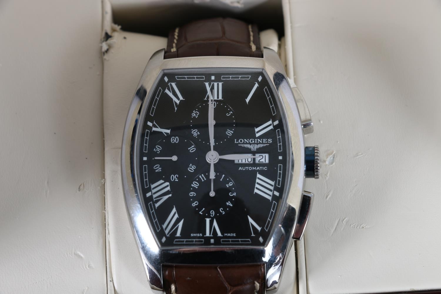 Longines Evidenza Chronograph Calendar automatic stainless steel gentleman's wristwatch with brown leather strap, L2.701.4 33405907.