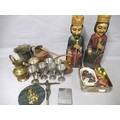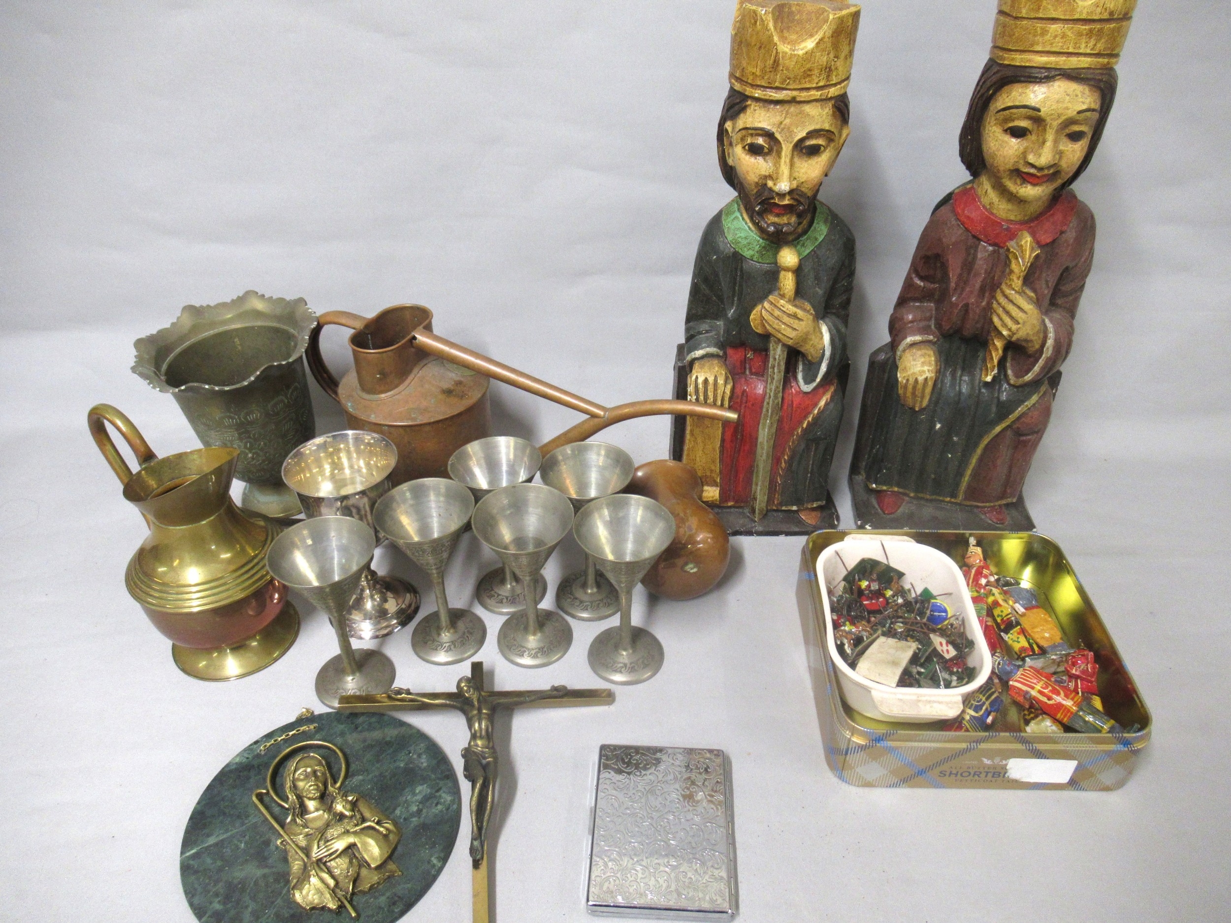 Pair of carved and painted wooden figures, King and Queen, quantity of Indian figures, quantity of miniature diecast metal figures, quantity of metalware and sundries