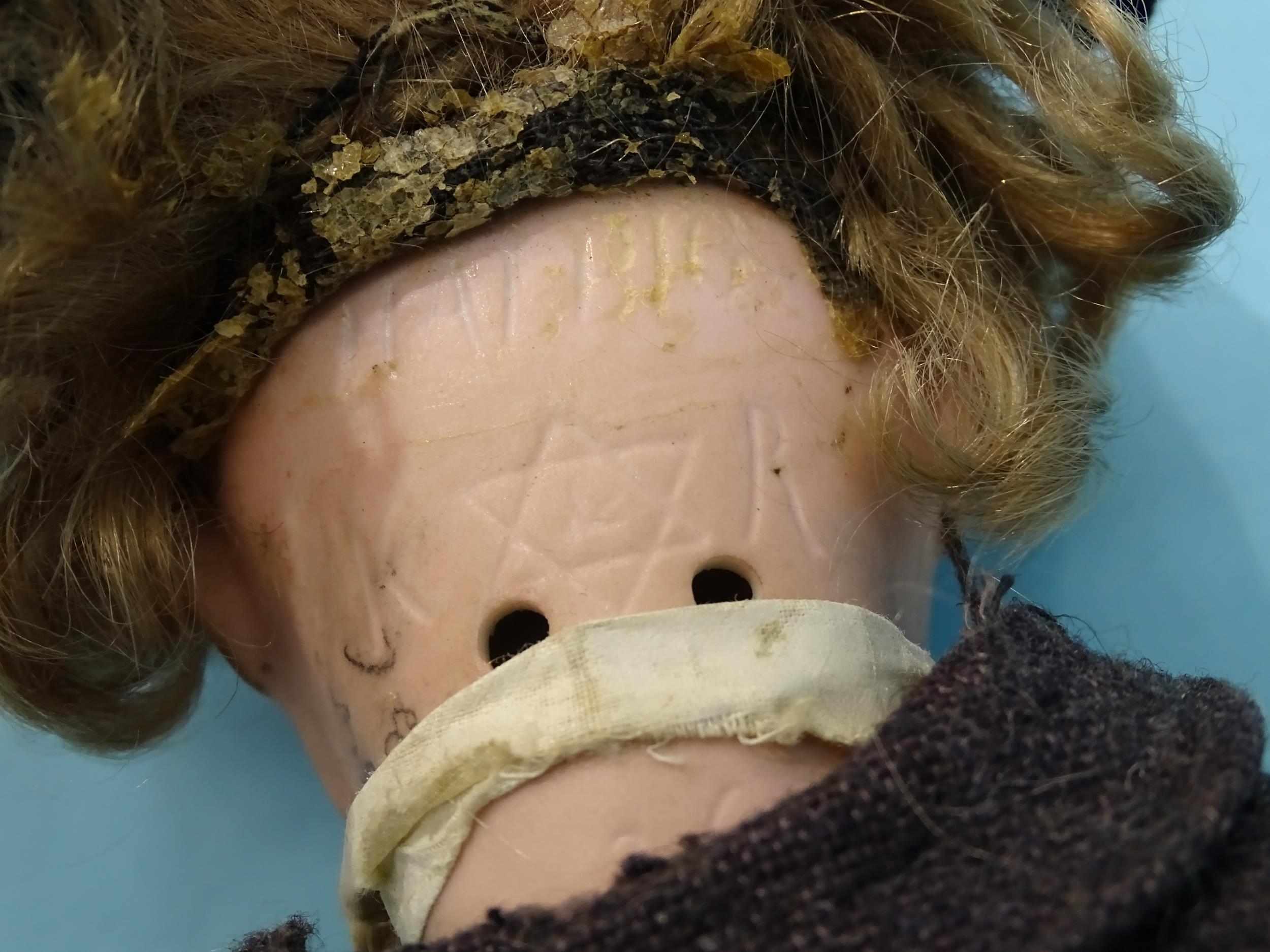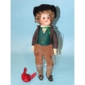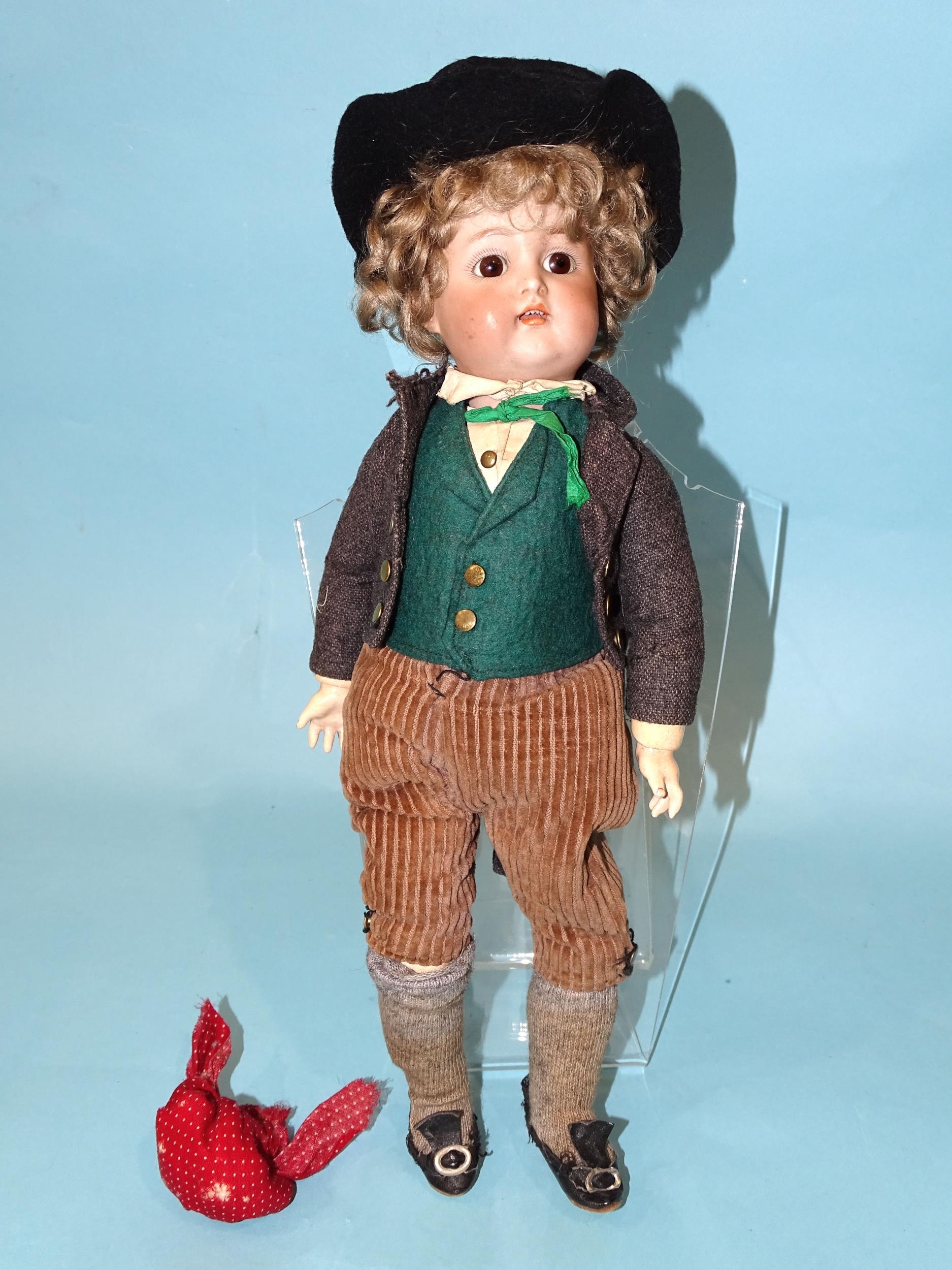 A Simon Halbig/Kammer & Reinhardt 36 bisque head boy doll with sleeping brown eyes, open mouth with upper teeth, brown curly mohair wig and composition and wood jointed body, dressed in national costume of felt hat, cotton shirt, felt waistcoat, wool tailcoat, corduroy breeks, knitted socks and Rexine shoes, the head marked Halbig K[*&]R 36, 35cm approximately.