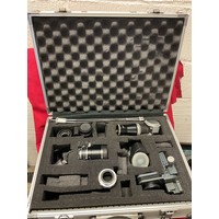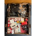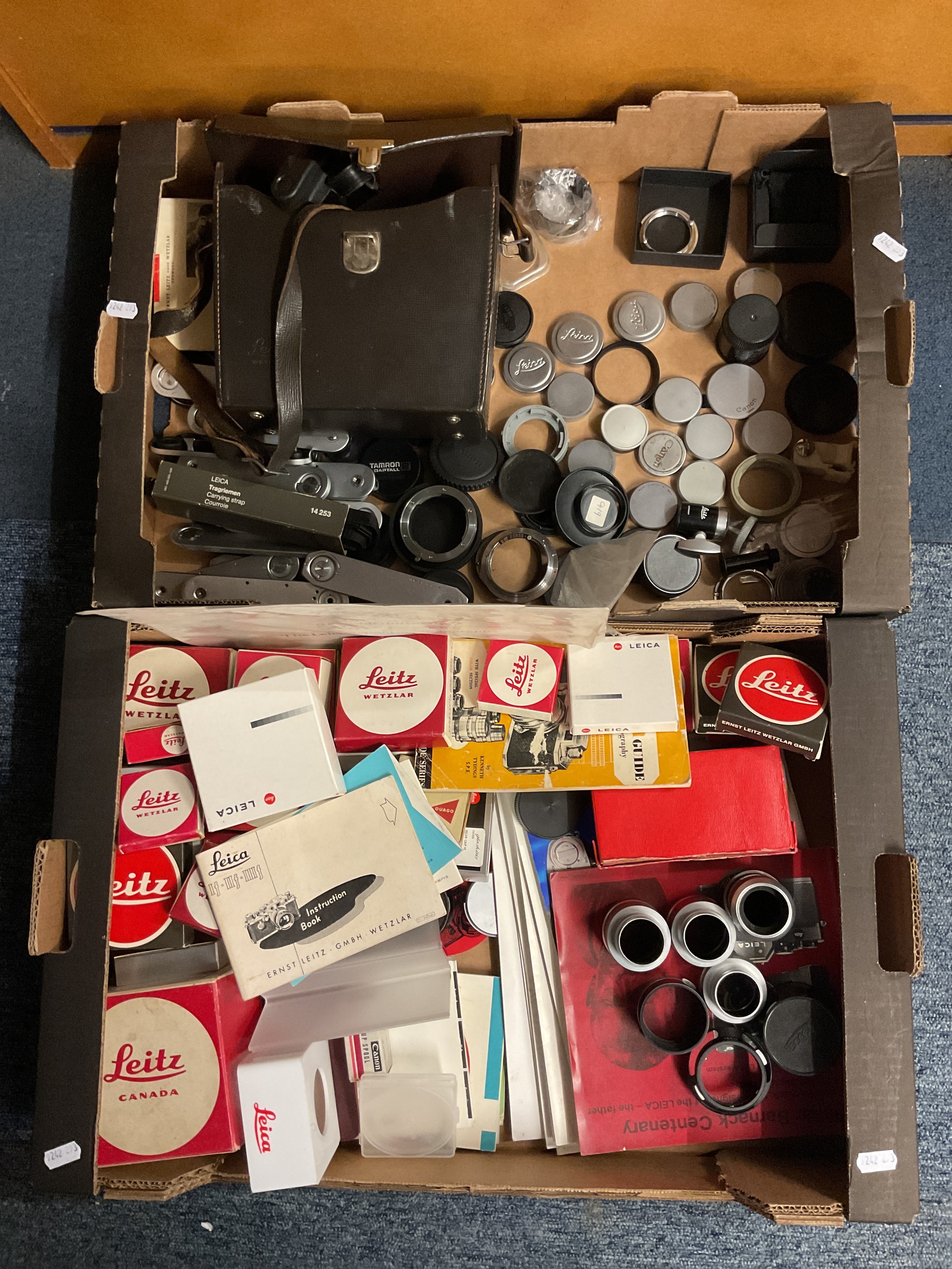 A large selection of Leica and Canon accessories to include empty Leitz boxes, lens caps, base plate, lens adaptor, Leitz ball and socket tripod head, booklets etc in two boxes