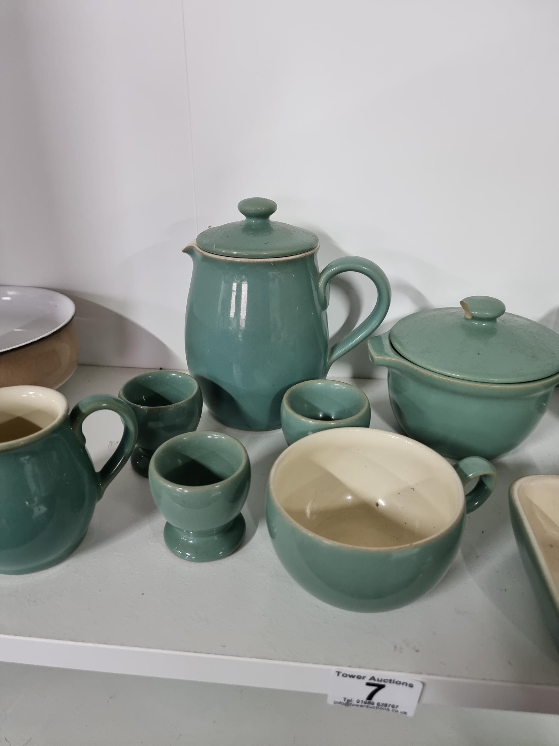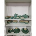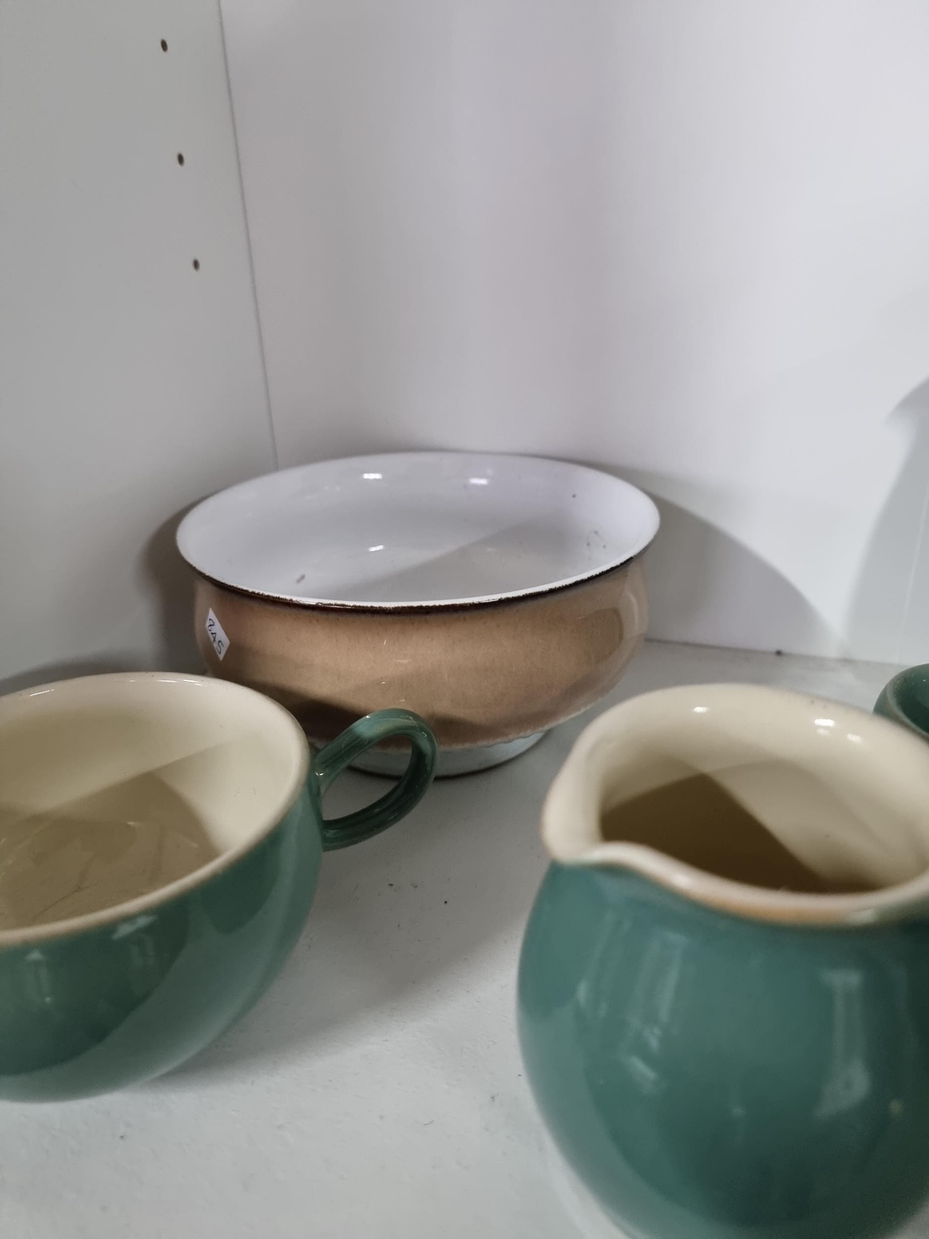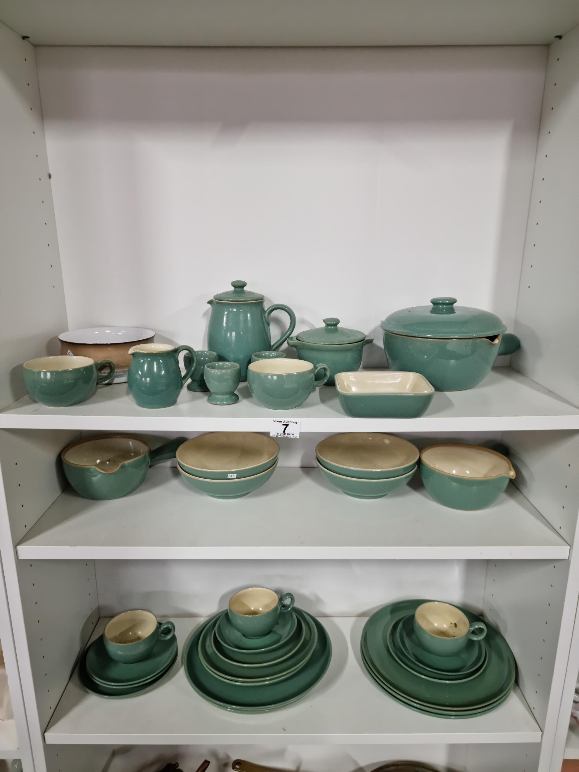 3 shelves containing a large quantity of green Denby crockery including 33 pieces in total including 4 trios, 5 dinner plates, soup bowls, egg cups, butter dishes, etc along with a Denby beige coloured soup bowl. The lidded butter dish has a chip to the handle, otherwise all in good order. Largest piece has a diameter of 29cm.