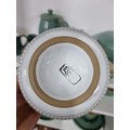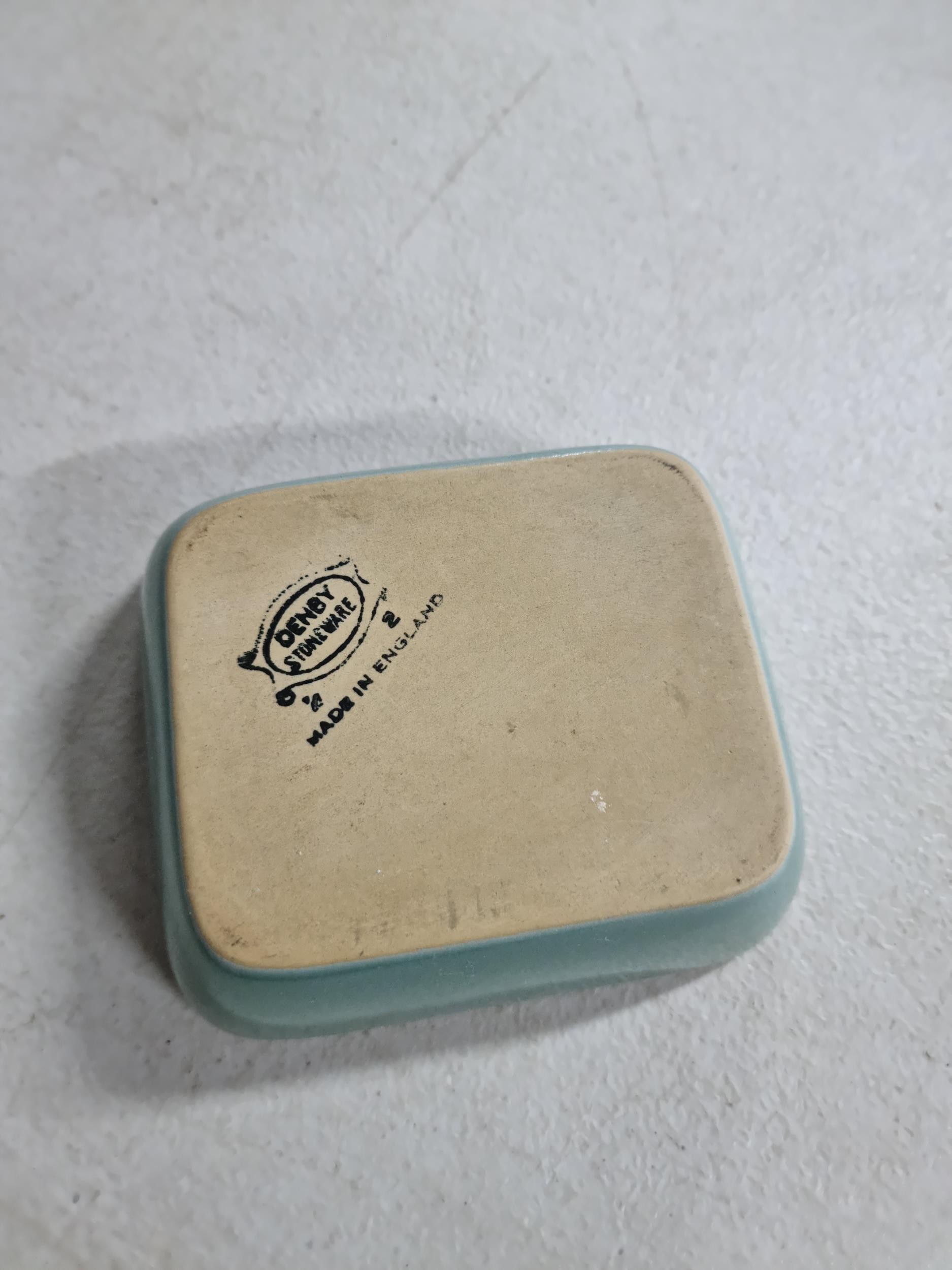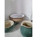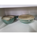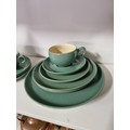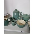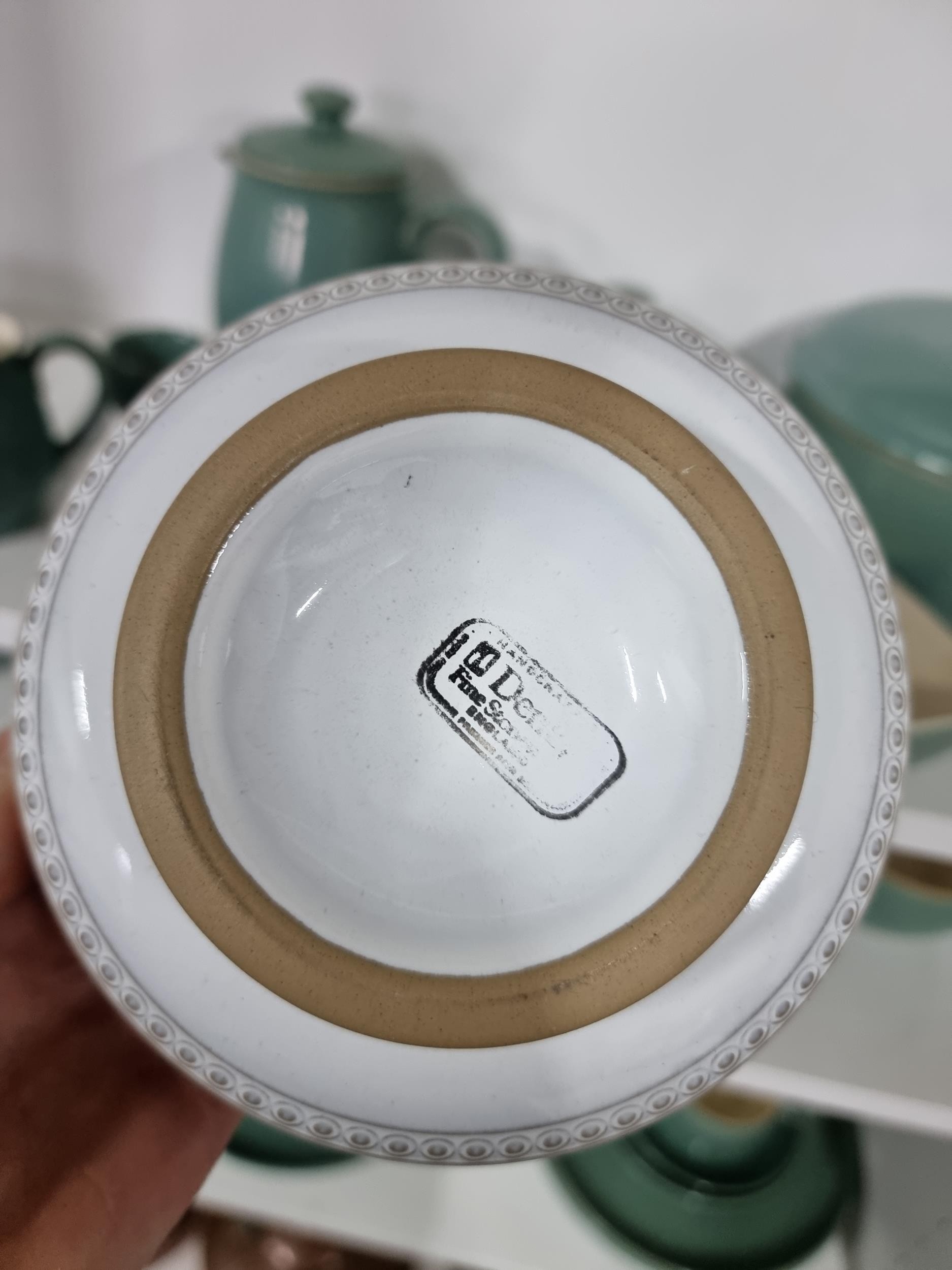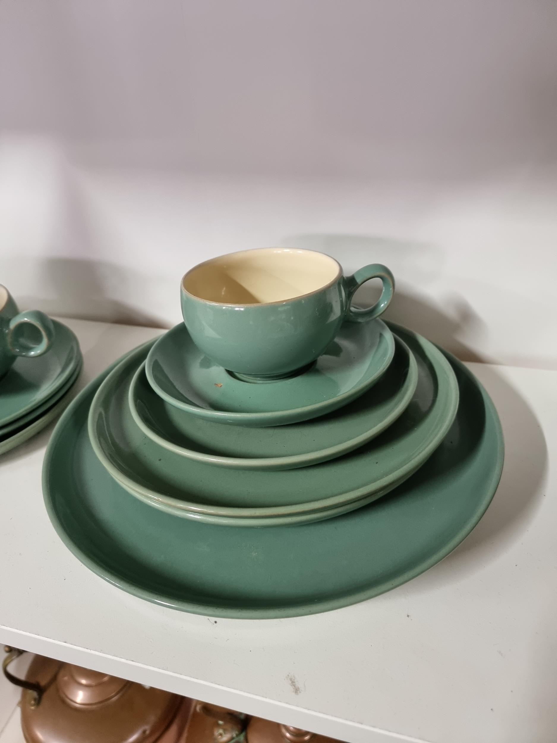 3 shelves containing a large quantity of green Denby crockery including 33 pieces in total including 4 trios, 5 dinner plates, soup bowls, egg cups, butter dishes, etc along with a Denby beige coloured soup bowl. The lidded butter dish has a chip to the handle, otherwise all in good order. Largest piece has a diameter of 29cm.