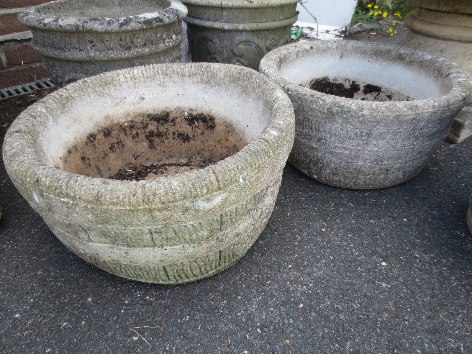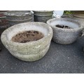A pair of round stonecrete planters, approximately 16" in diameter and 9" tall - one has a slight crack to rim. Shipping is not available on this item - collection or local delivery in our van only.