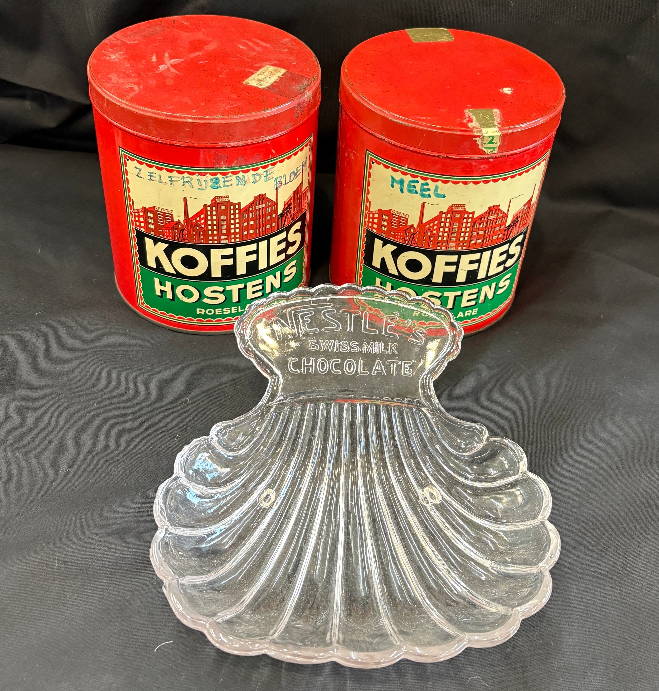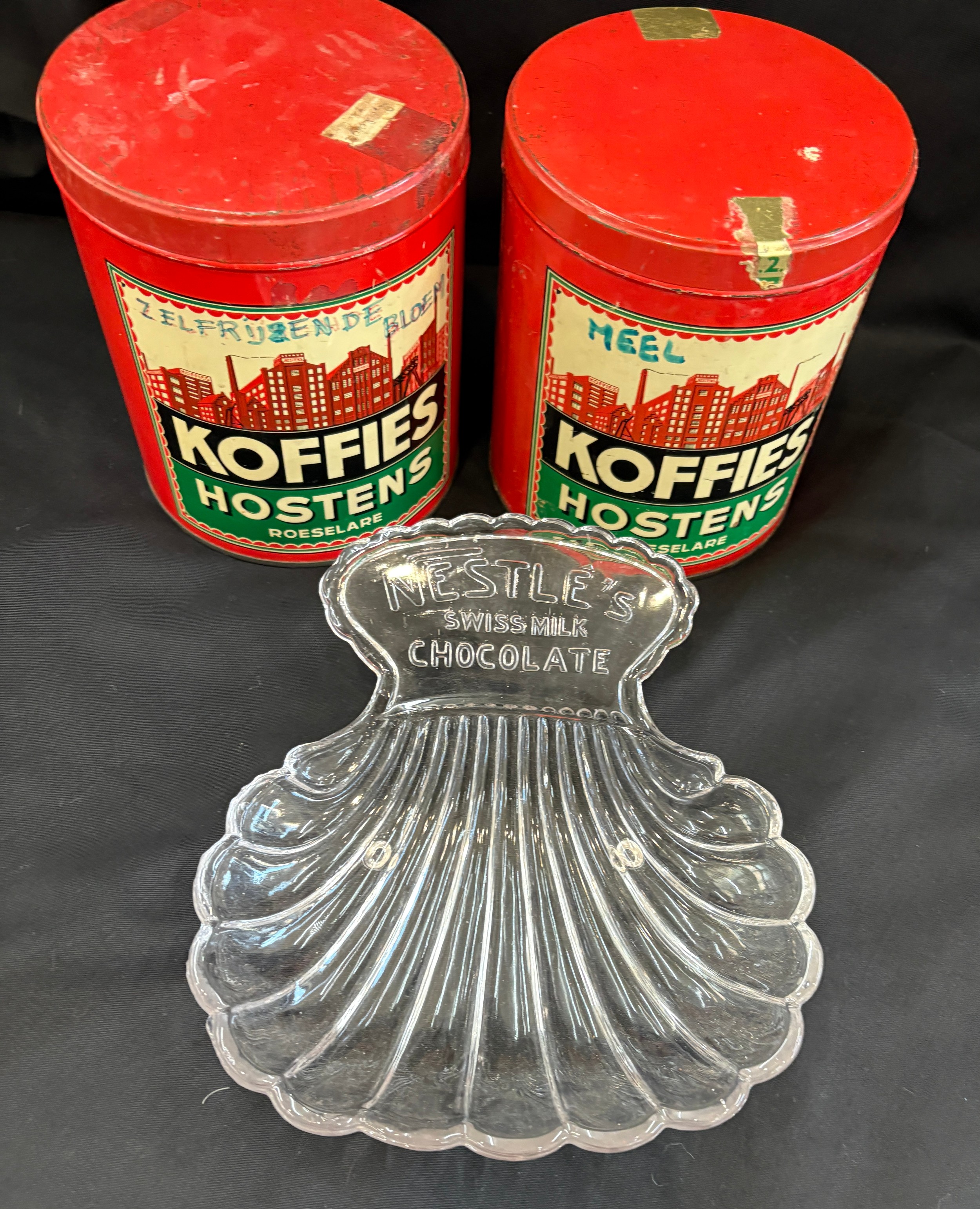 Three vintage advertising pieces to Koffies Hostens lidded tins and a Nestle dish