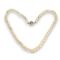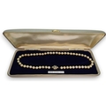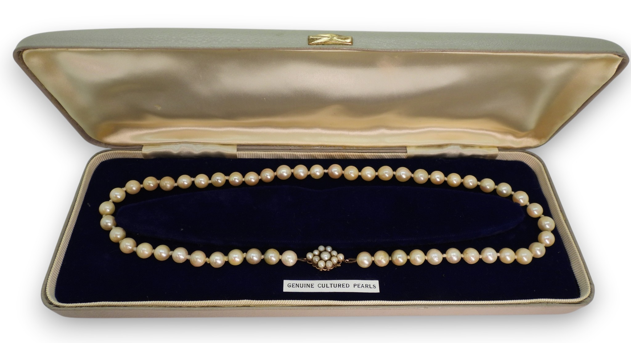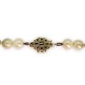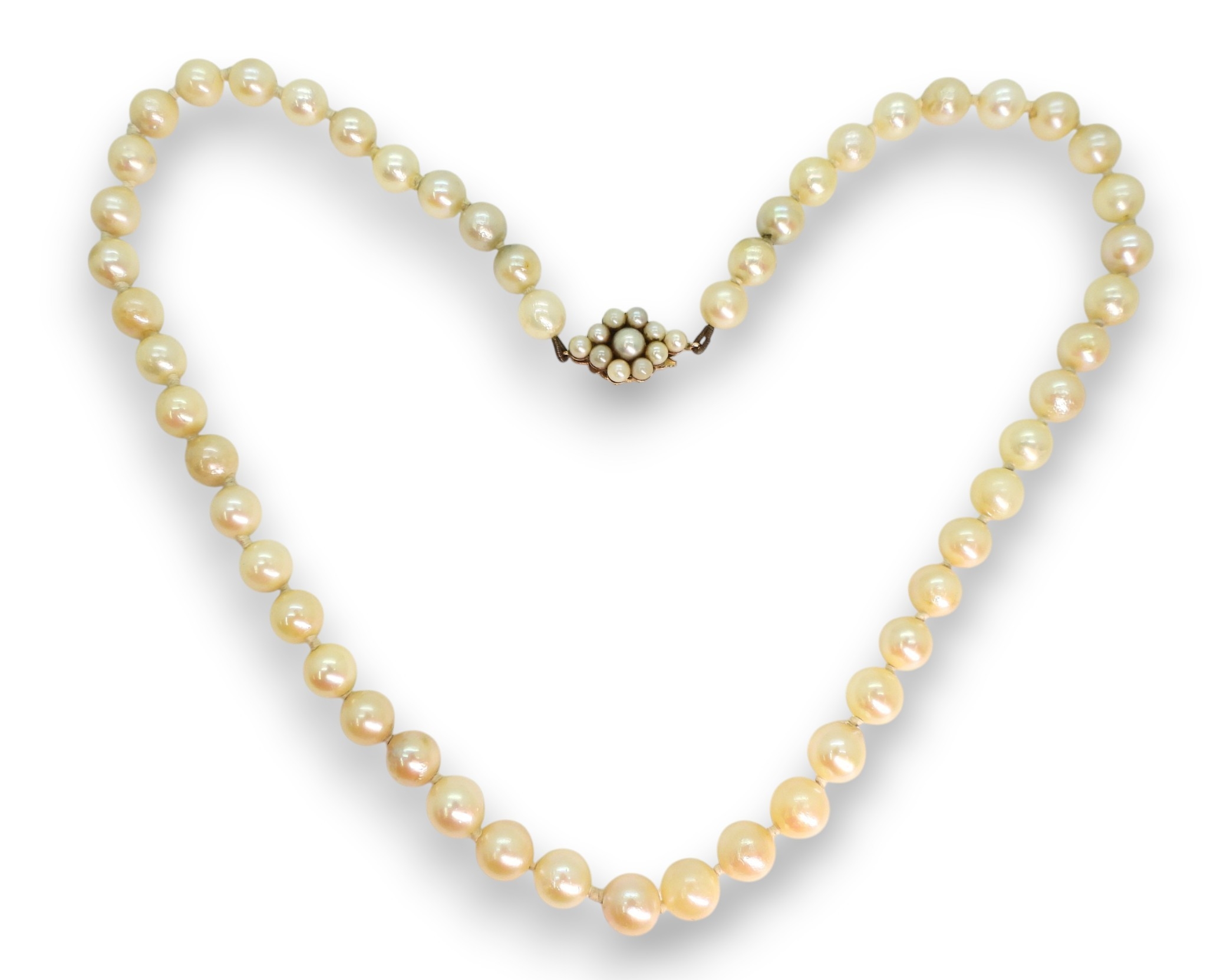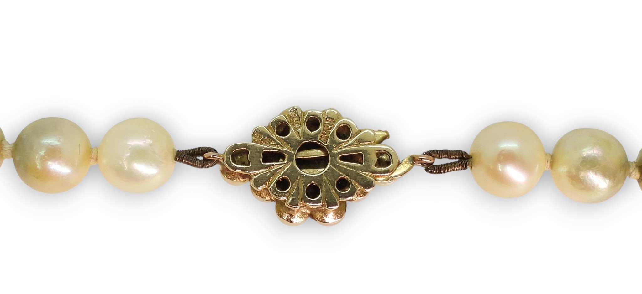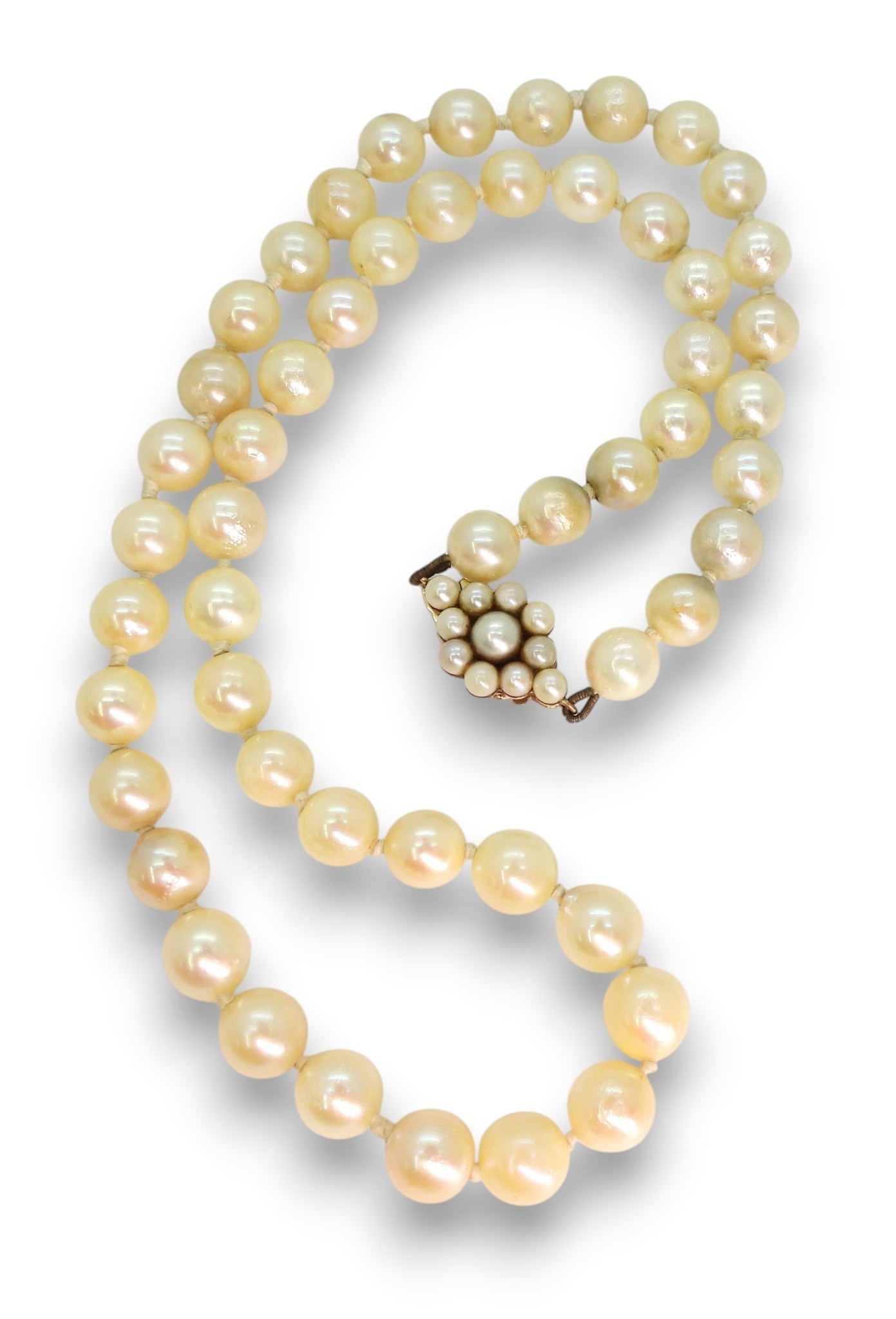 A string of cultured pearls with a 9ct gold pearl flower clasp, length 44.5cm