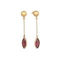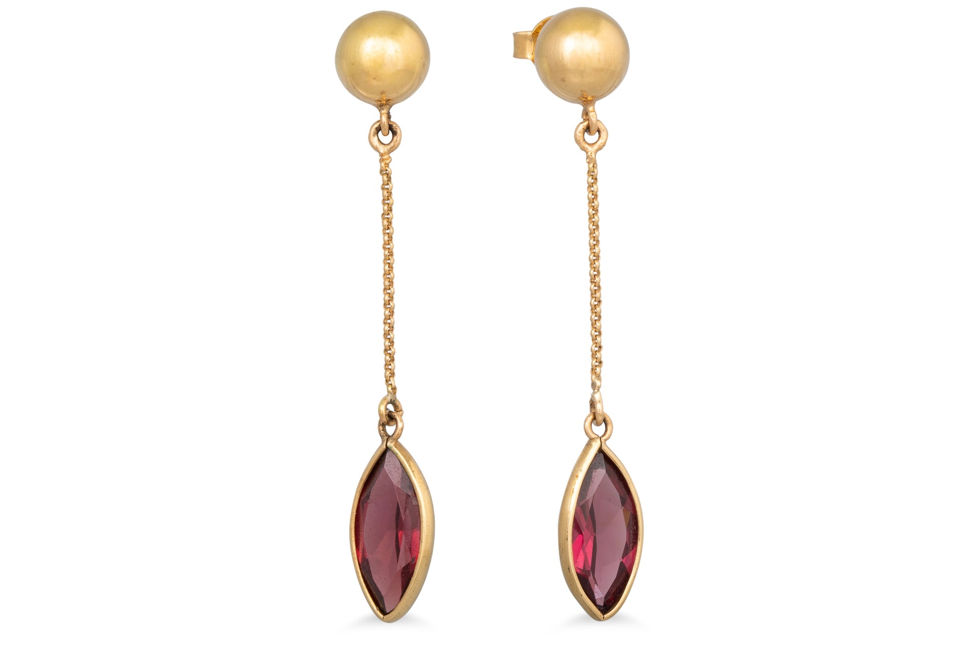 A PAIR OF GARNET DROP EARRINGS, mounted in 18ct yellow gold
