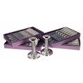 Twelve Carr's silver handled dinner knives 9.5" long; together with twelve knives 8.5" long, within retail card boxes; also a pair of William Hutton & Sons silver candlesticks (weighted), London 1906