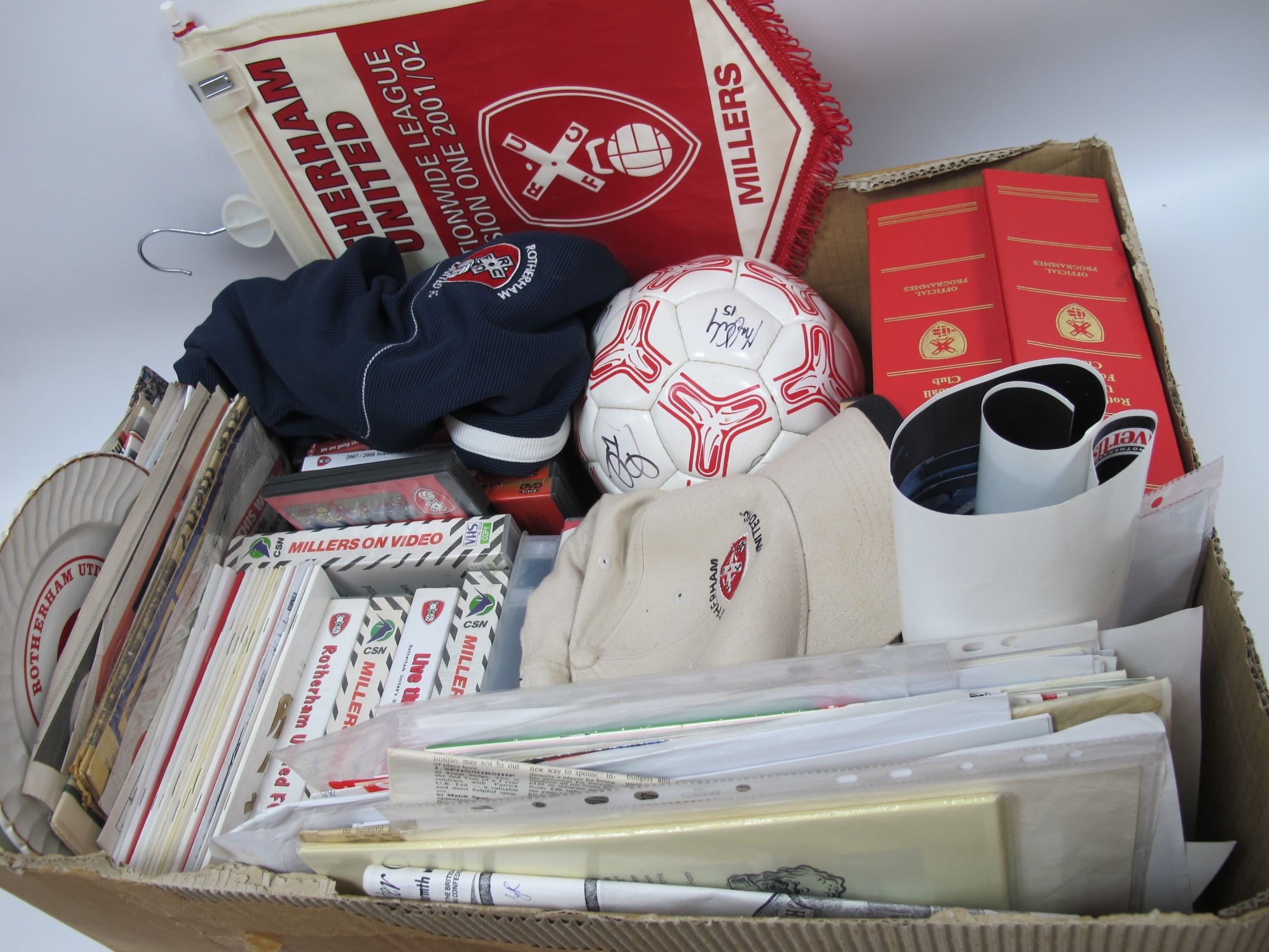 Rotherham United Fanzines, Signed Ball, cup, sweatshirt, pennant, calendars, two programme binders, newspapers and other ephemera:- One Box.