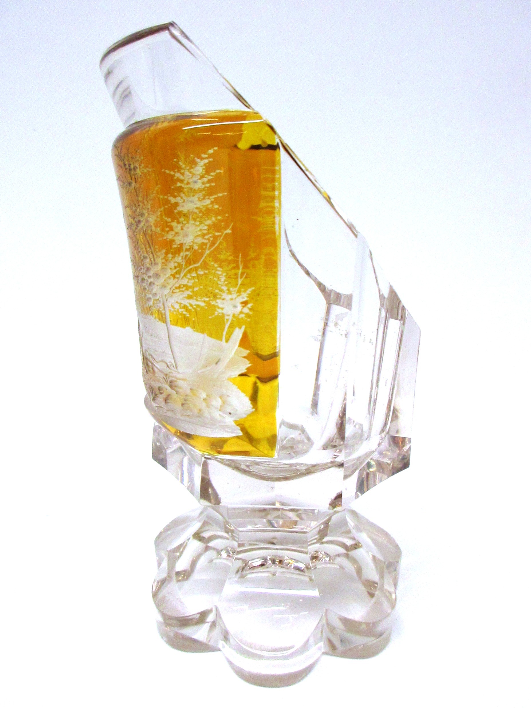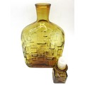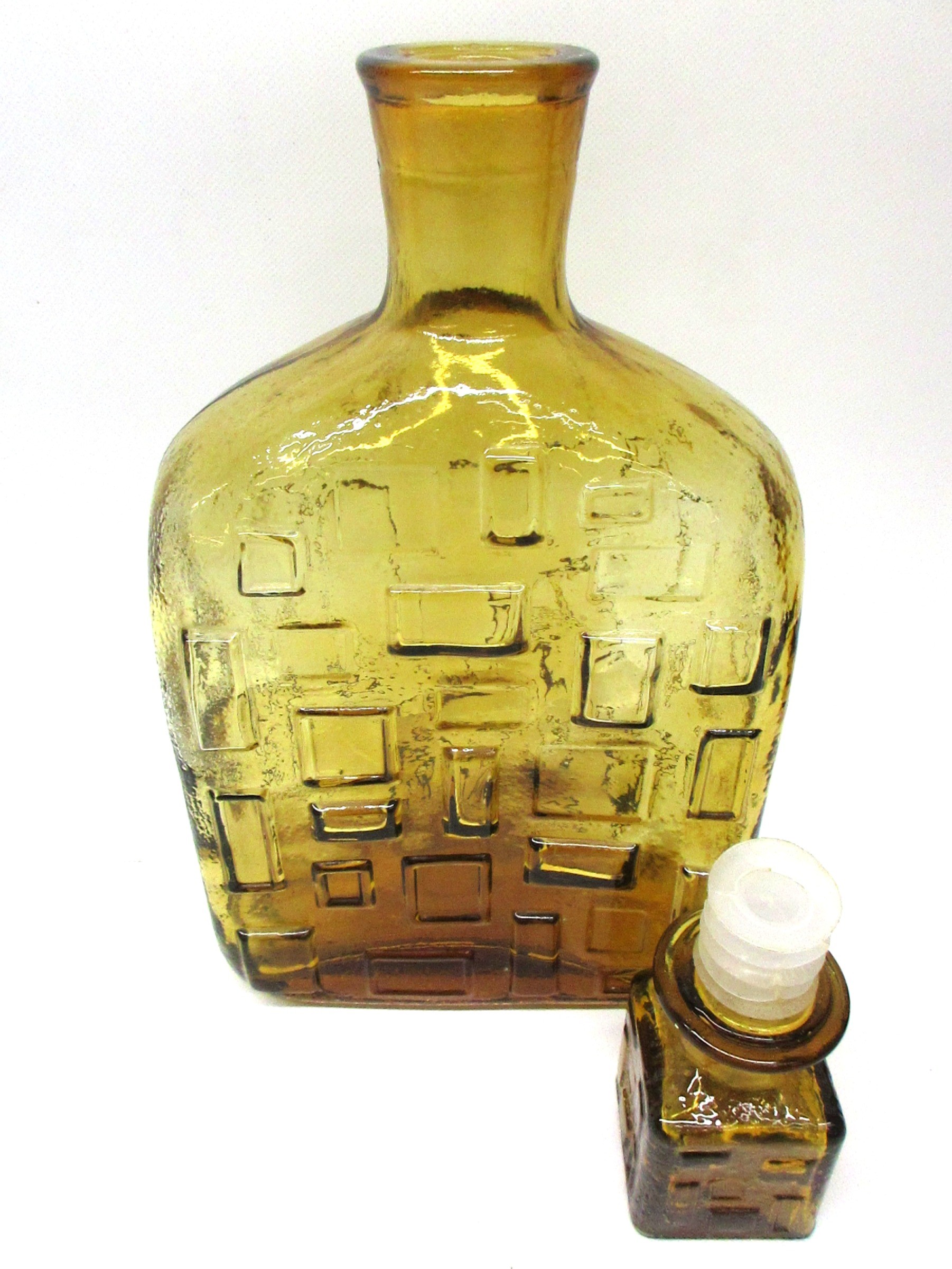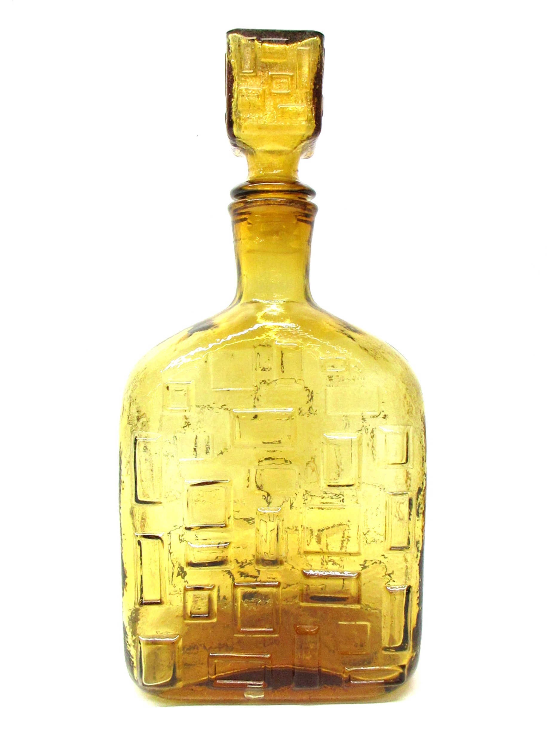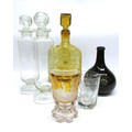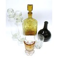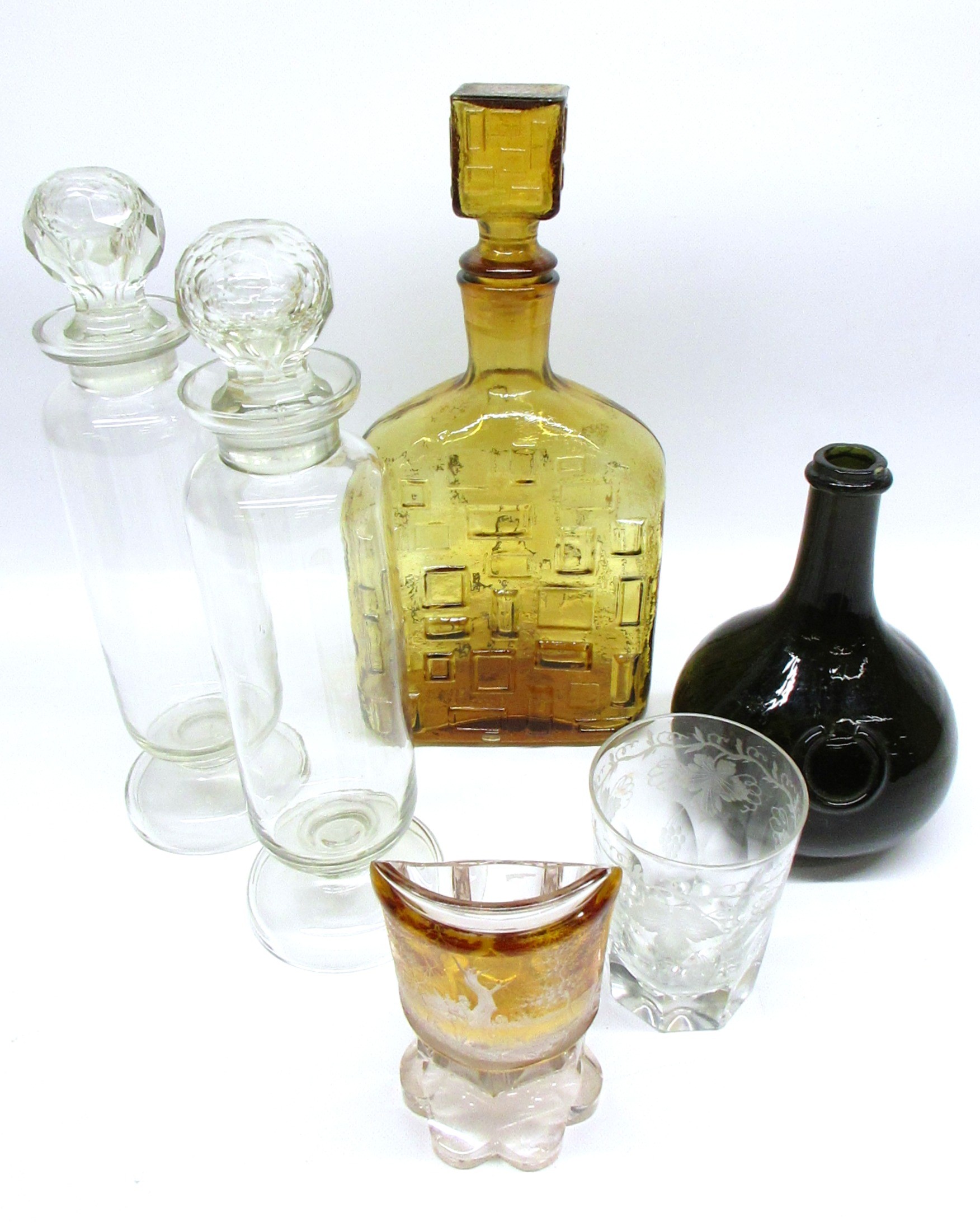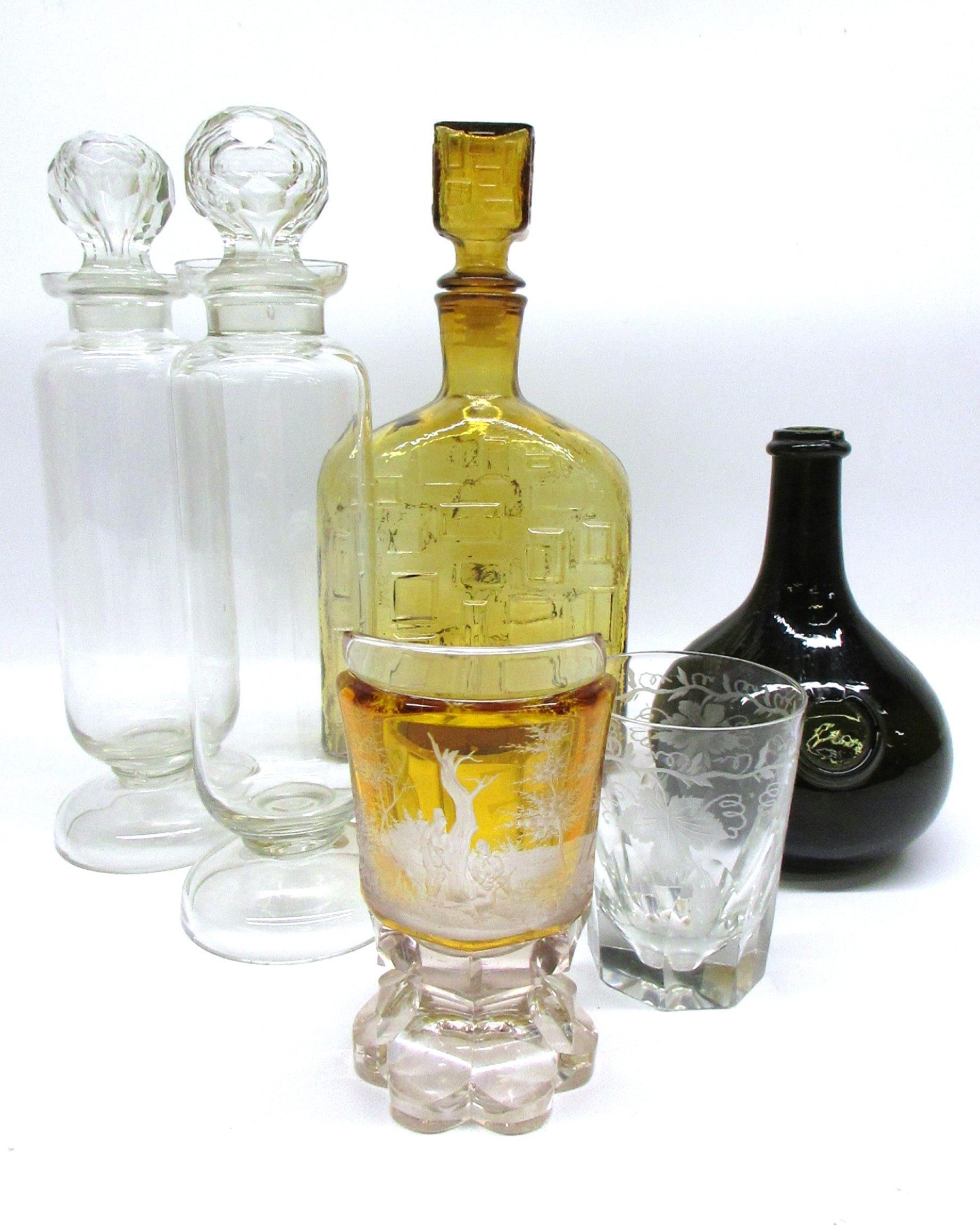 Selection of decorative glassware inc. decanters and tumblers comprising mid-century modernist & geometrically Brutalist block patterned decanter in amber hue c1960s; featuring thickened glass with cubed stopper from the Empoli region, Italy; approx. W 15cm x H 32cm x D 7cm; late 19th Century Bohemia amber-flushed lead crystal footed beaker; with cut back, distinctive floral shaped base & hand engraved stag hunting scene, in the style of Moser; pair of Edwardian apothecary bottles/chemist decanters, each with rounded cut glass stoppers & domed bases, originally for storing medicines; hand-blown onion shaped bottle, boasting a tall tapered neck with deep kick to the squat wide base in thick olive green glass; favoured by sailors for its stability when at sea; plus glass tumbler with copper-wheel etching of a grape & vine border trailing the length & facet-cut base, etc. Qty. 6