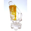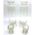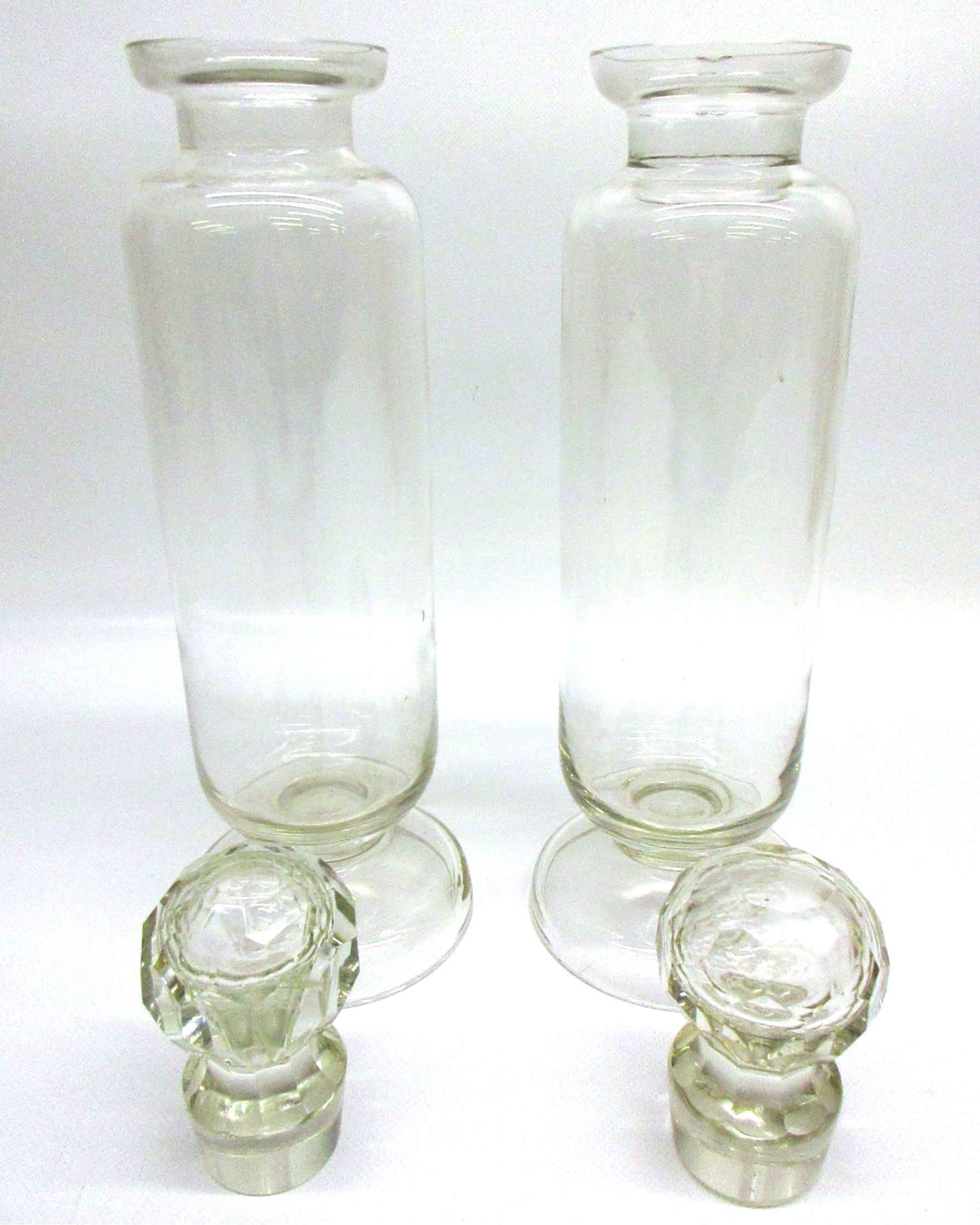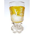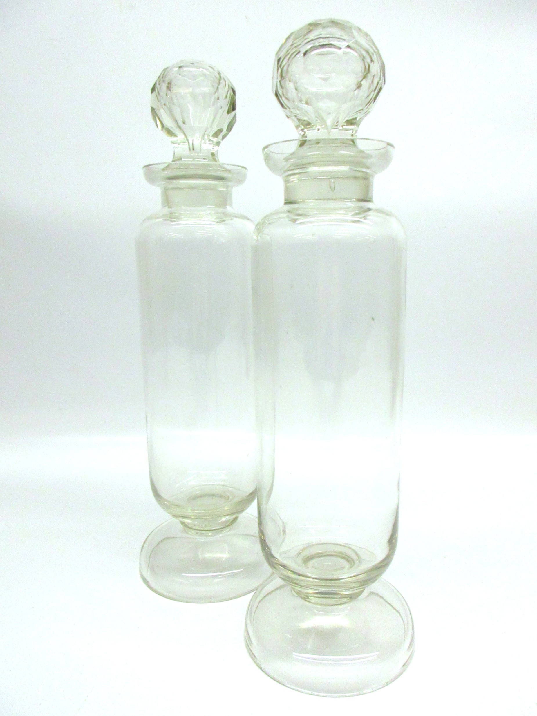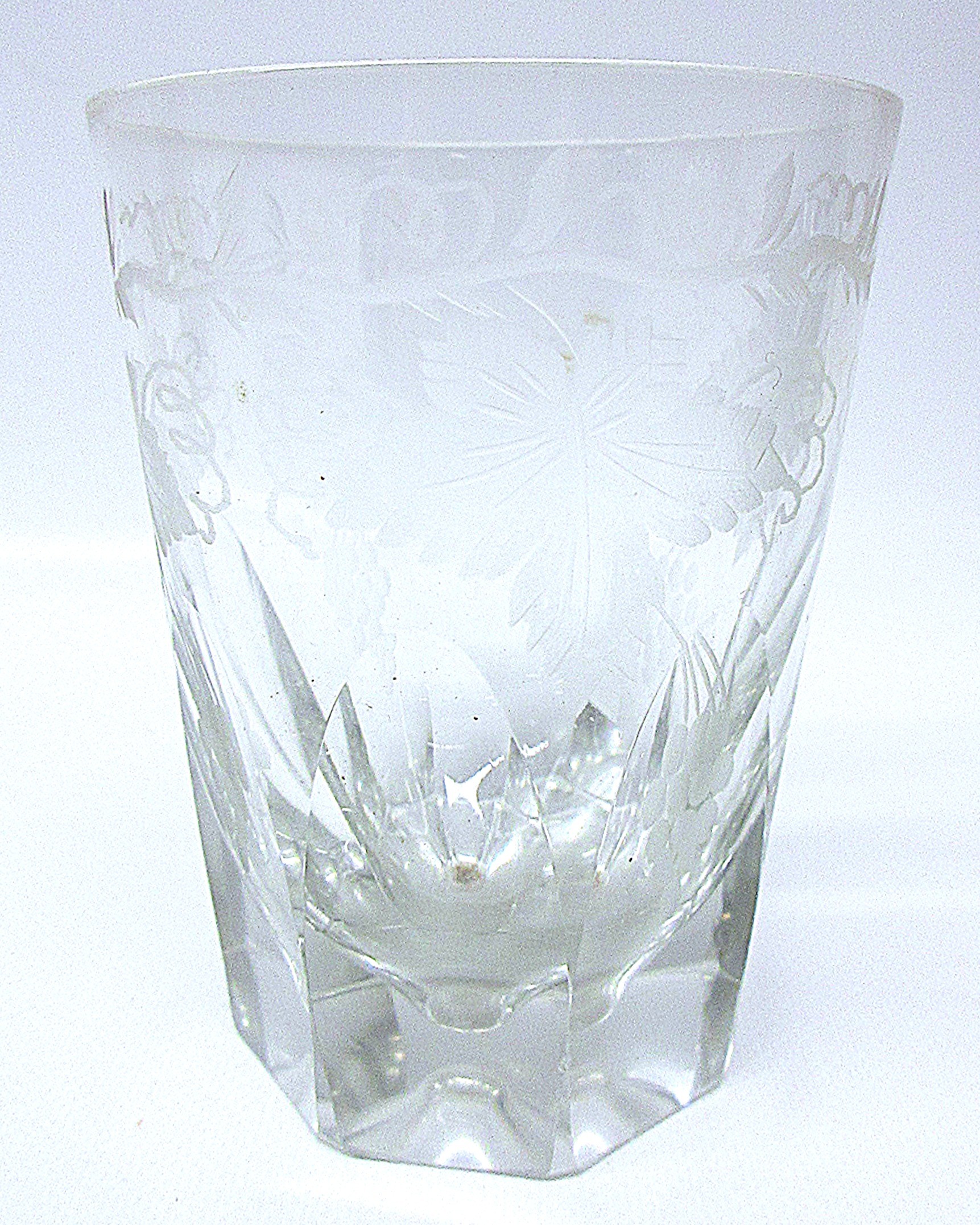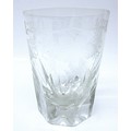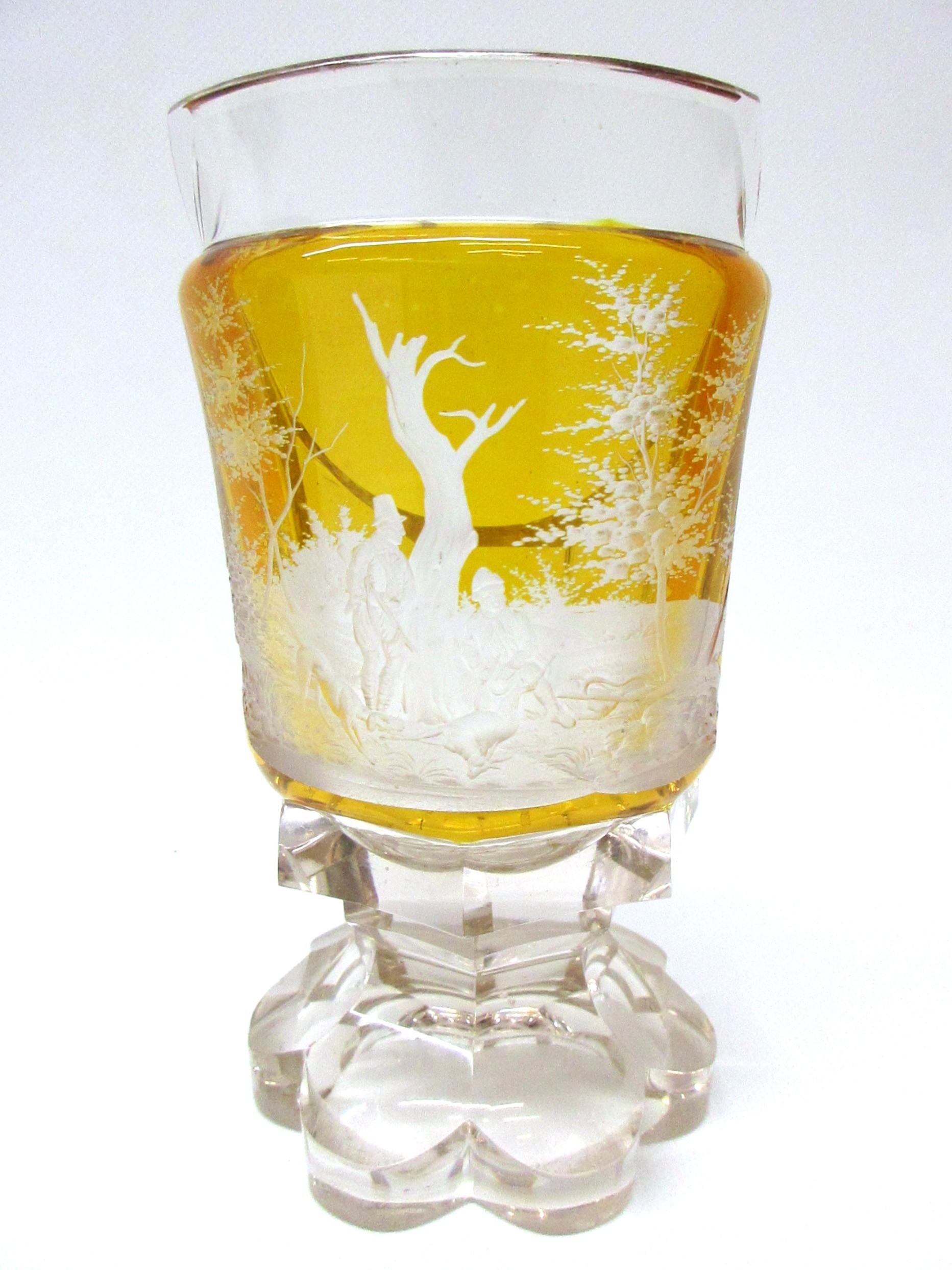 Selection of decorative glassware inc. decanters and tumblers comprising mid-century modernist & geometrically Brutalist block patterned decanter in amber hue c1960s; featuring thickened glass with cubed stopper from the Empoli region, Italy; approx. W 15cm x H 32cm x D 7cm; late 19th Century Bohemia amber-flushed lead crystal footed beaker; with cut back, distinctive floral shaped base & hand engraved stag hunting scene, in the style of Moser; pair of Edwardian apothecary bottles/chemist decanters, each with rounded cut glass stoppers & domed bases, originally for storing medicines; hand-blown onion shaped bottle, boasting a tall tapered neck with deep kick to the squat wide base in thick olive green glass; favoured by sailors for its stability when at sea; plus glass tumbler with copper-wheel etching of a grape & vine border trailing the length & facet-cut base, etc. Qty. 6