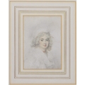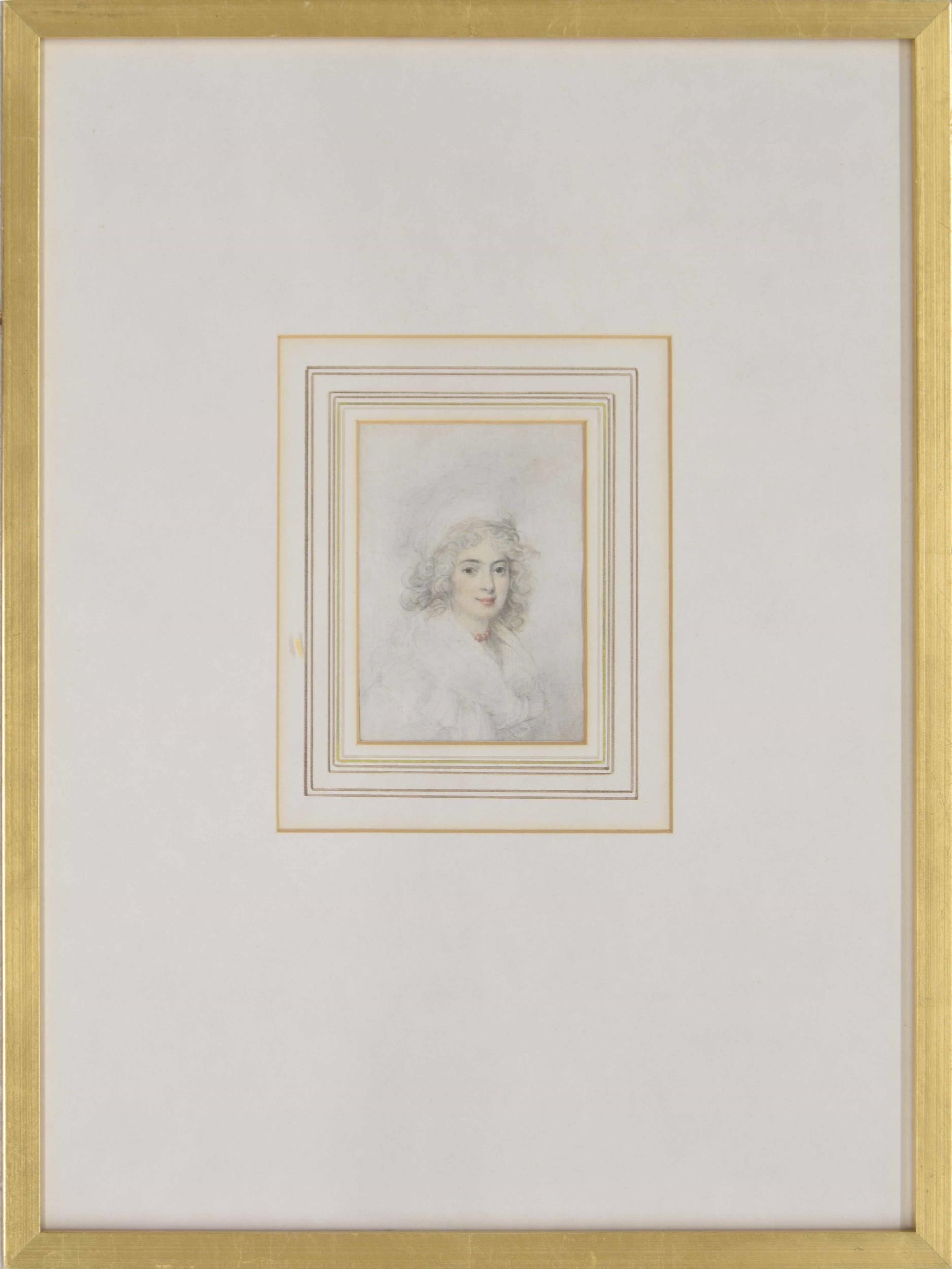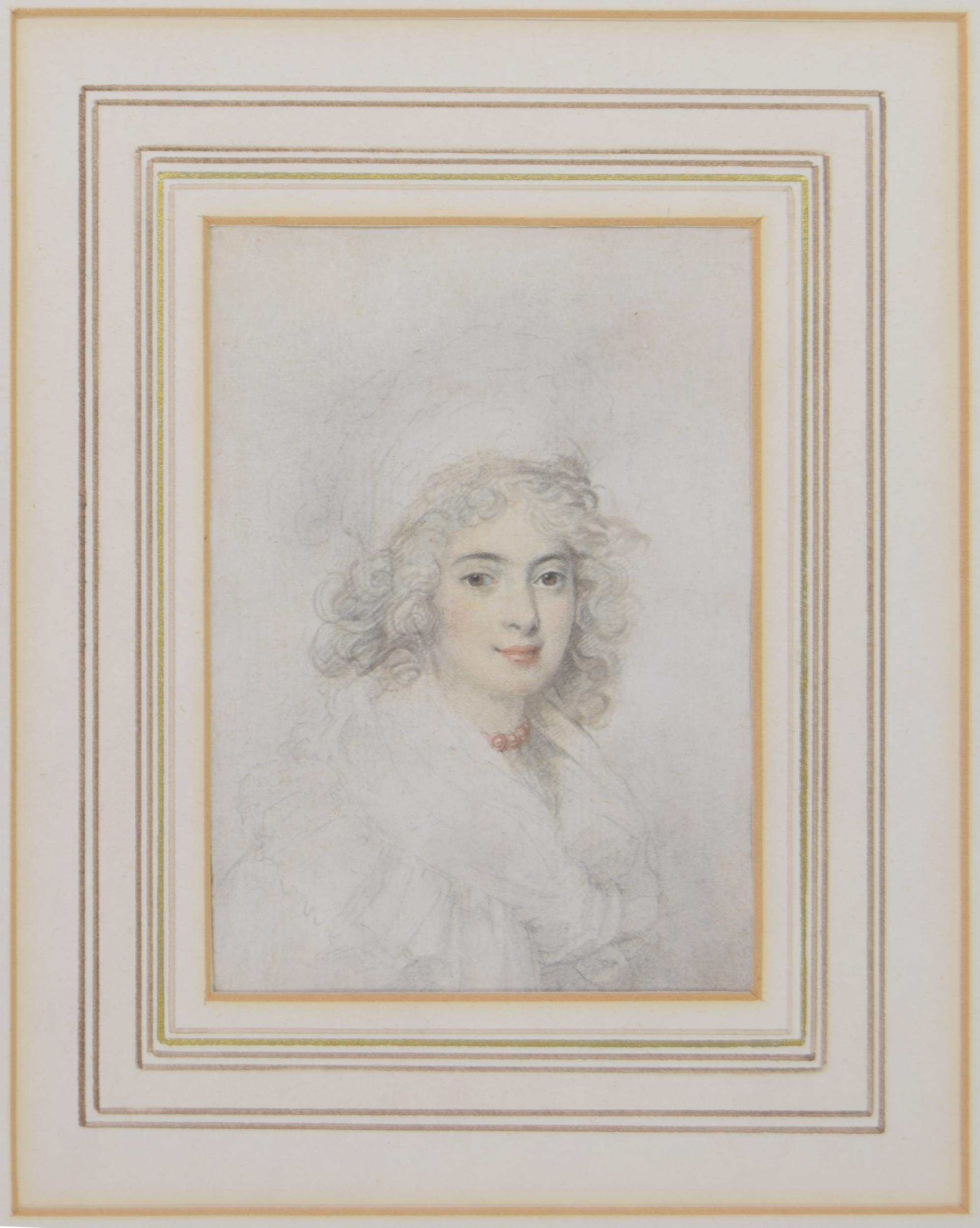 Richard Cosway RA., (1740-1821) - Portrait of a young lady, head and shoulders three quarter length, her hair dressed with a white cap and wearing a white dress with a coral necklace, pencil and watercolour on paper, 4.25" x 3"