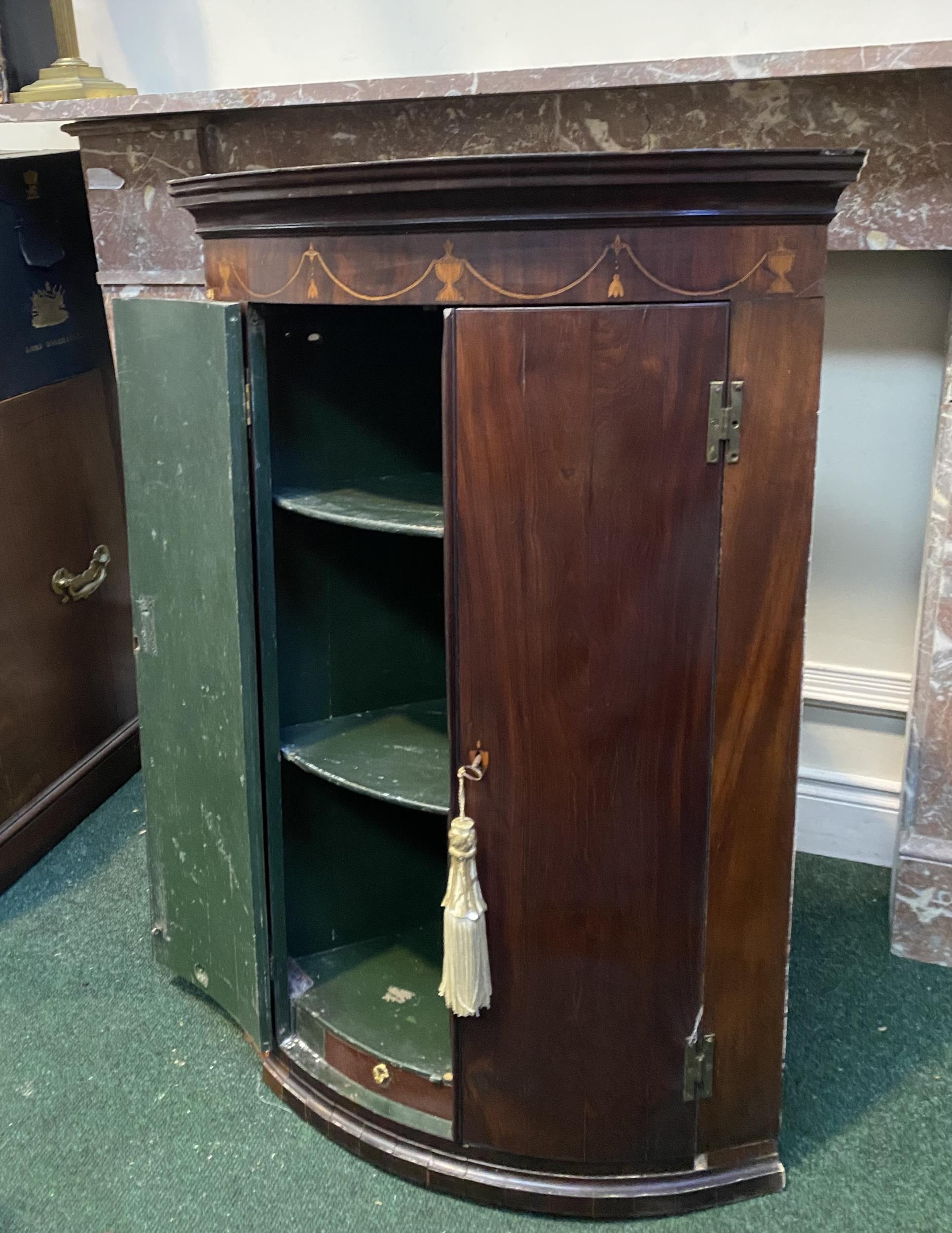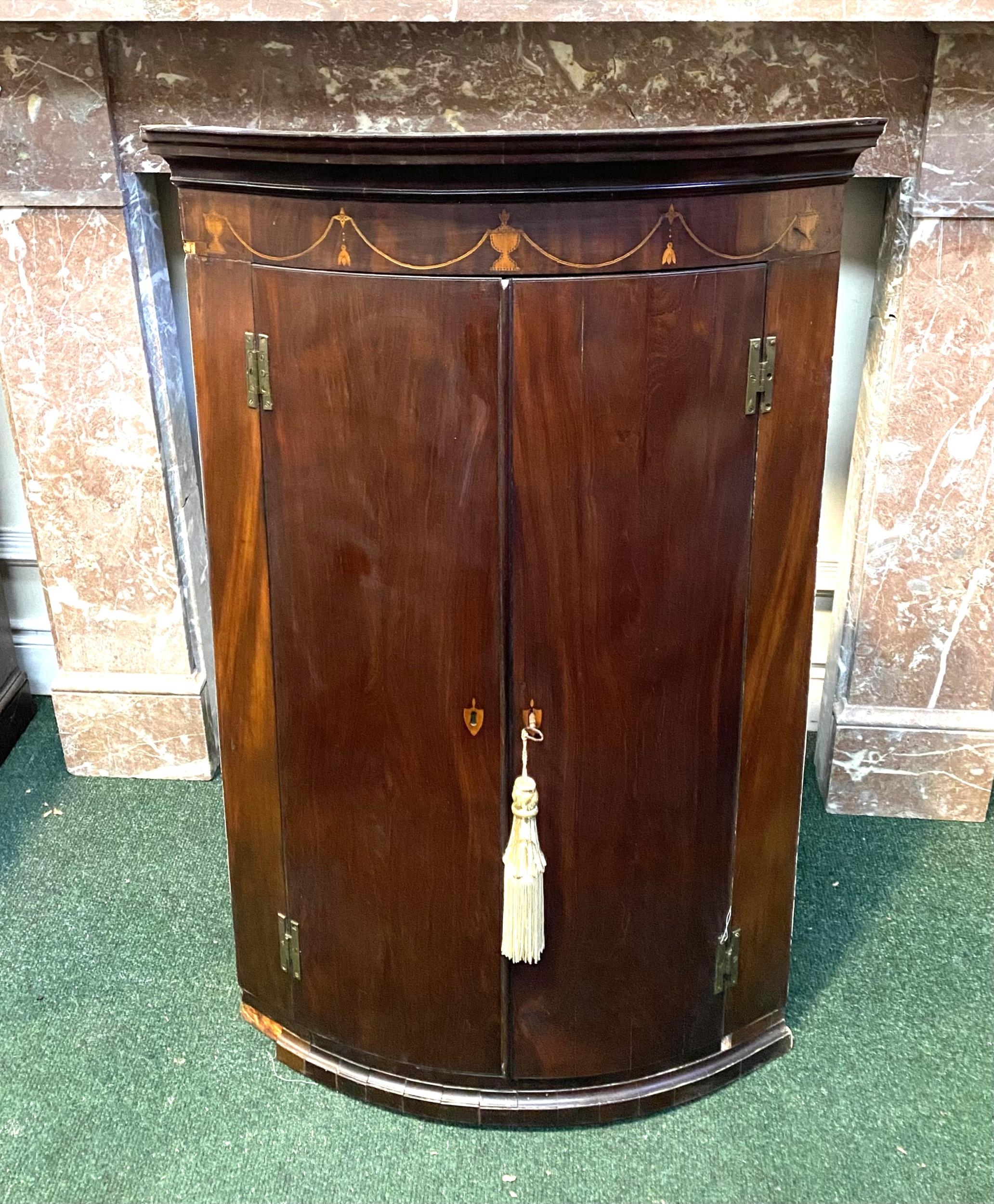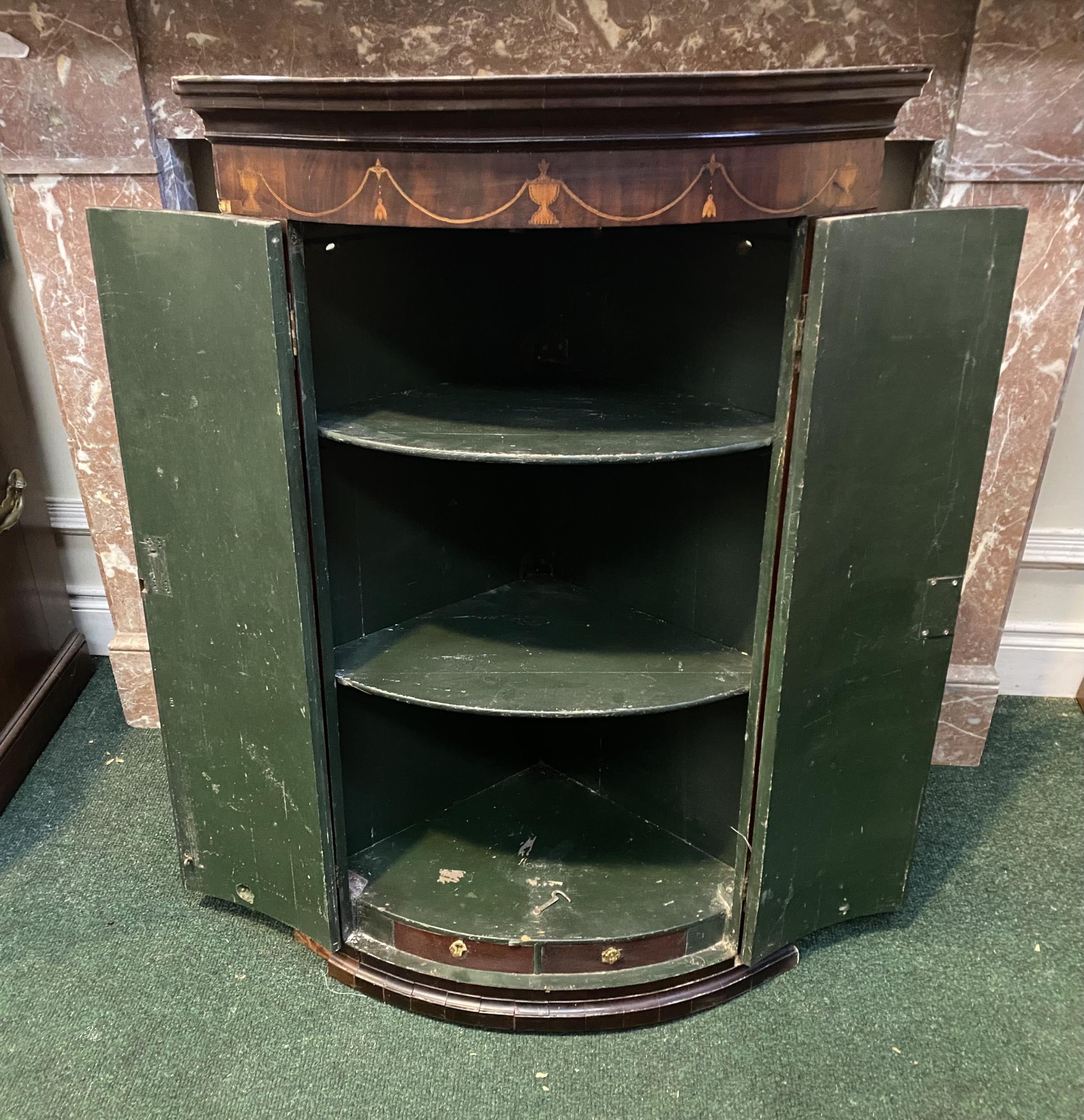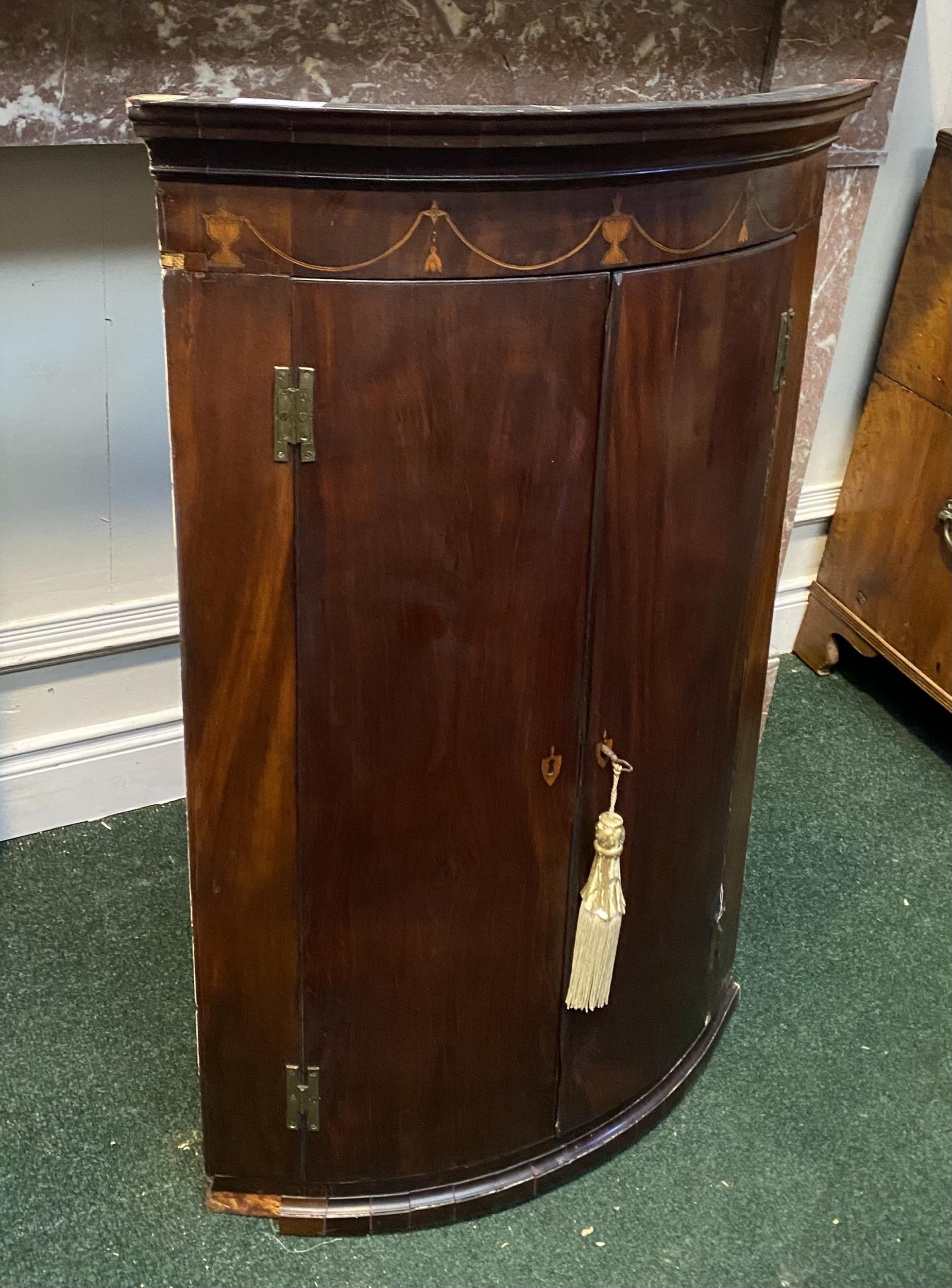 A GEORGIAN BOW FRONTED HANGING CORNER CABINET, with a graduated pediment top, over a row of inlaid urn & swag decoration above the double doors, two shelves are housed within – the shelves & interior coloured green, each door with an inlaid shield shaped keyhole - comes with working key. Dimensions: 112 x 73 x 48cm (H x W x D).