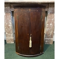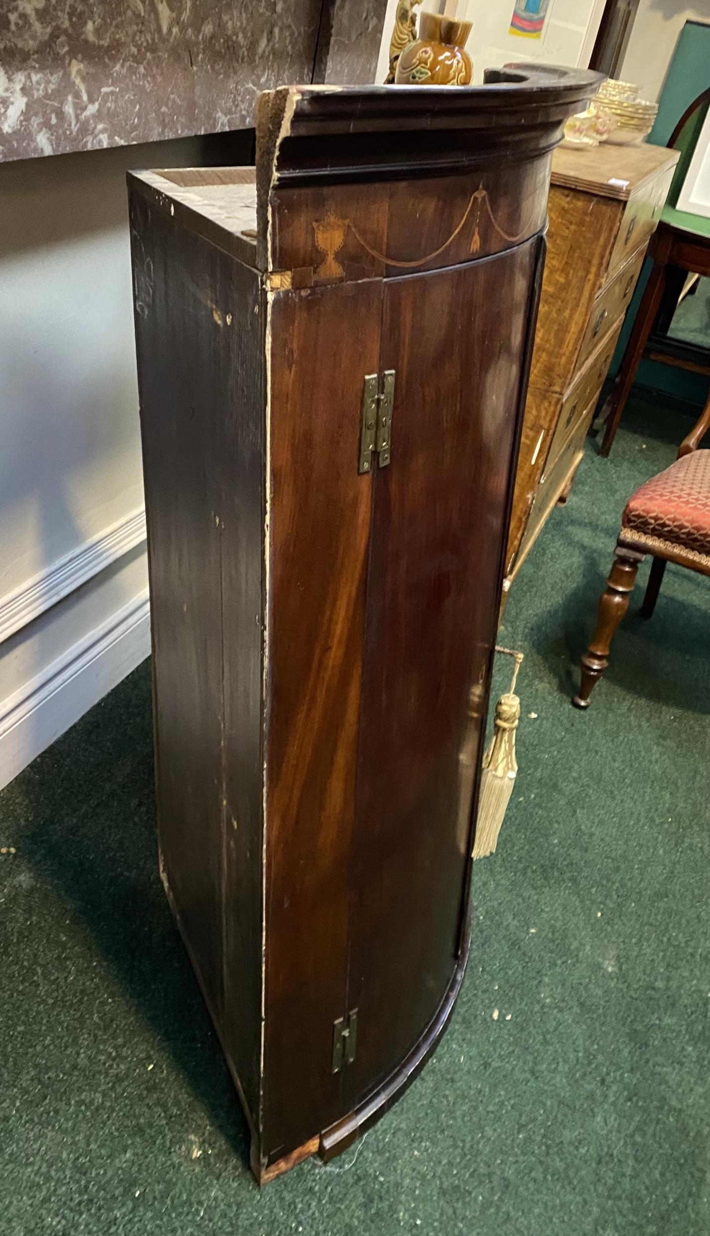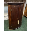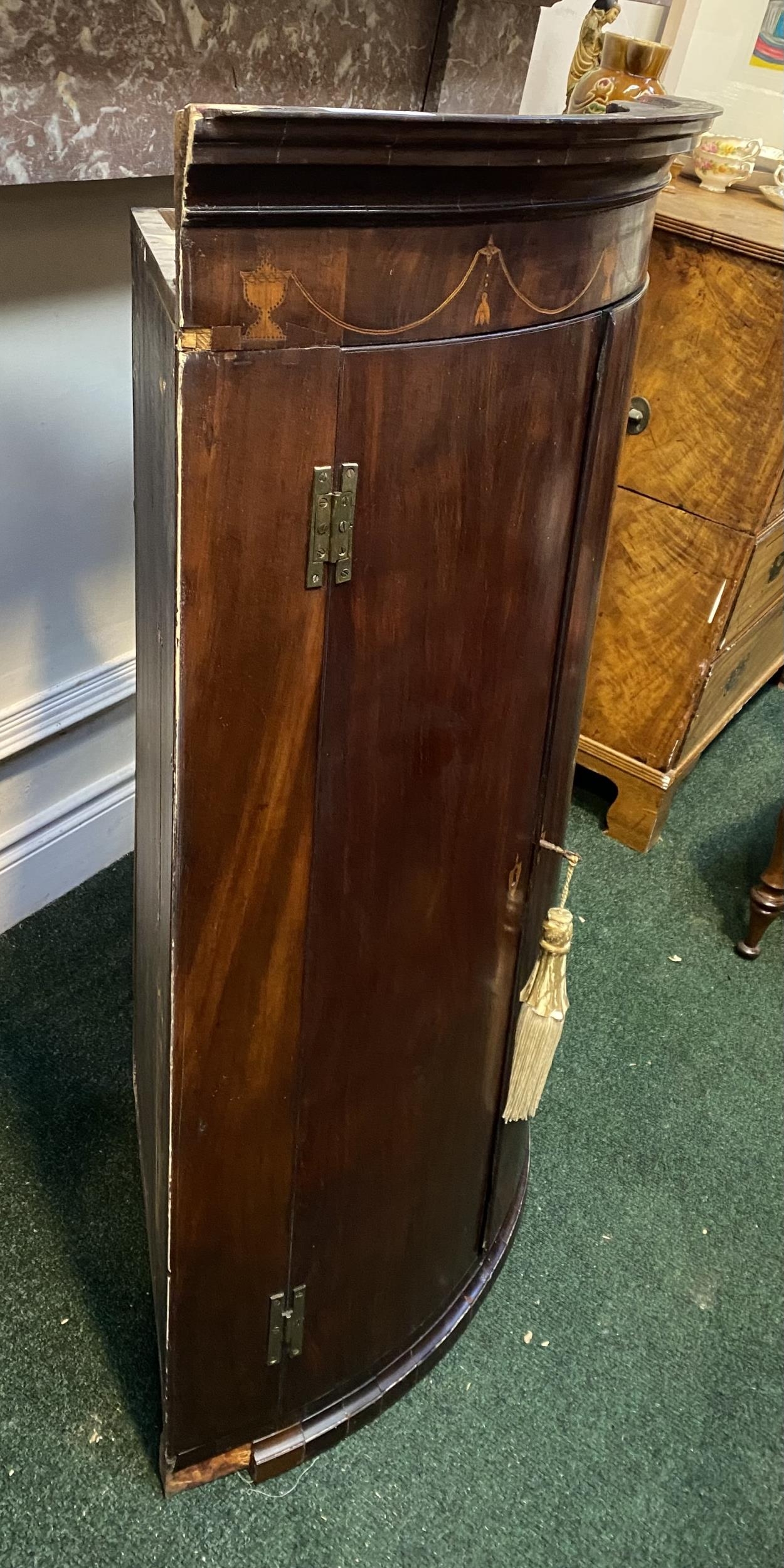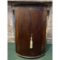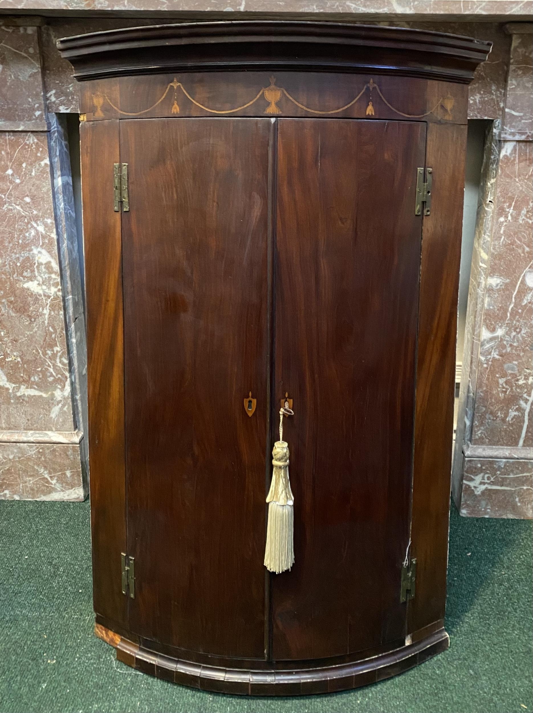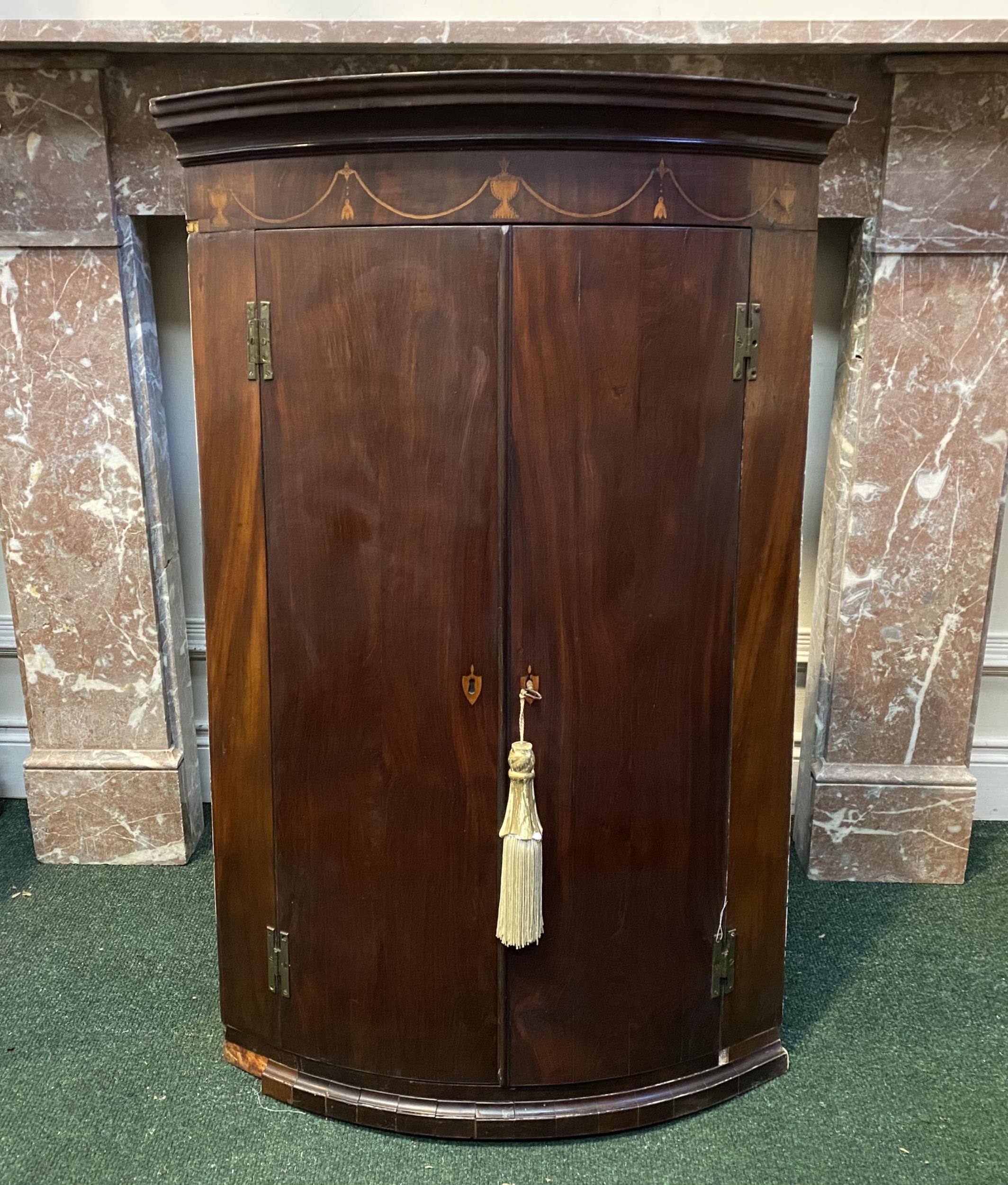 A GEORGIAN BOW FRONTED HANGING CORNER CABINET, with a graduated pediment top, over a row of inlaid urn & swag decoration above the double doors, two shelves are housed within – the shelves & interior coloured green, each door with an inlaid shield shaped keyhole - comes with working key. Dimensions: 112 x 73 x 48cm (H x W x D).