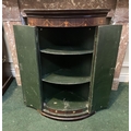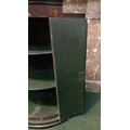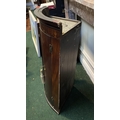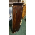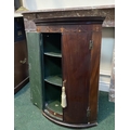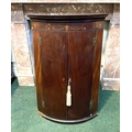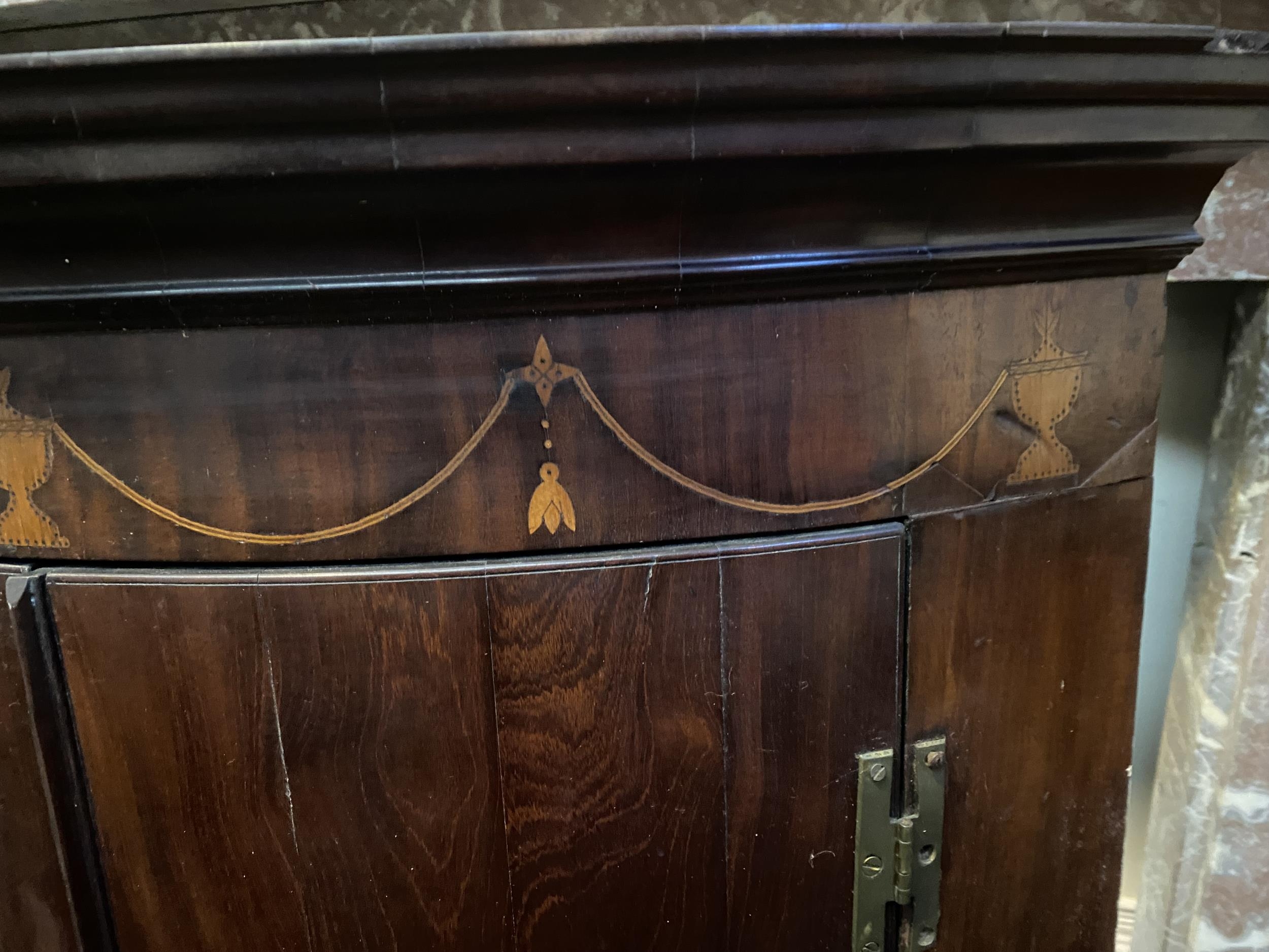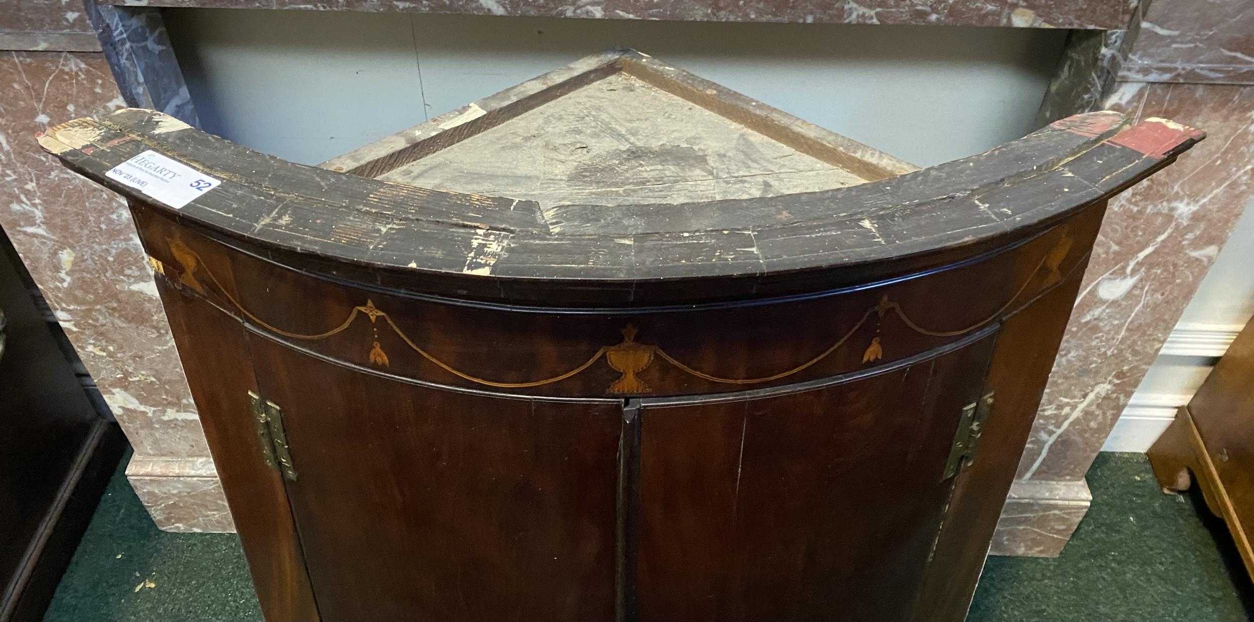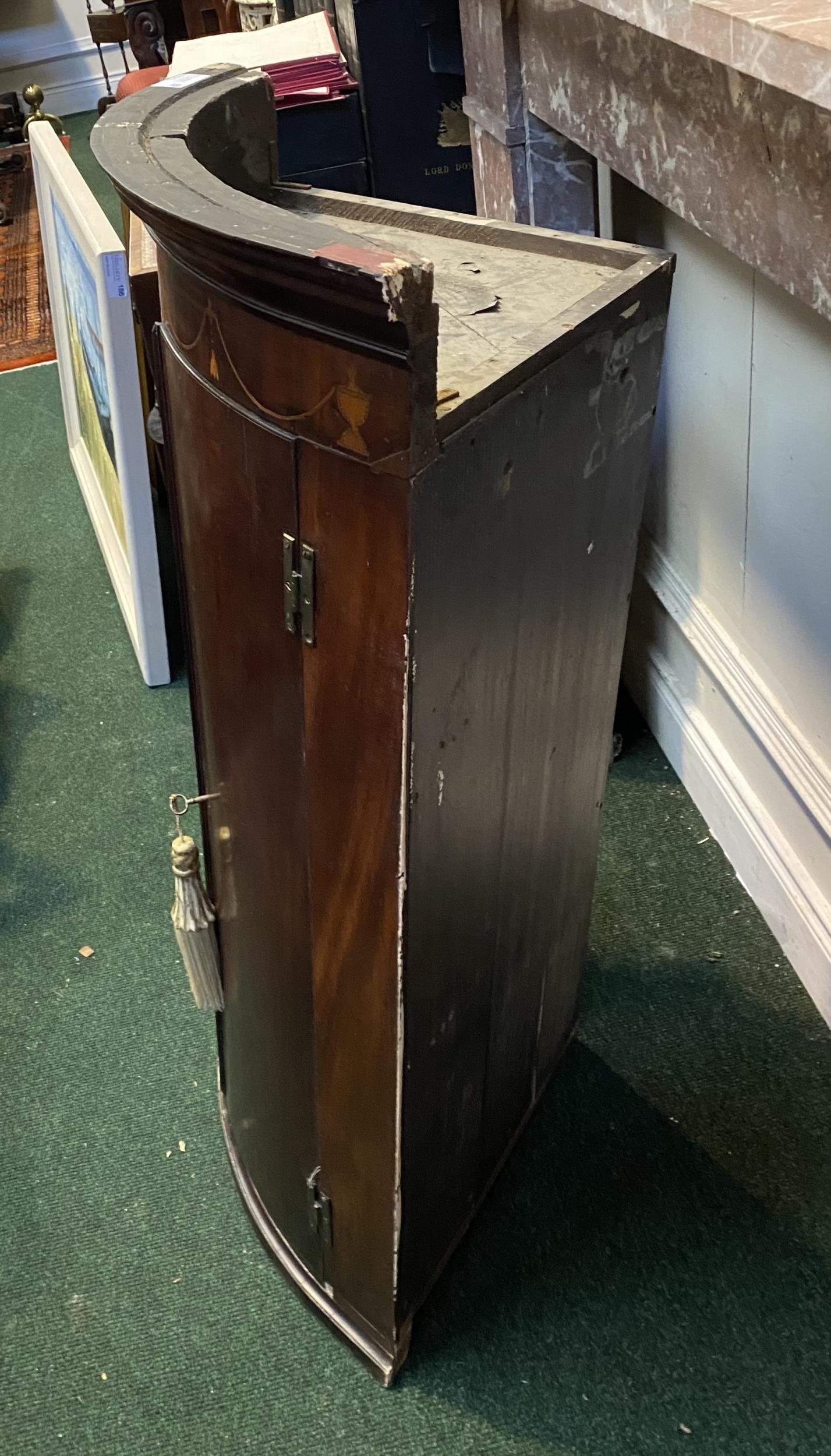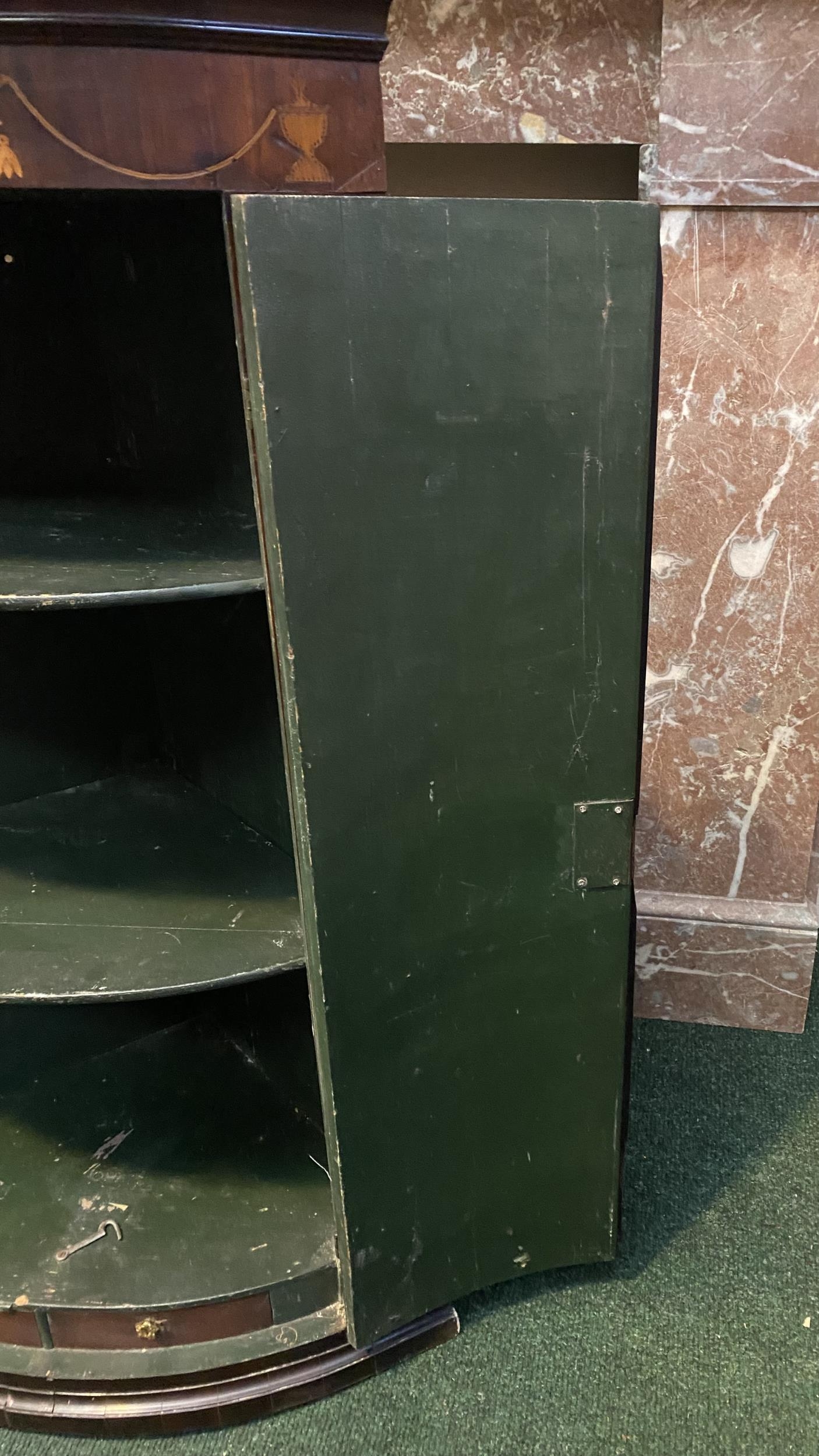 A GEORGIAN BOW FRONTED HANGING CORNER CABINET, with a graduated pediment top, over a row of inlaid urn & swag decoration above the double doors, two shelves are housed within – the shelves & interior coloured green, each door with an inlaid shield shaped keyhole - comes with working key. Dimensions: 112 x 73 x 48cm (H x W x D).
