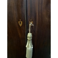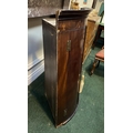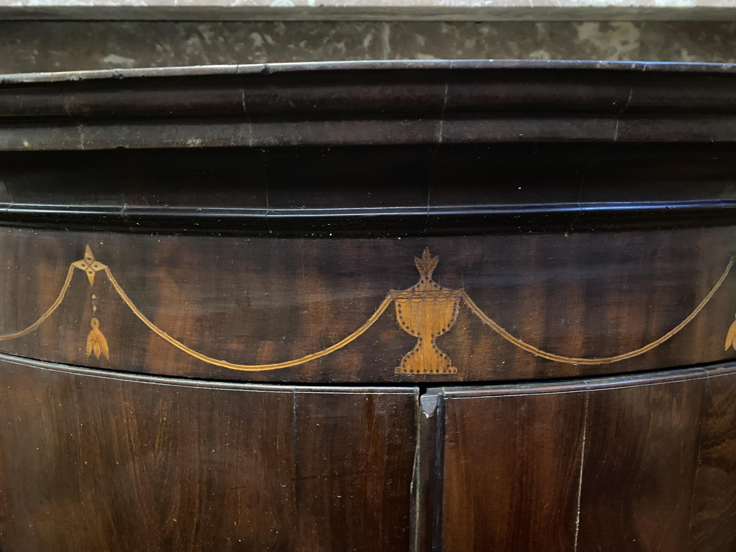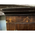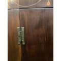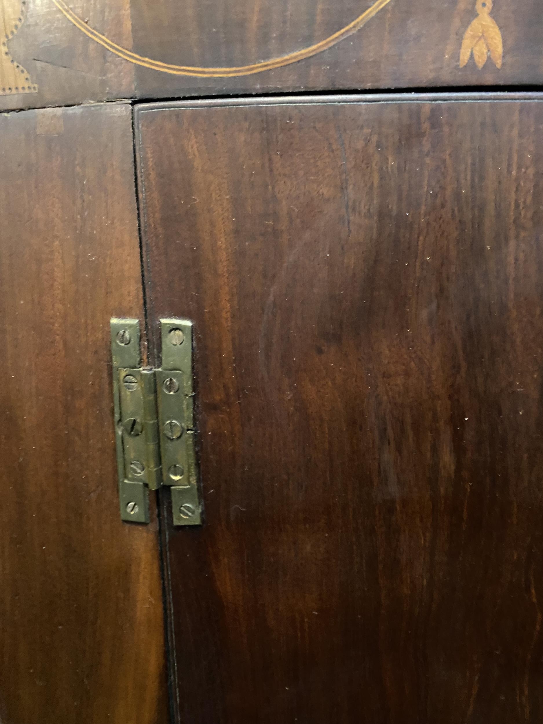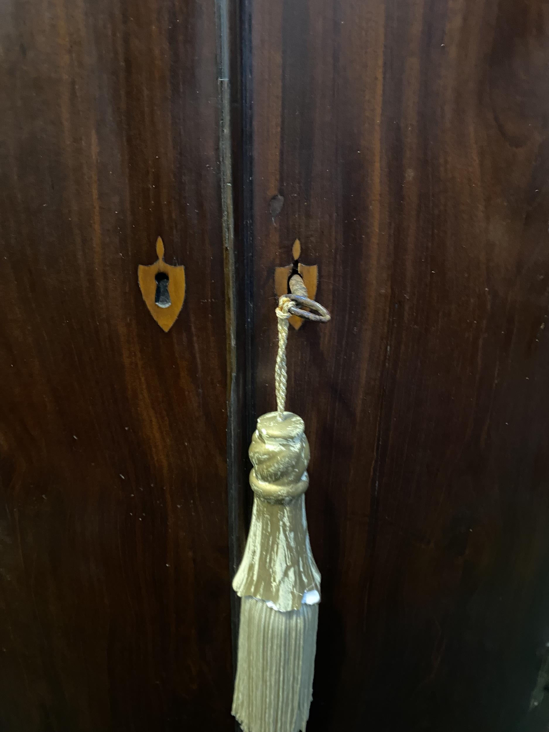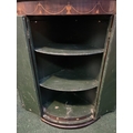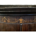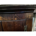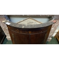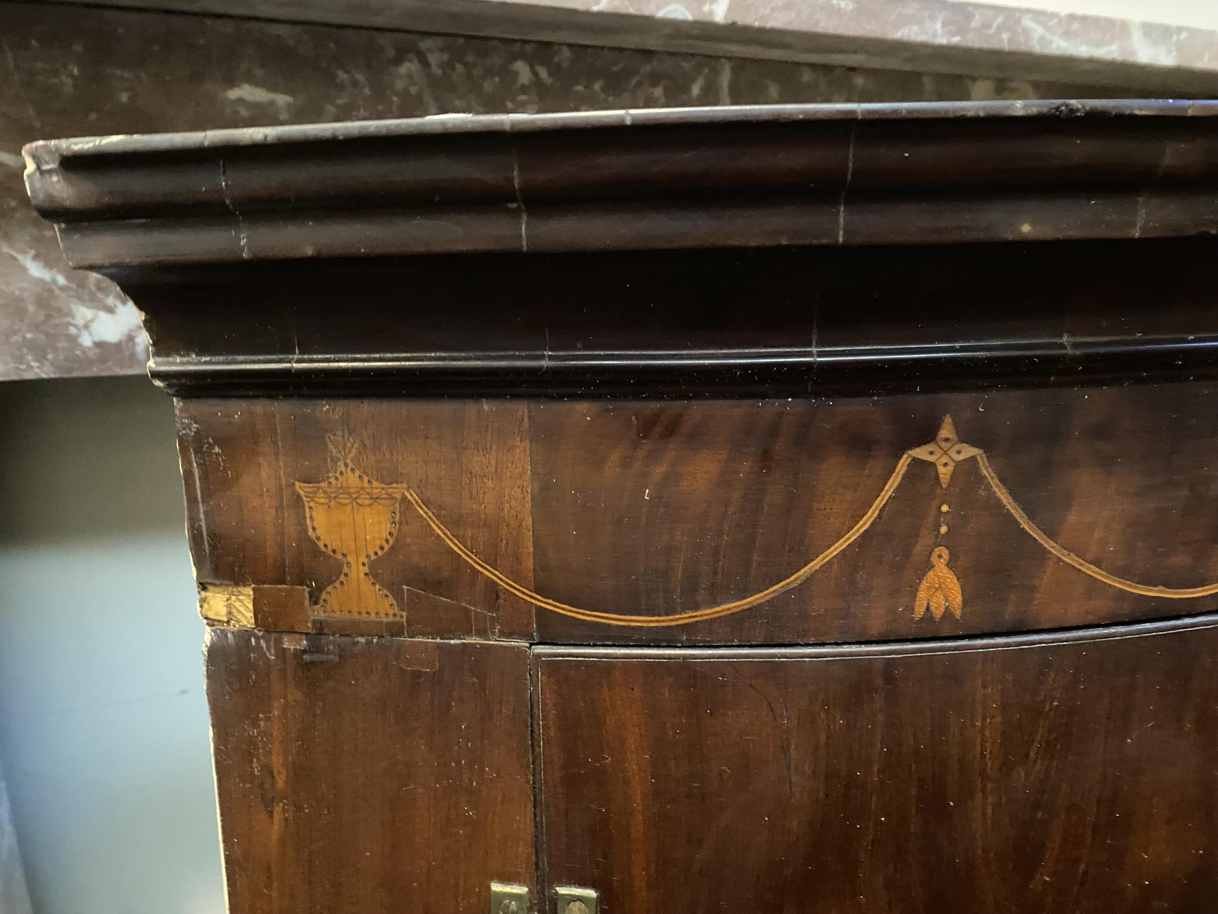 A GEORGIAN BOW FRONTED HANGING CORNER CABINET, with a graduated pediment top, over a row of inlaid urn & swag decoration above the double doors, two shelves are housed within – the shelves & interior coloured green, each door with an inlaid shield shaped keyhole - comes with working key. Dimensions: 112 x 73 x 48cm (H x W x D).