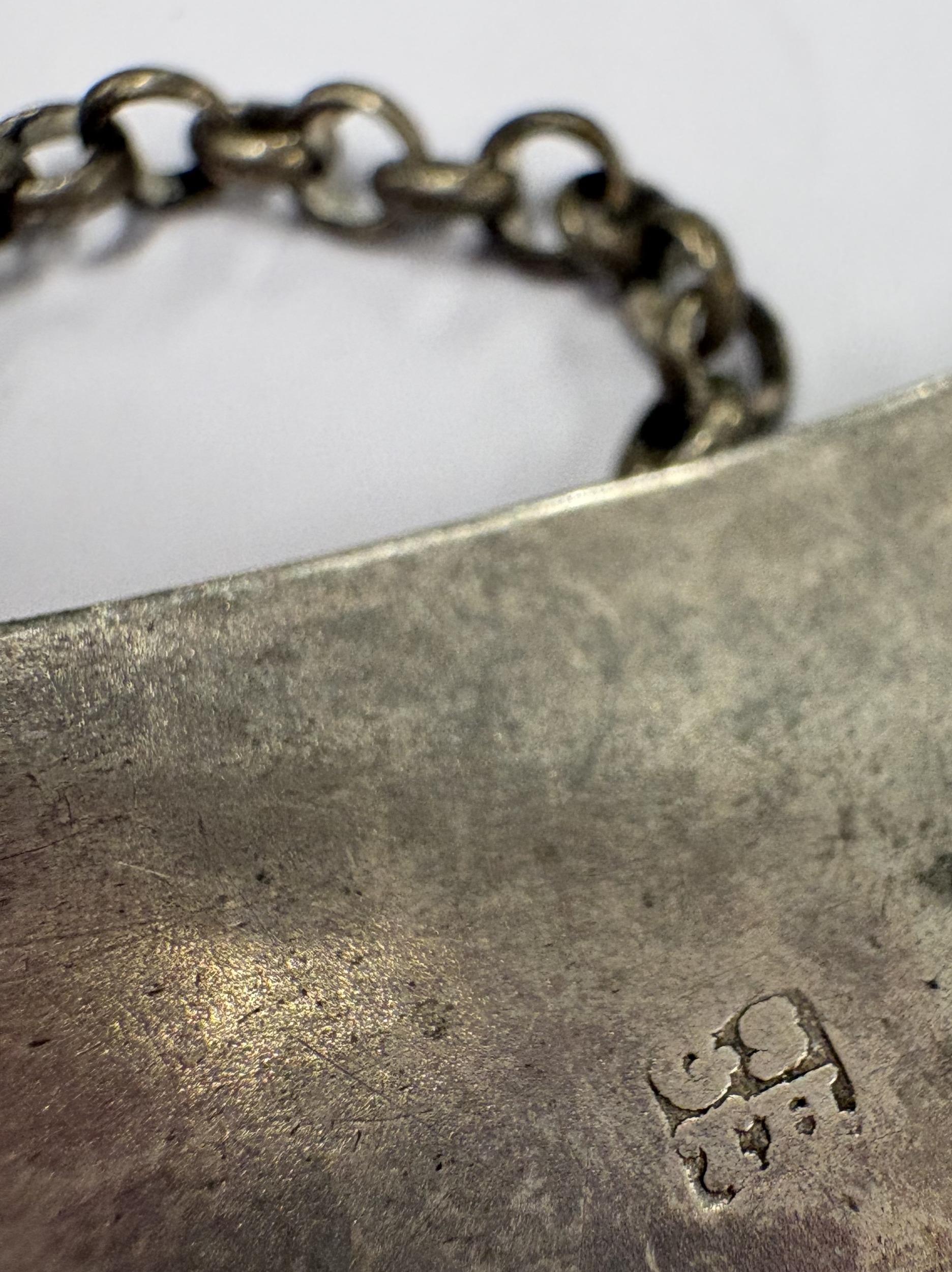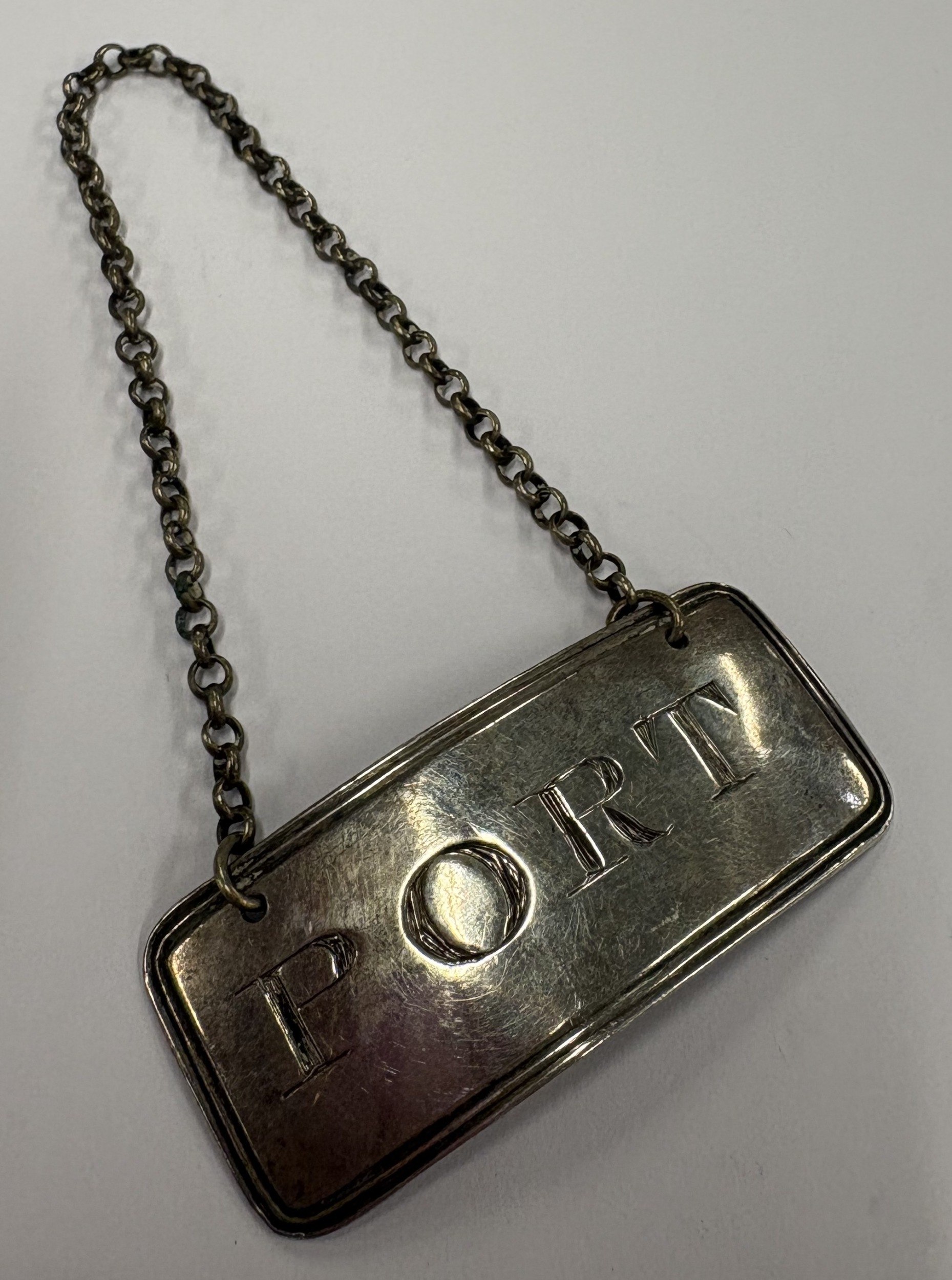 A 19th Century George III silver wine label for 'Port'. Maker's mark only. Circa 1790 - 1804. By George Smith II & Thomas Hater. Approx. 10 grams. Est. £50 - £80.