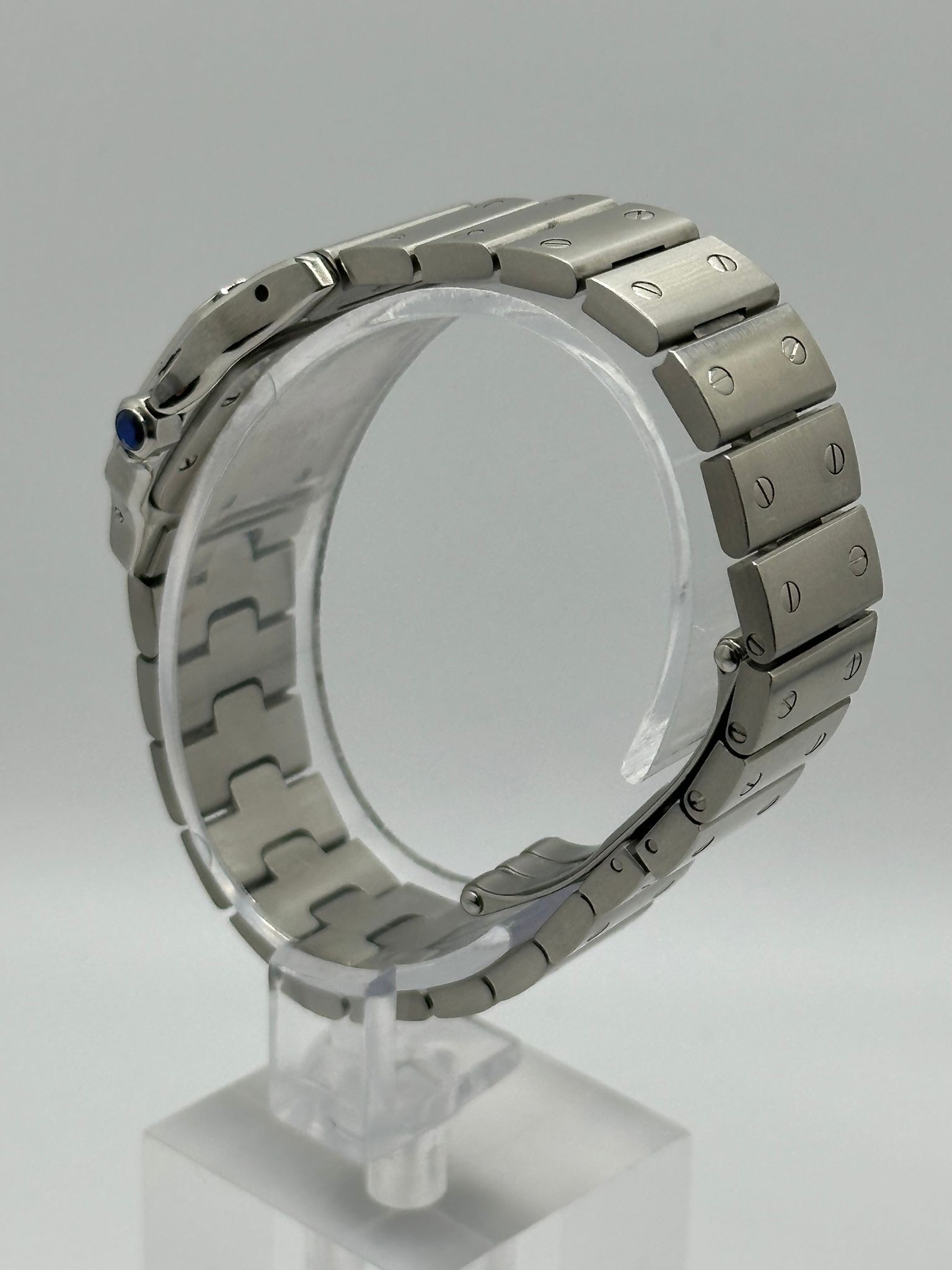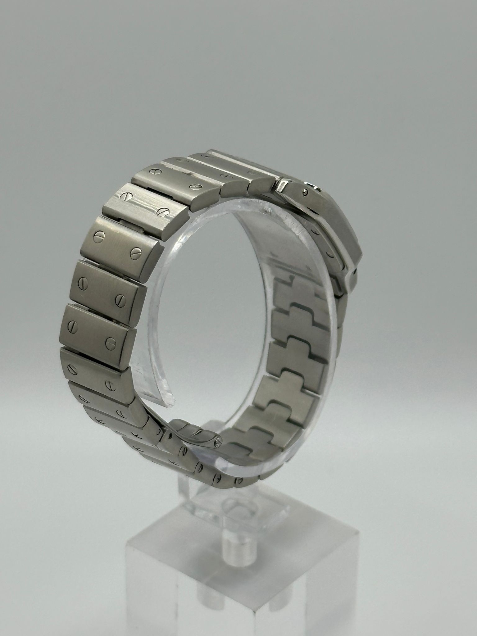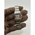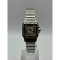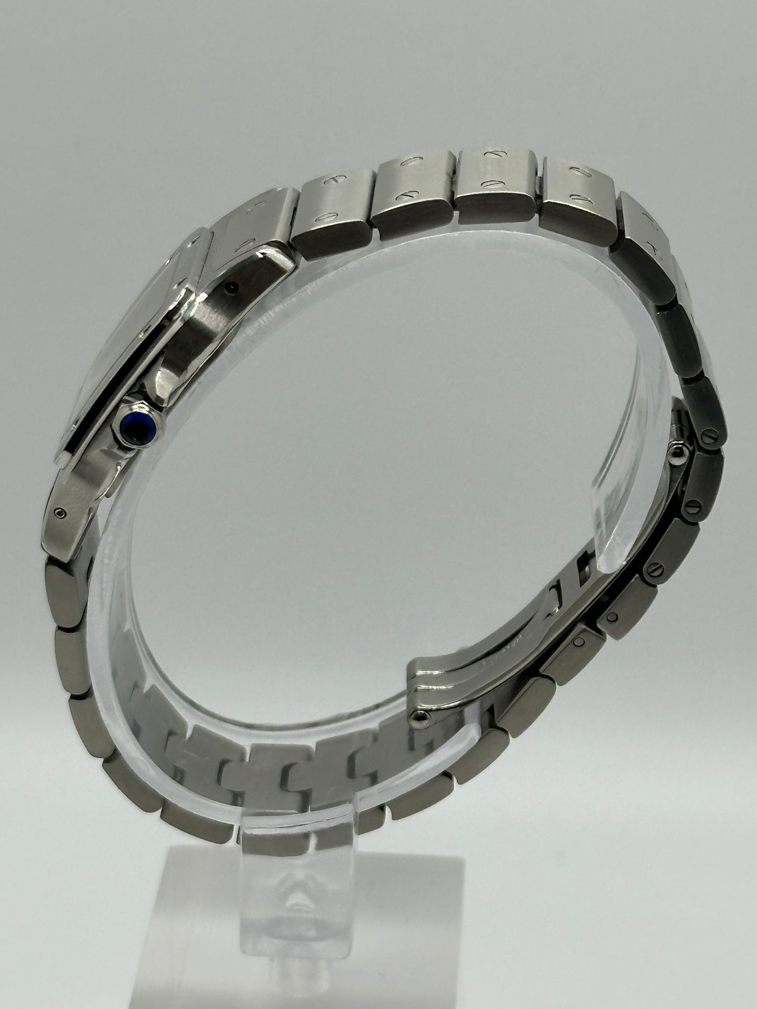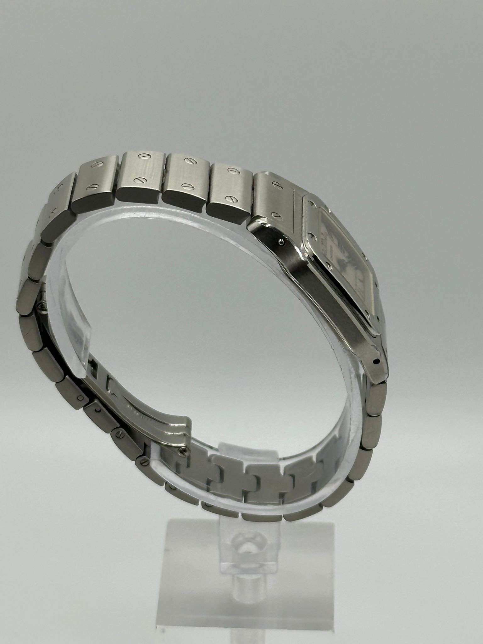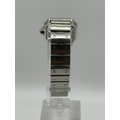 A Cartier 1565 Stainless Steel Santos Watch, 24mm case white dial and Roman numerals. Year 2009, comes with Paperwork. In good working condition, please see photos. Ref 604