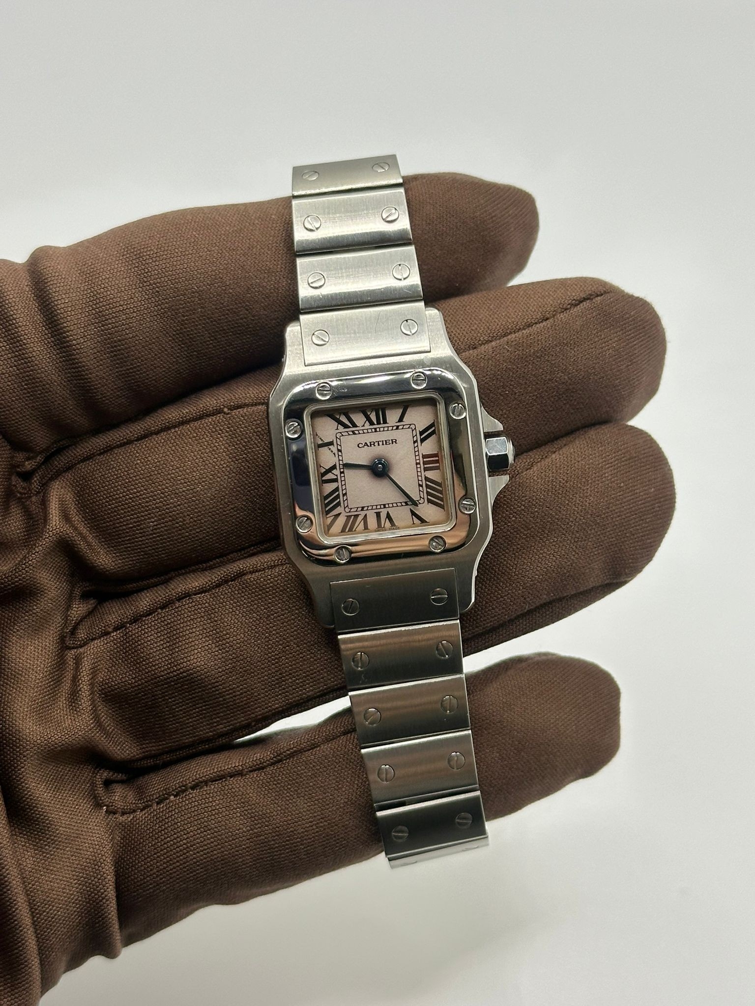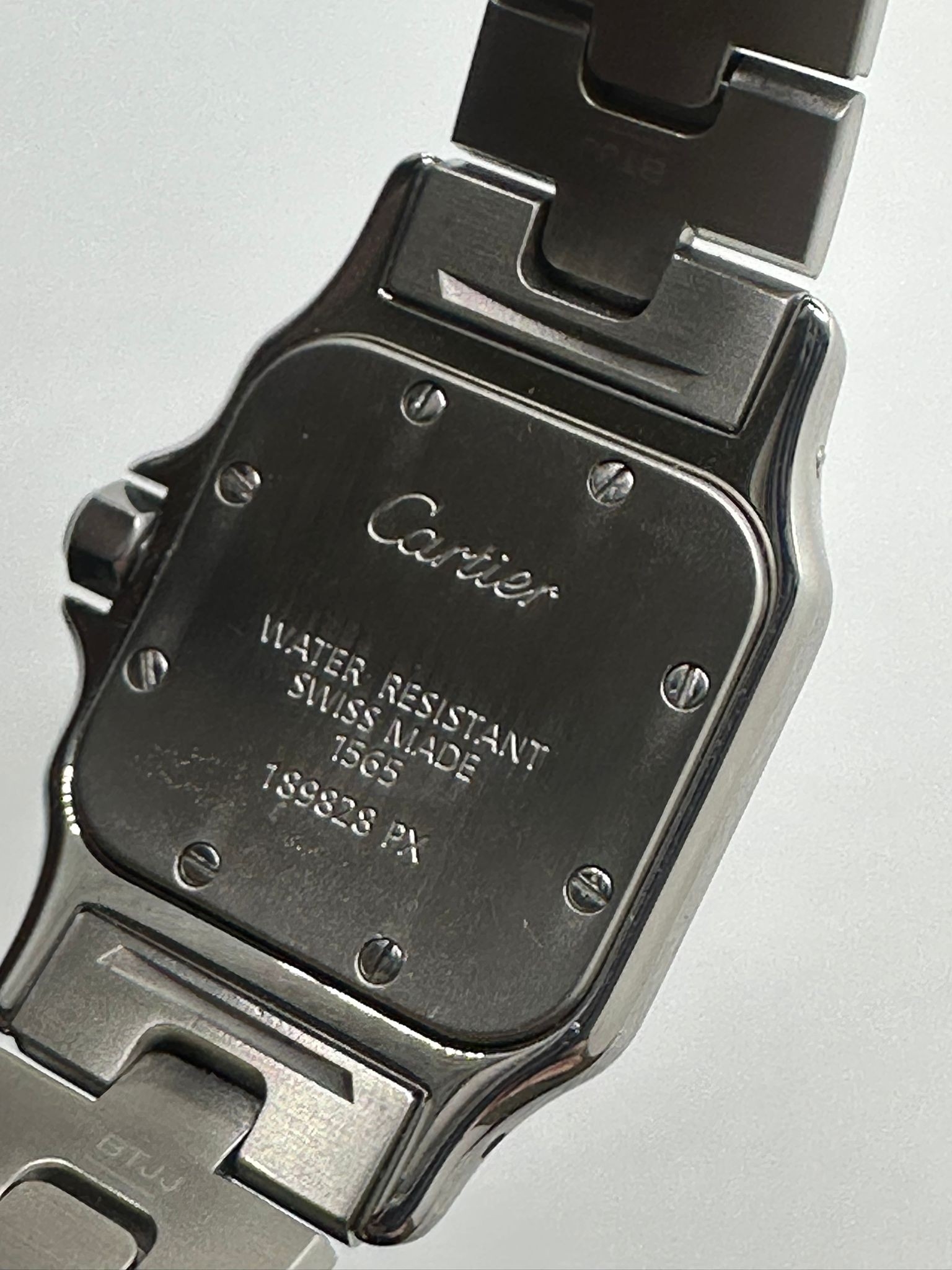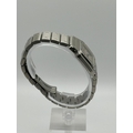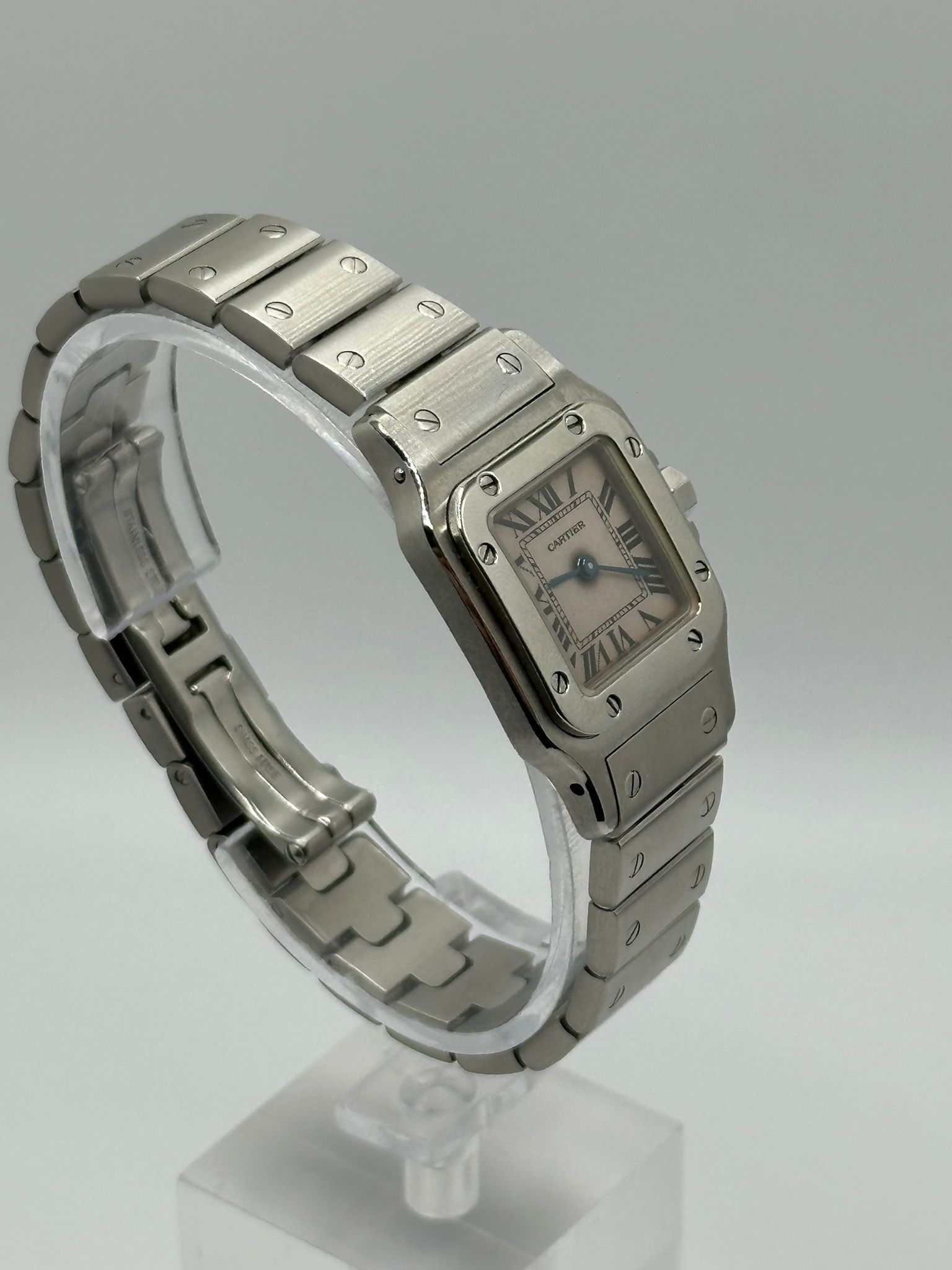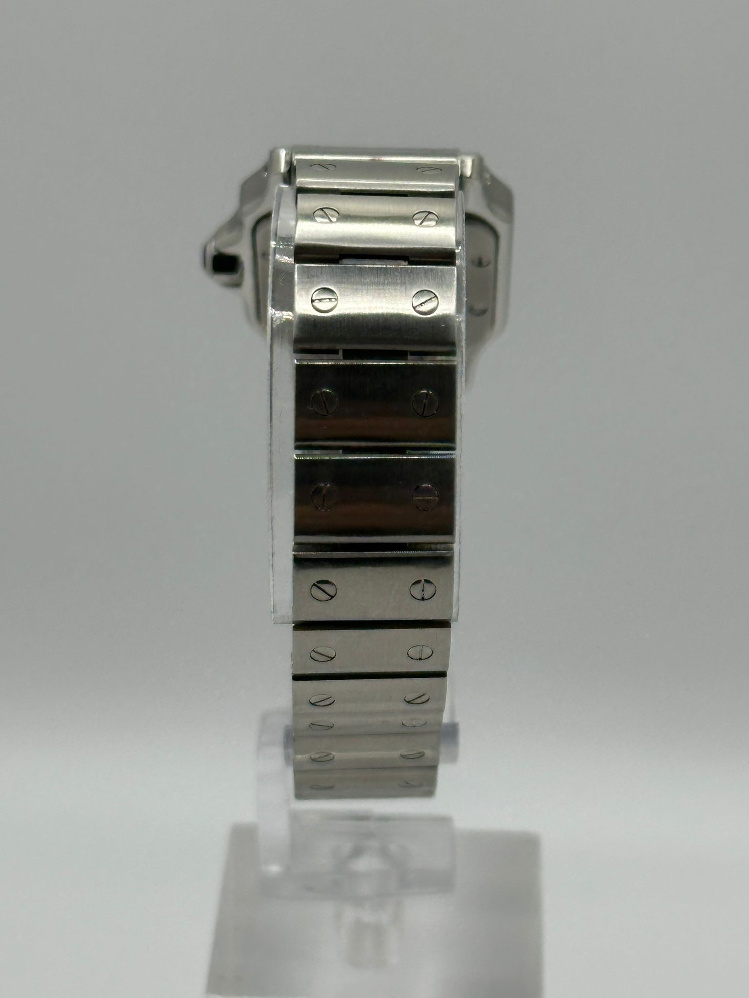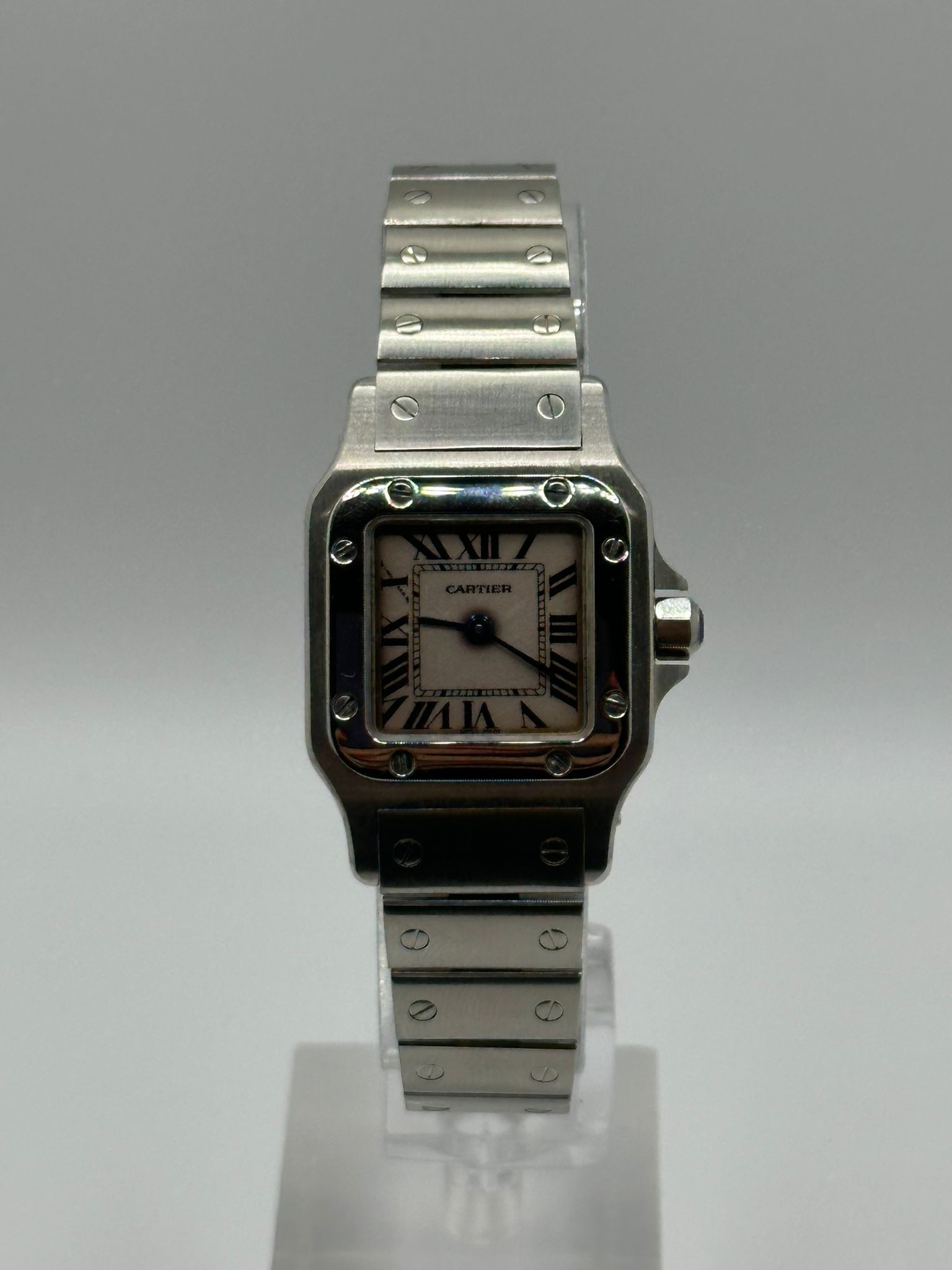 A Cartier 1565 Stainless Steel Santos Watch, 24mm case white dial and Roman numerals. Year 2009, comes with Paperwork. In good working condition, please see photos. Ref 604
