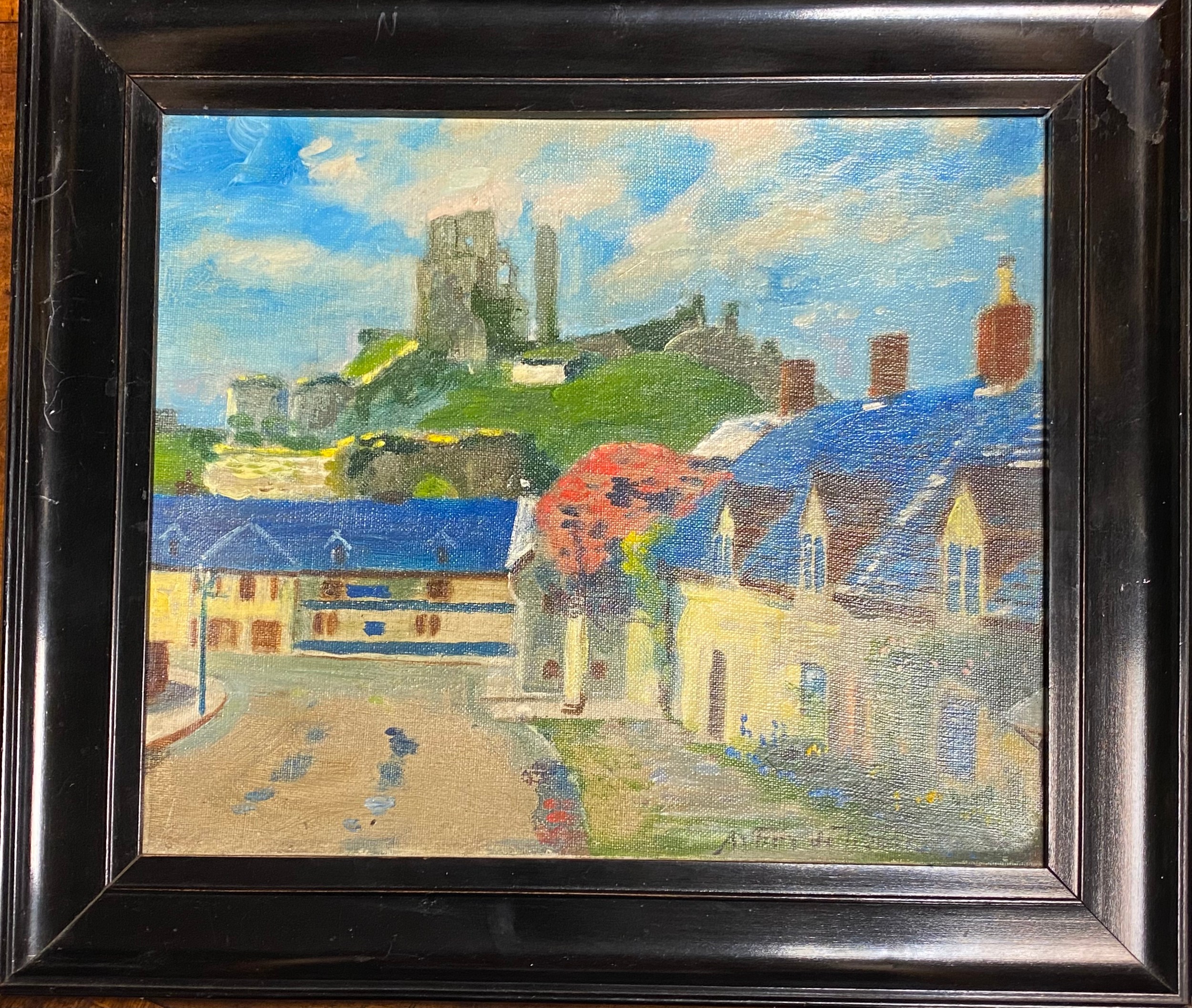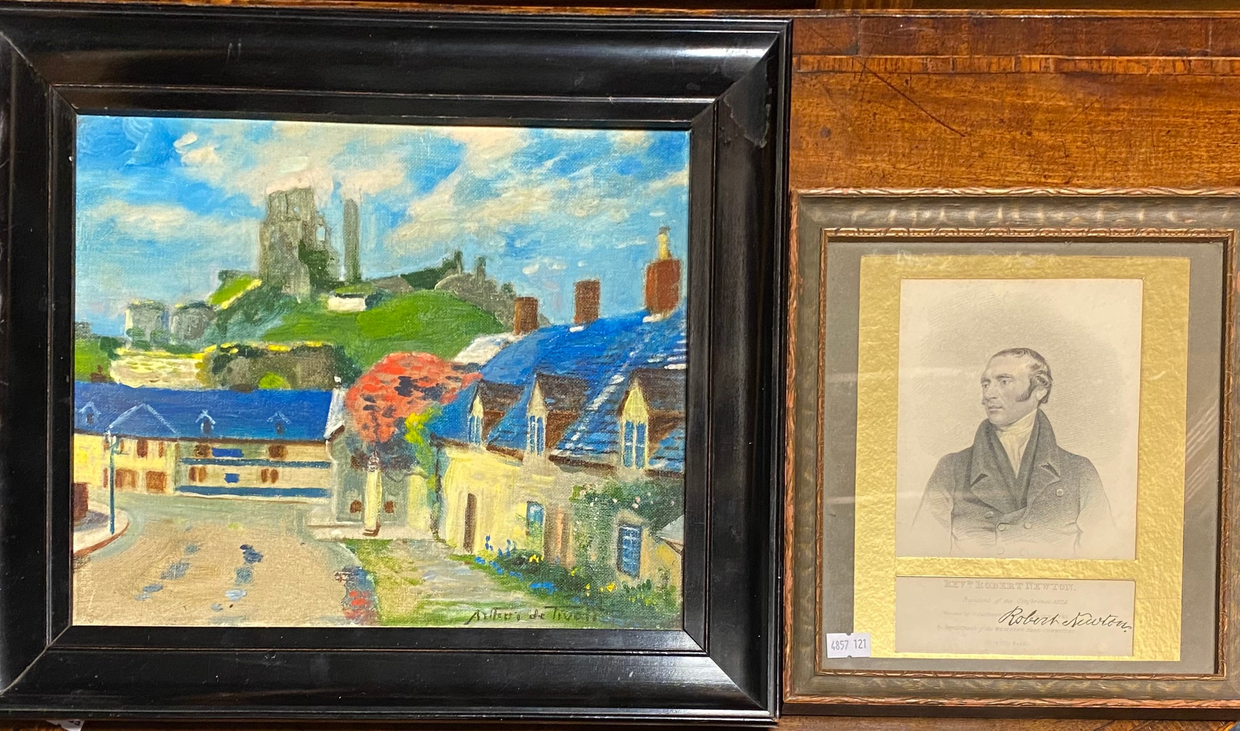 Corfe Castle, signed, oil on canvas and a 19th century print of Robert Newton (2) -