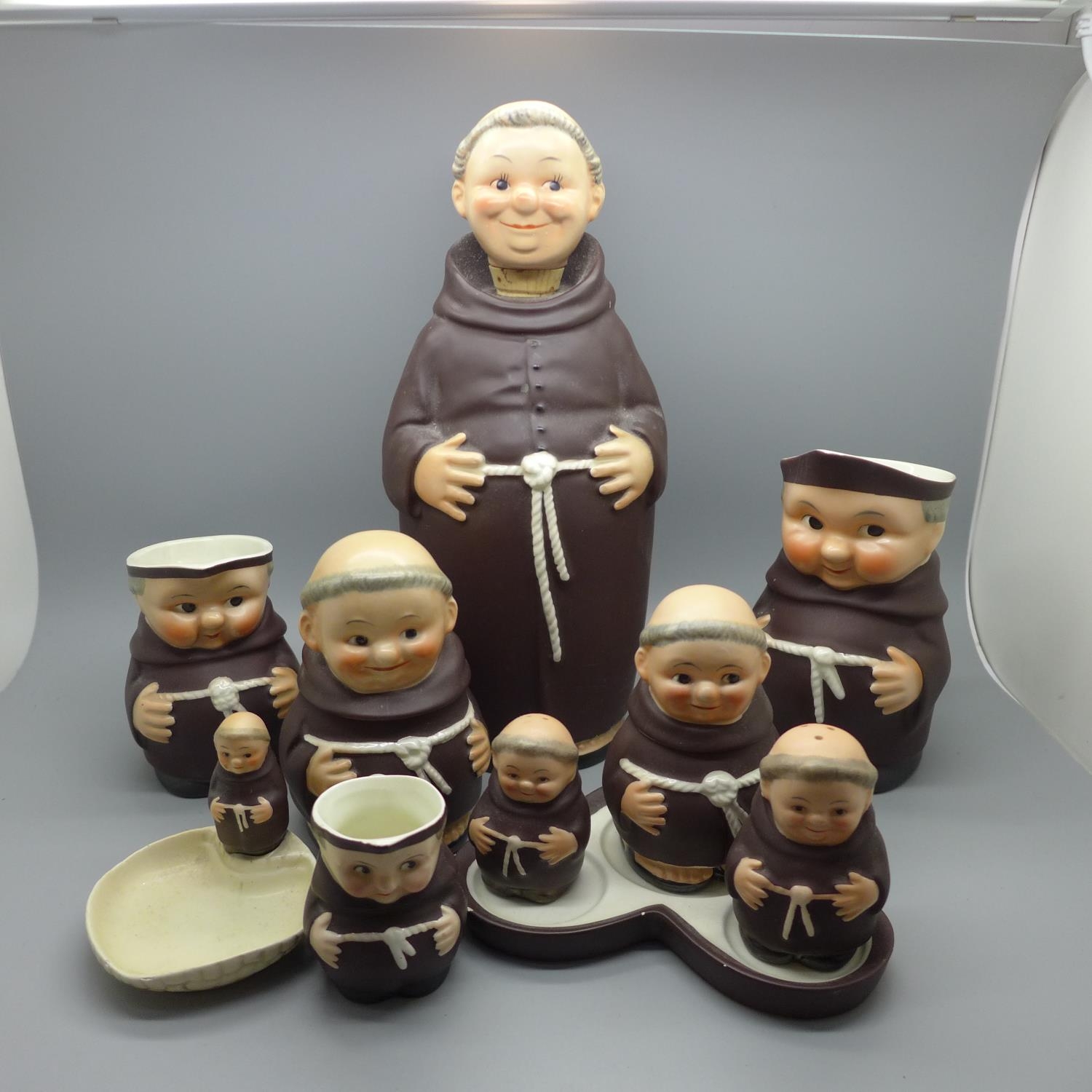A collection of Goebel monks items including a decanter, jugs and cruet set