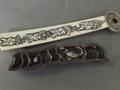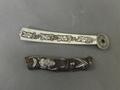 Two Chinese silvered metal scroll weights decorated with figures and toads, 8' long