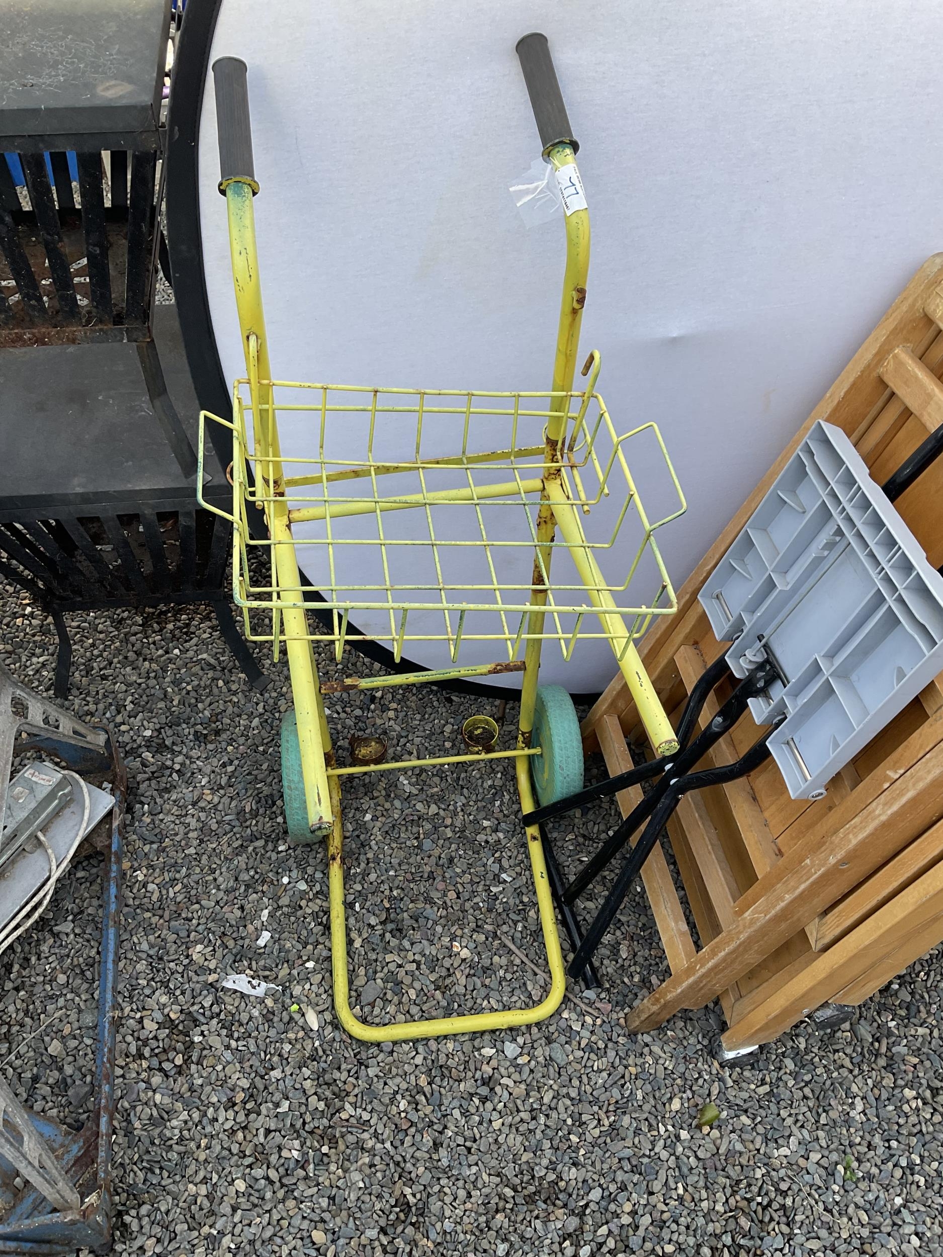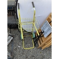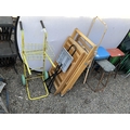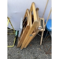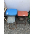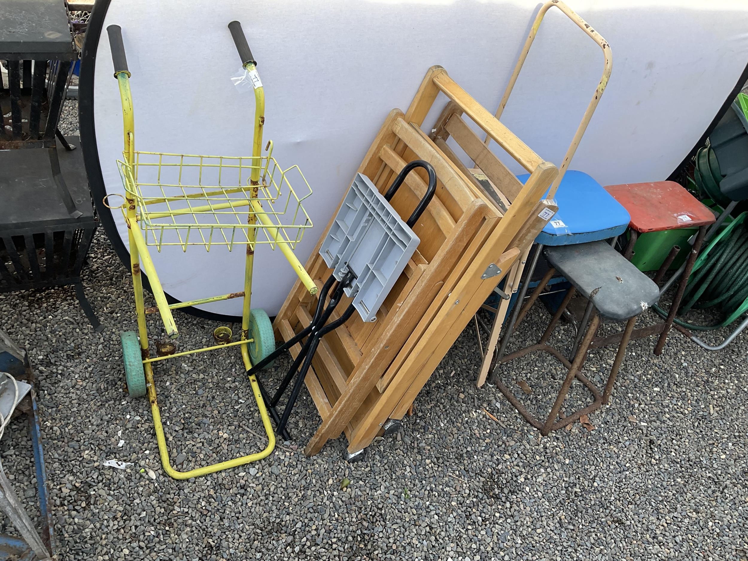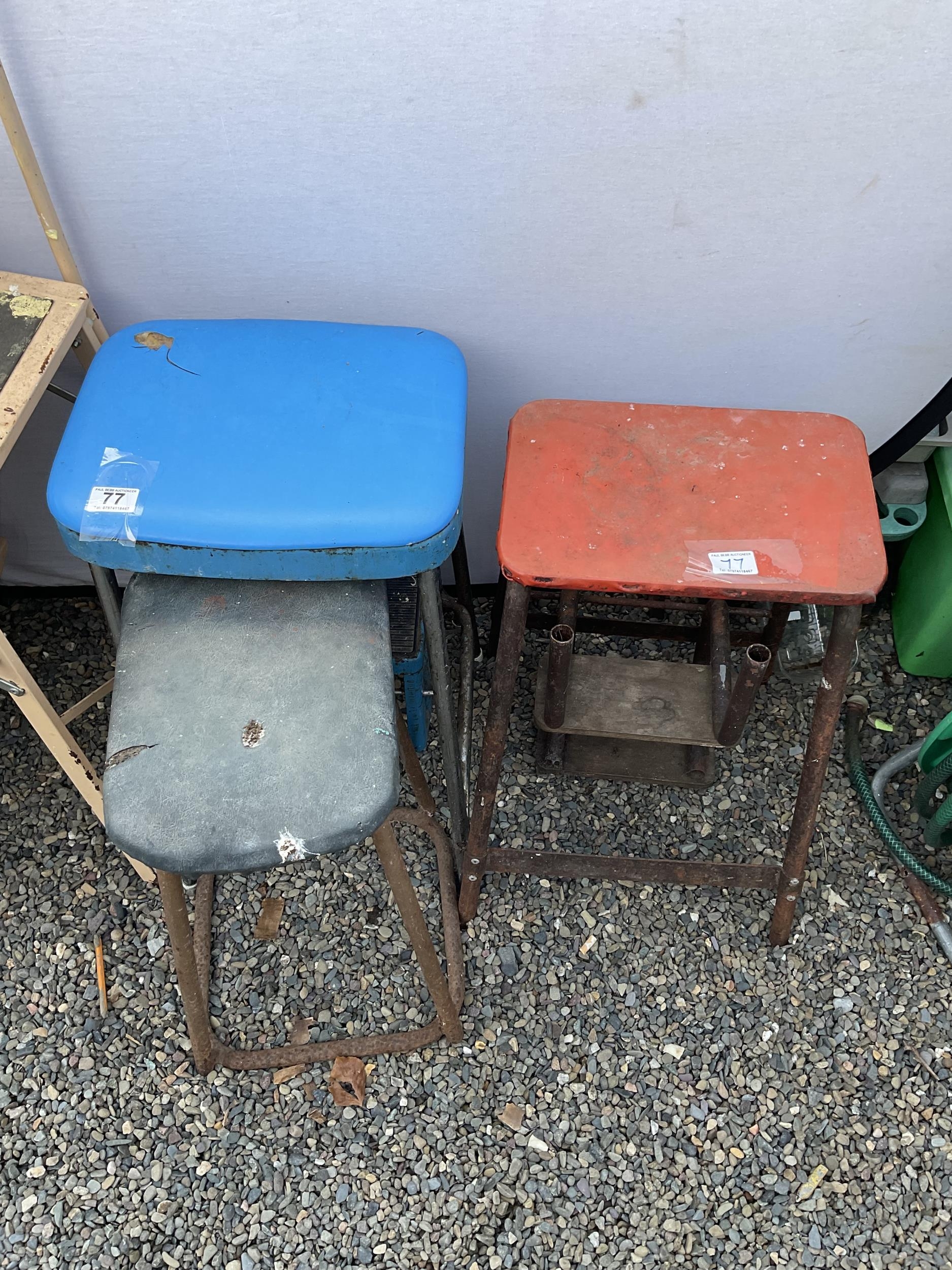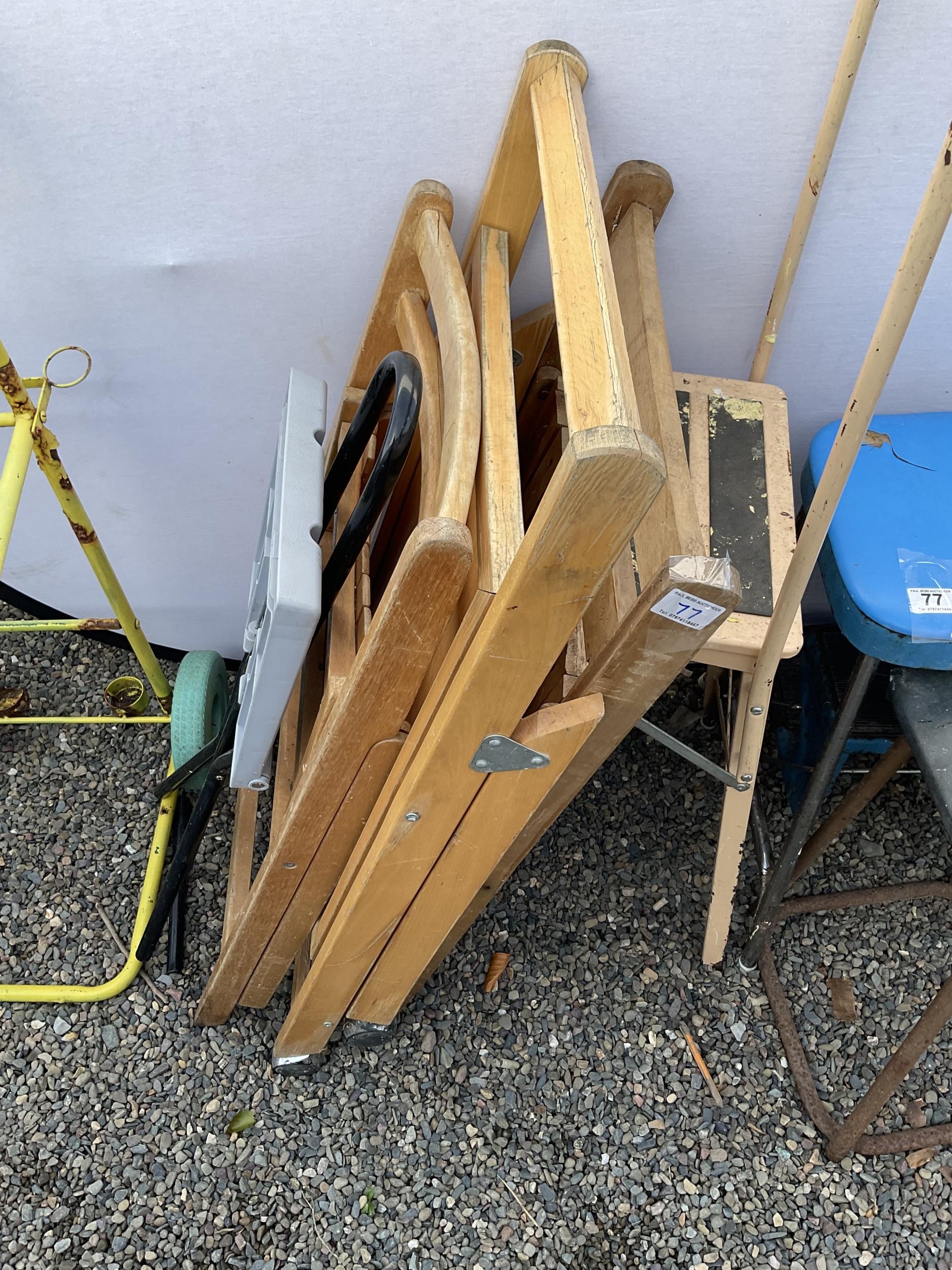 3 WOODEN FOLDING CHAIRS, SMALL METAL STEPS AND 3 RETRO STOOLS