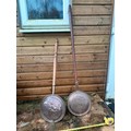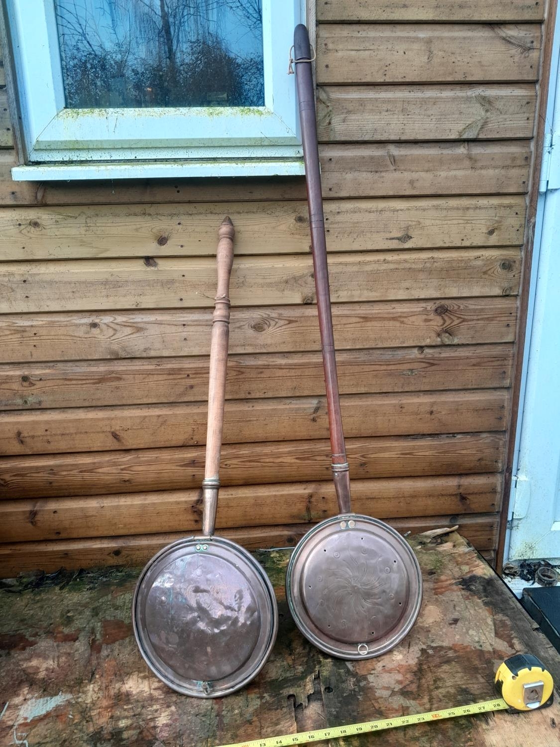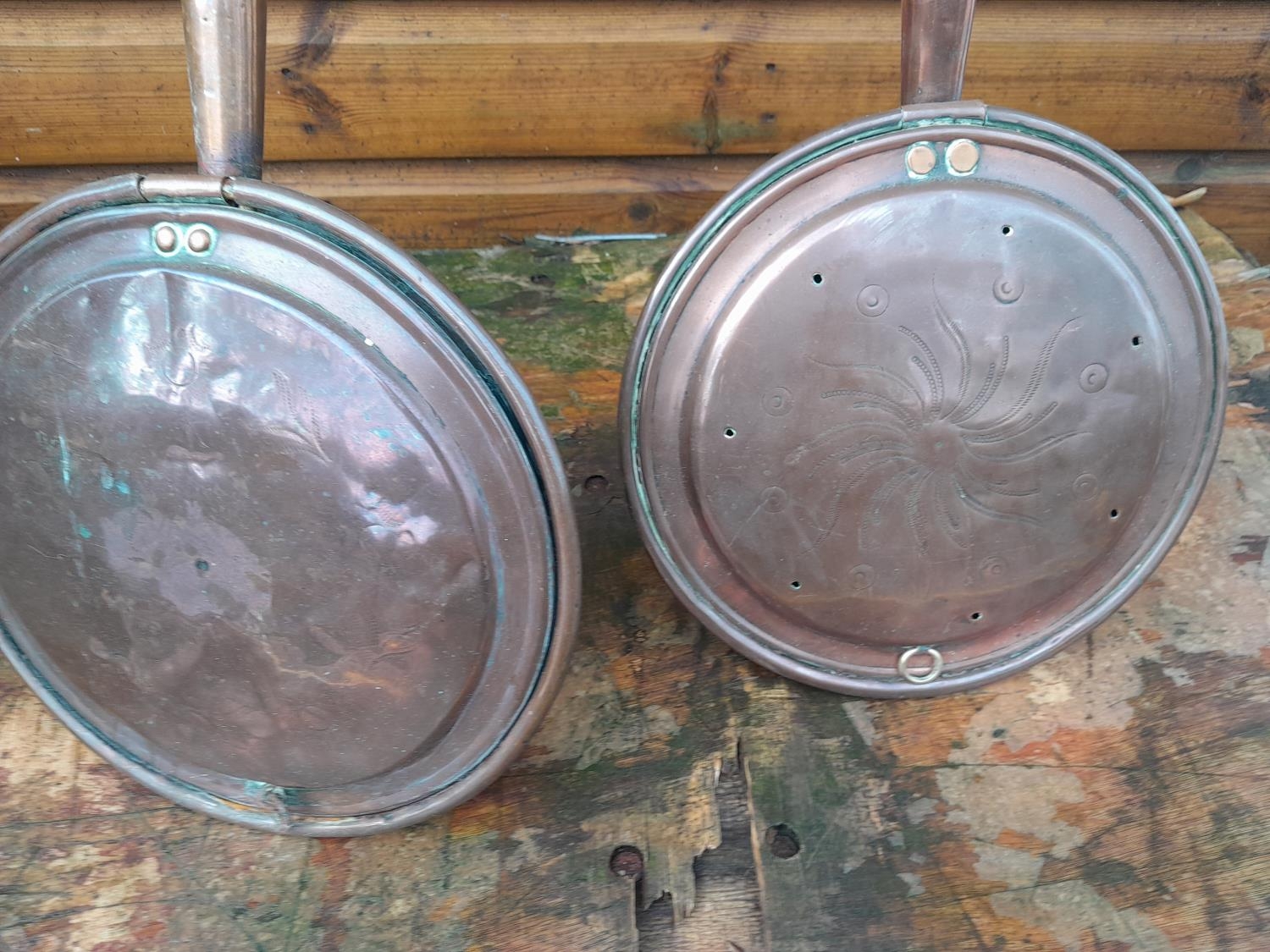 2 x 19th century copper warming pans with wriggle work decoration