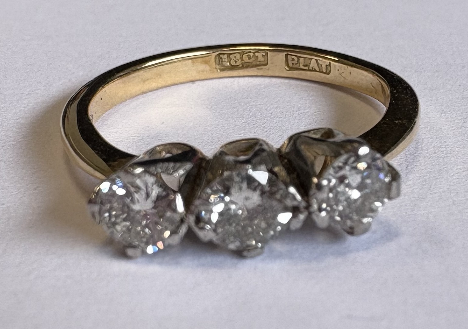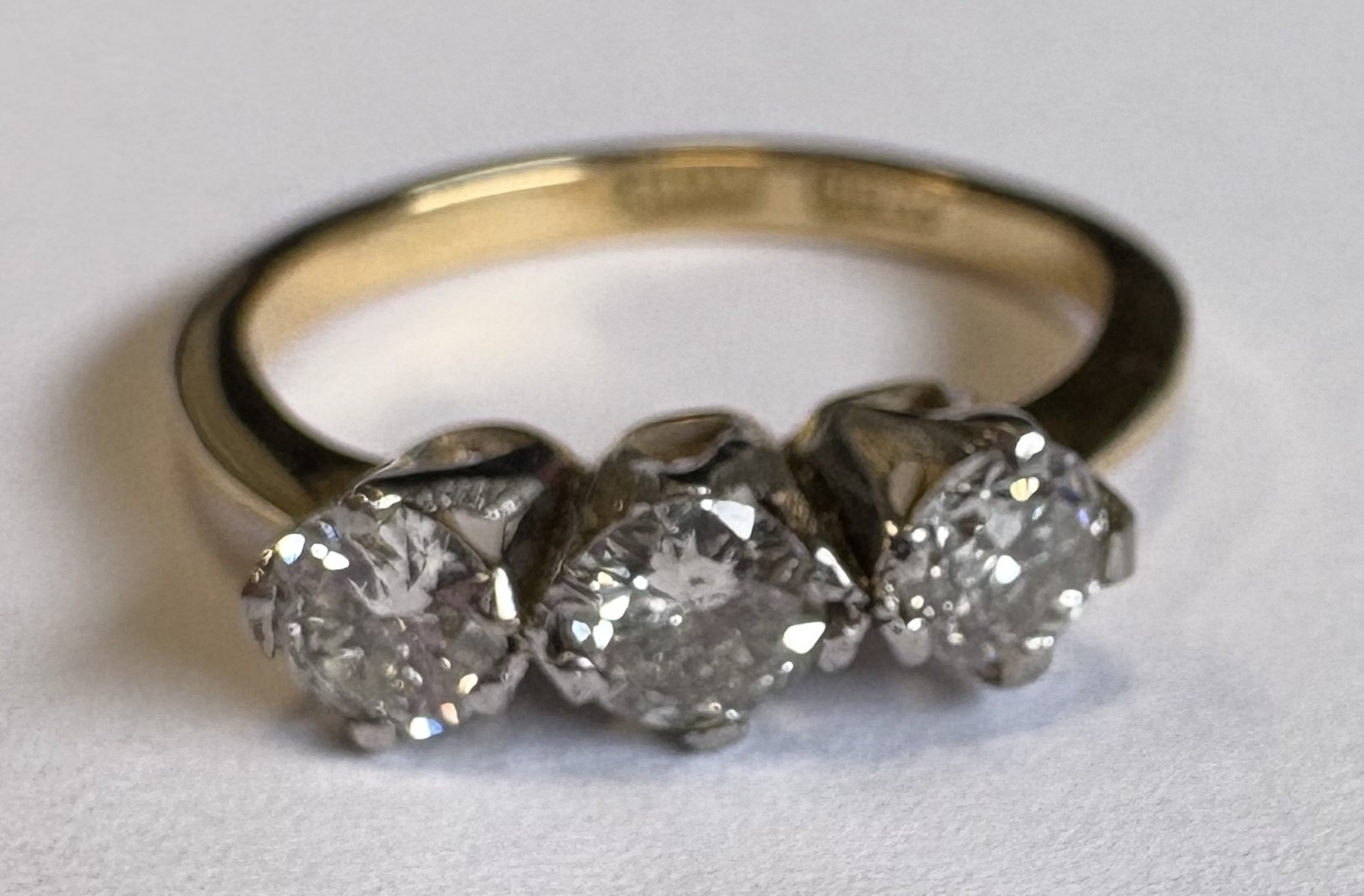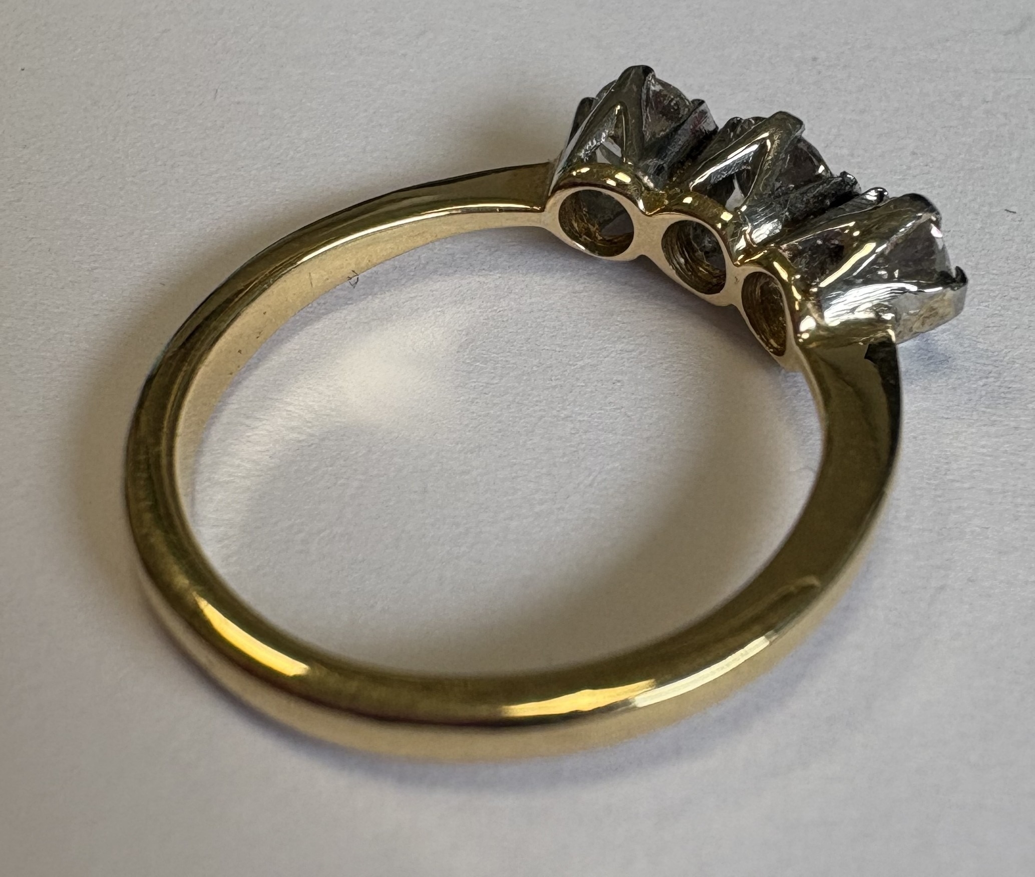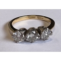 A good three-stone diamond ring in 18 carat gold and platinum claw mount. Approx. 3 grams. Est. £150 - £200.