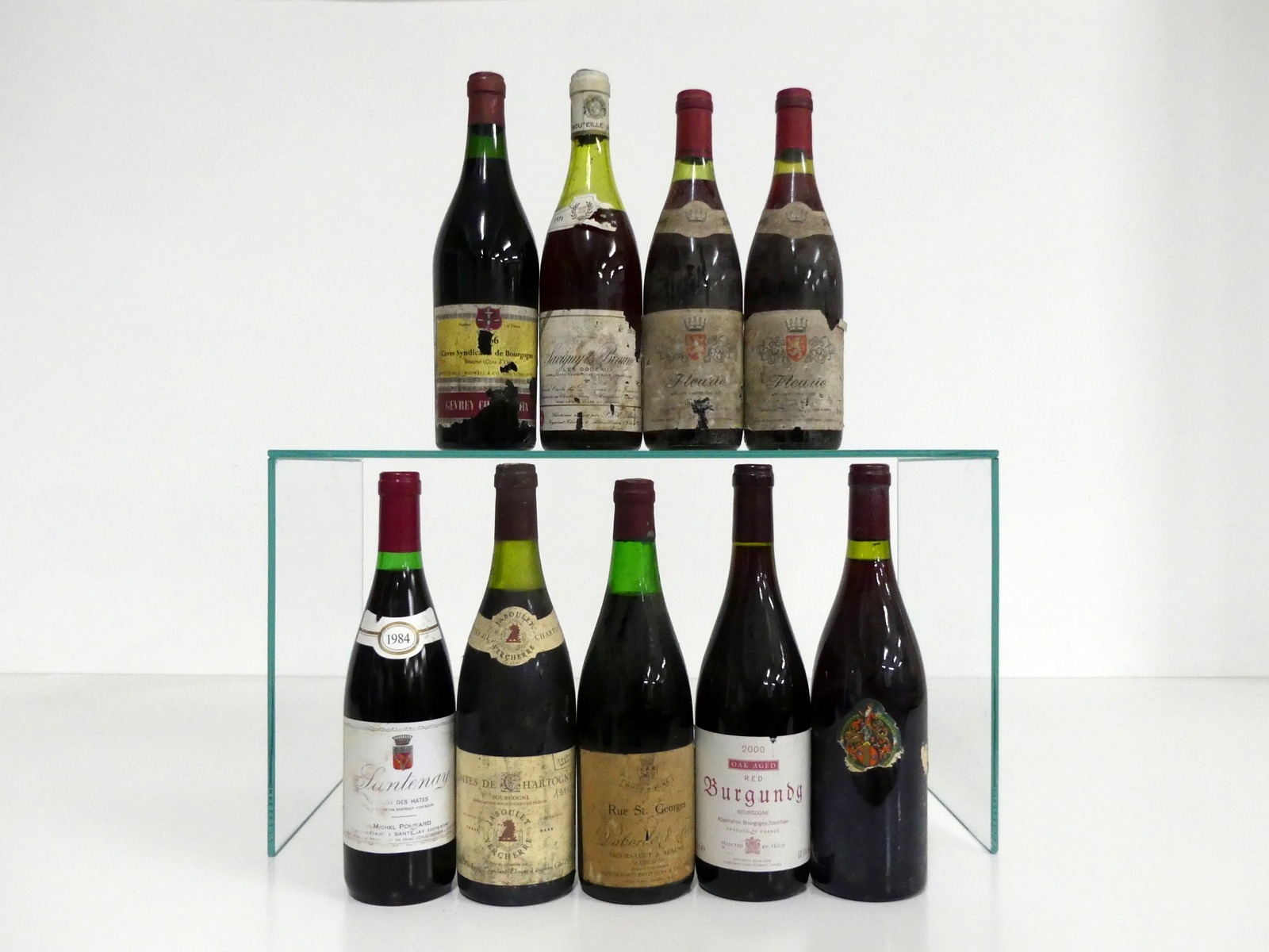 1 bt Gevrey Chambertin believed 1966 Caves Syndicates de Bourgogne EB, i.n, bs, torn label 1 bt Savigny-Les-Beaune Les Godeaux 1974 Dom de la Juvinière ls, bs, torn/cdl, pale appearance, sl crusted foil 2 bts Fleurie 1984 Domaine Unknown i.n, vts, bs, cdl 1 bt Santenay Clos de Hates 1984 Michel Ponsard i.n, vsl stl 1 bt Bourgogne Comtes de Chartogne Vintage Unknown Jaboulet Verchere ms/us, bs, crusted foil, handwriting on label 1 bt Bourgogne Rue St Georges Vintage Unknown Daborde et Fils EB us/ts, Cuddeford Brothers & Co, us/ts, bs, vsl torn label 1 bt Oak Aged Red Burgundy 2000 selected by Tesco i.n, sl bs 1 bt Unknown Confrierie Chevalliers du Tastevin Vintage Unknown ts Above 9 bottles