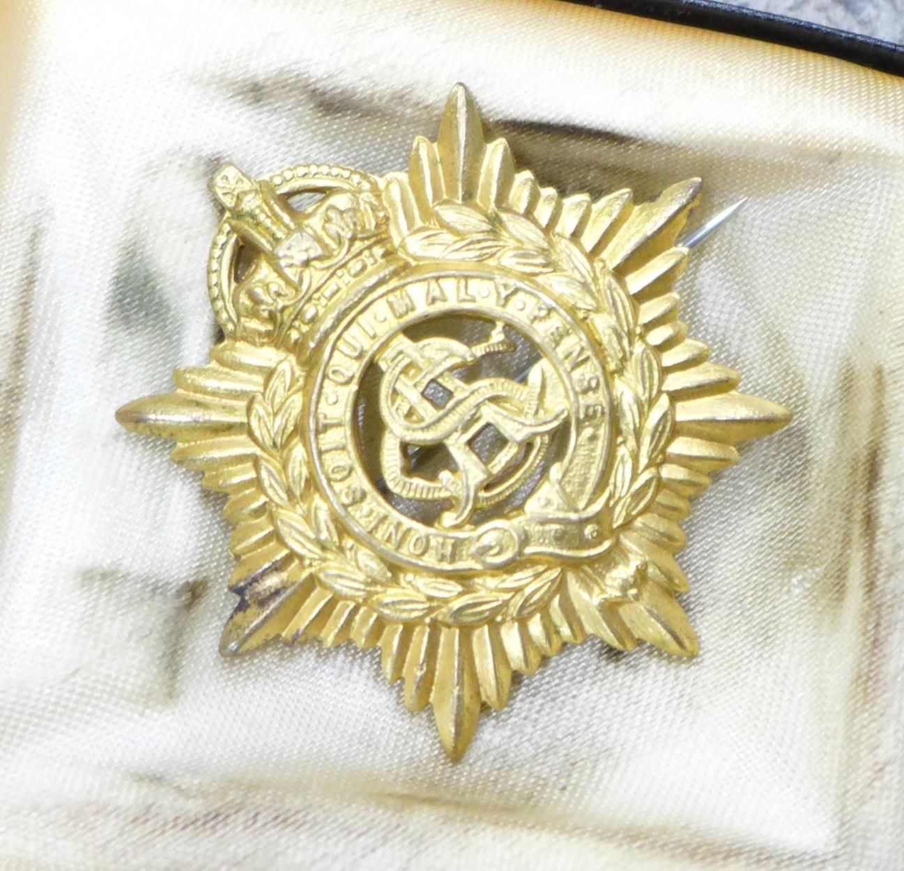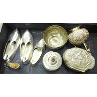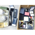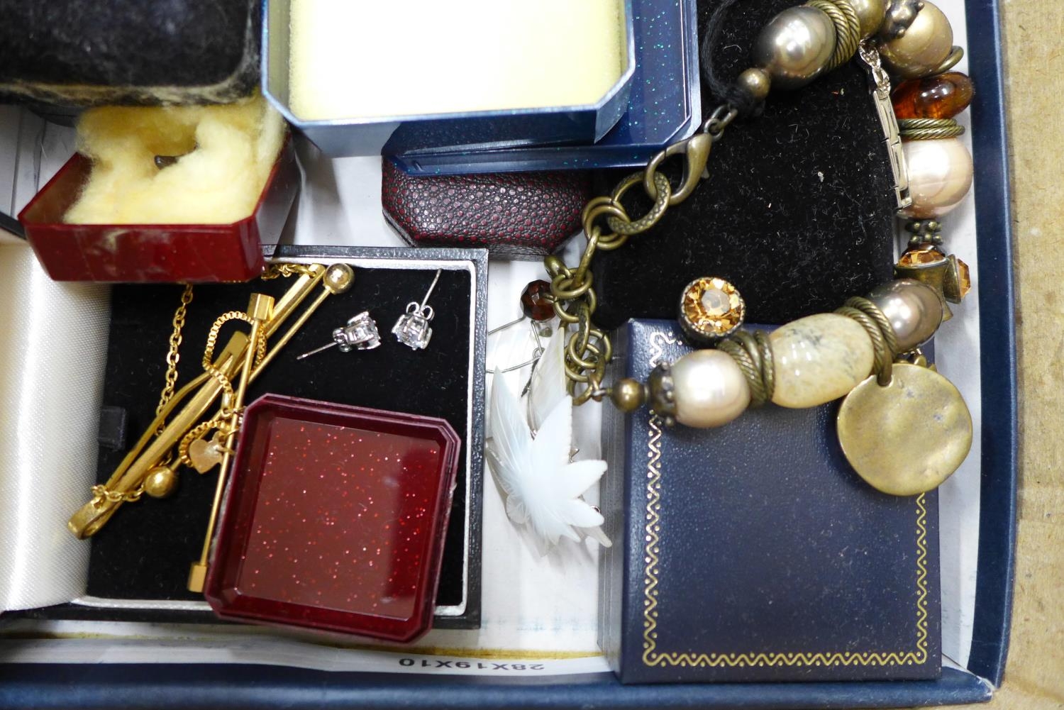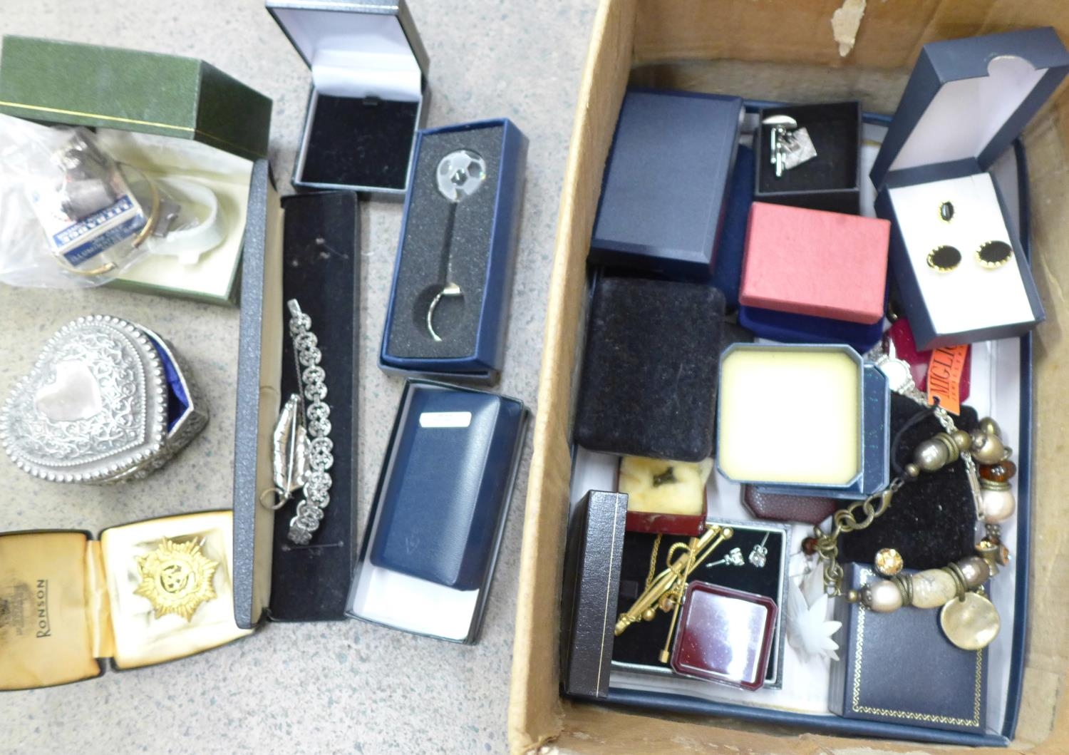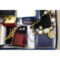 Costume jewellery, a Coronation 'Litbadge', three silver thimbles, a metal core bangle, a trinket box and a military badge