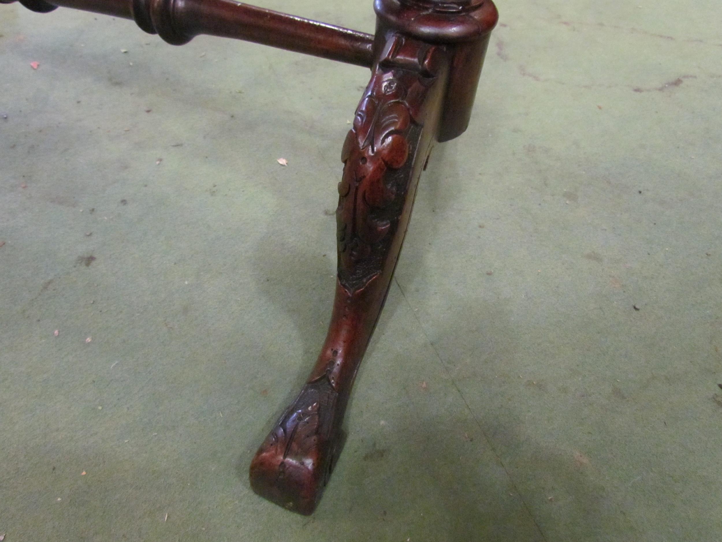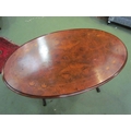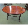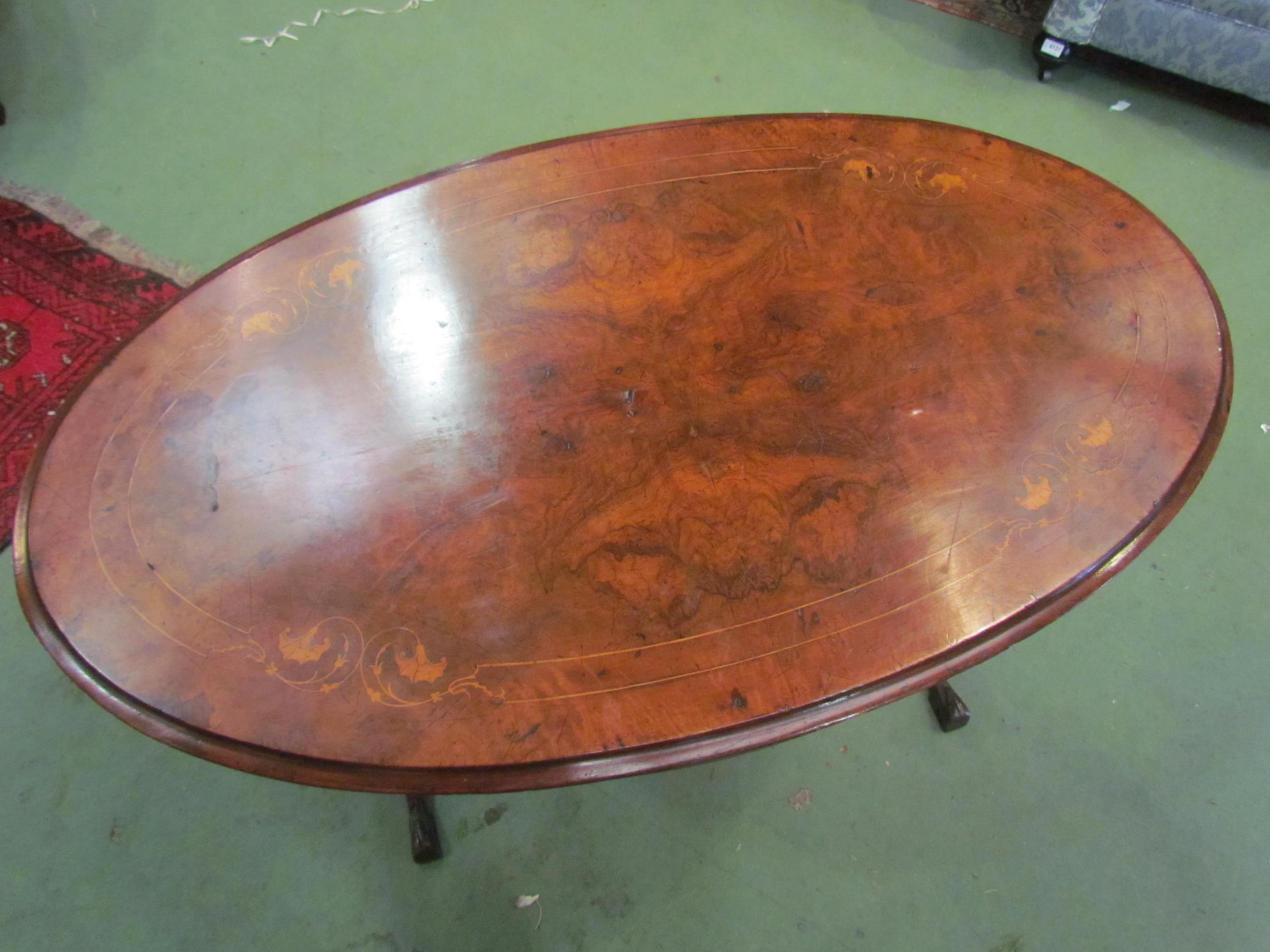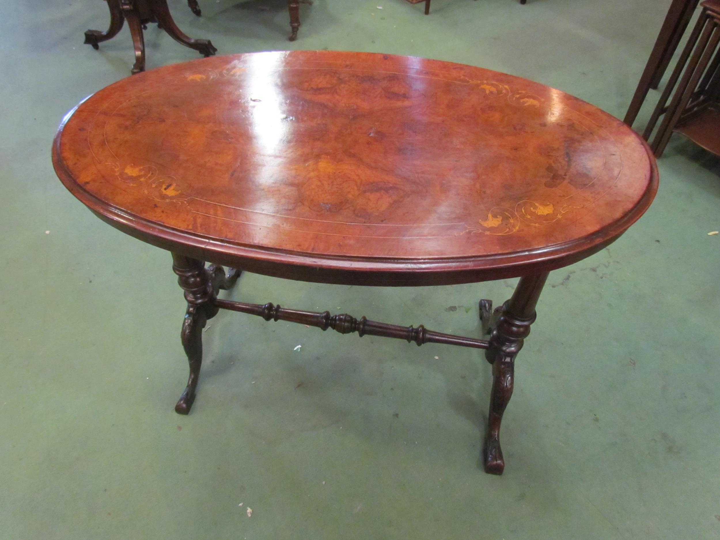A mid Victorian inlaid walnut oval top lamp table on turned and carved columns over carved outswept legs joined by a turned stretcher, 69cm high x 97cm long x 56cm wide