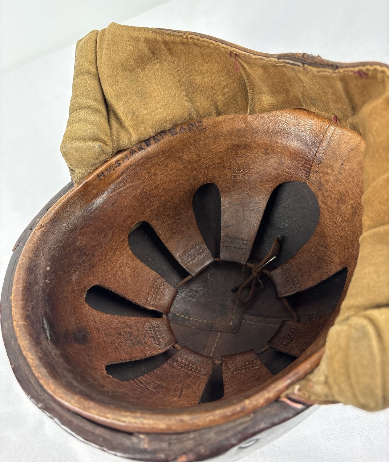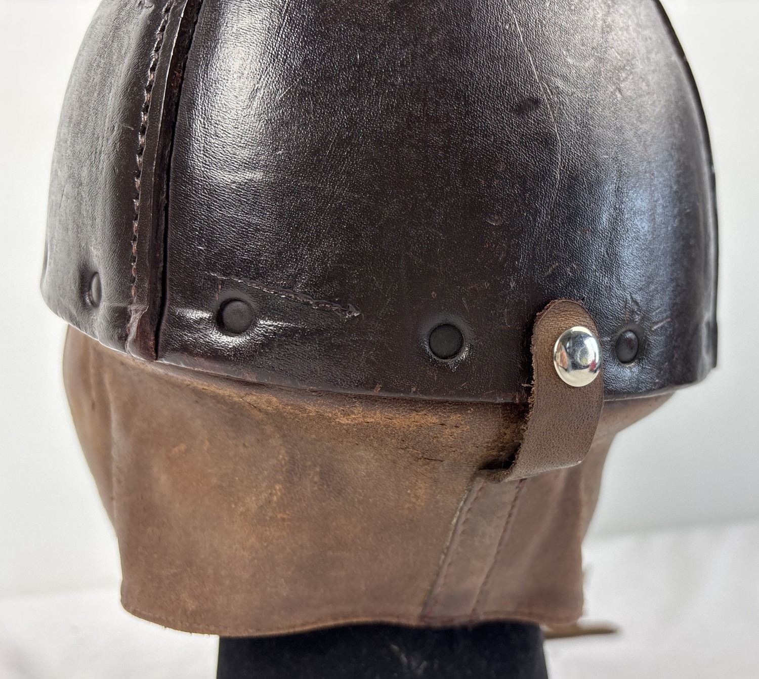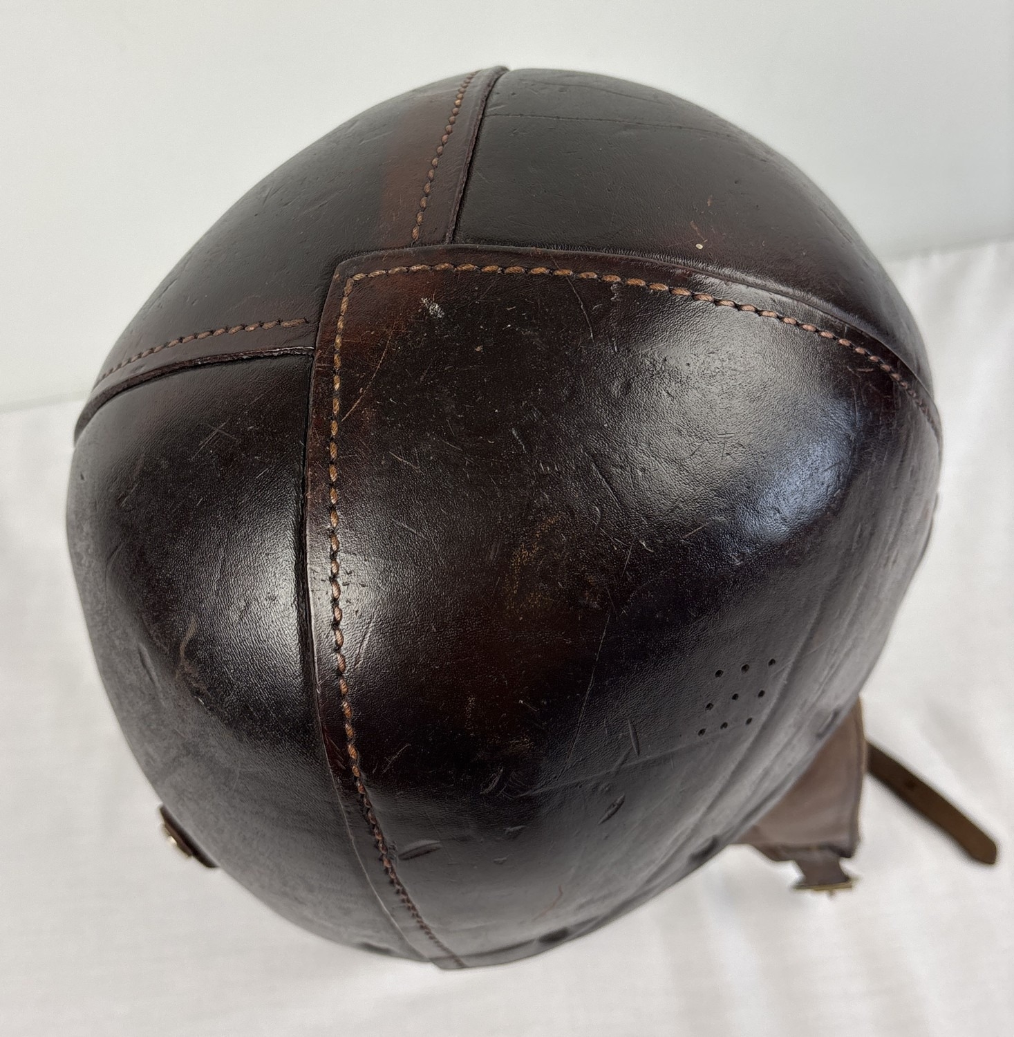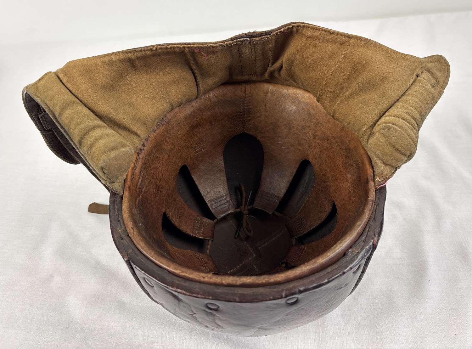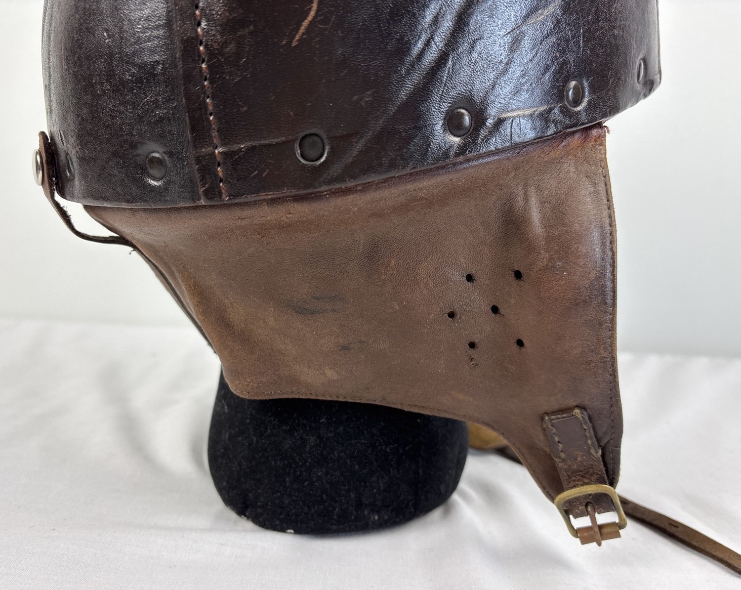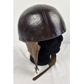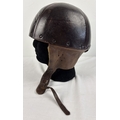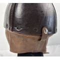 A World War II era leather pudding basin motorcycle helmet with integral leather neck, ear flaps and strap. Stamped inside JHLtd 1942.