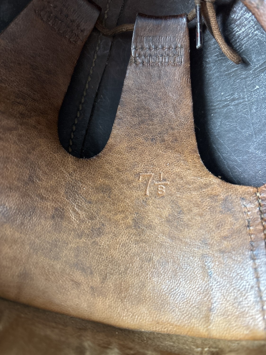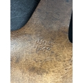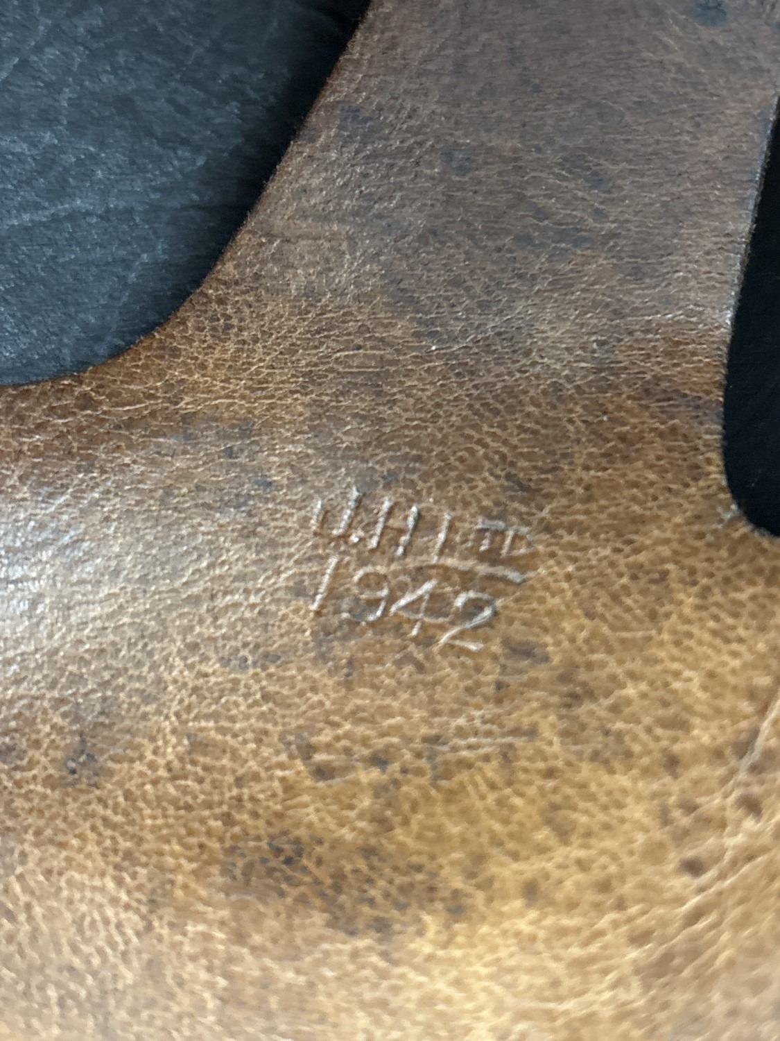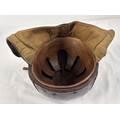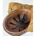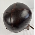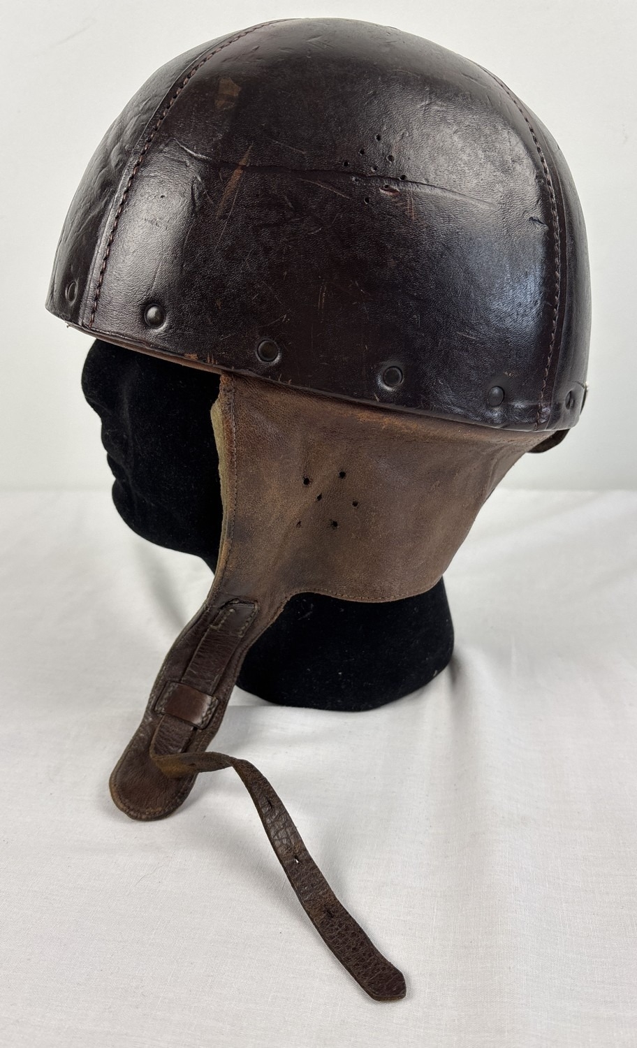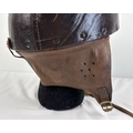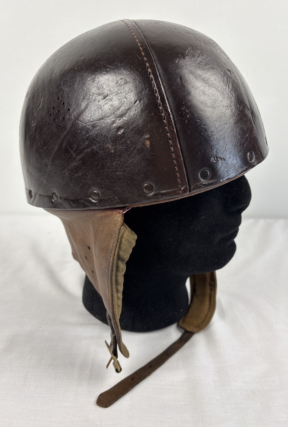 A World War II era leather pudding basin motorcycle helmet with integral leather neck, ear flaps and strap. Stamped inside JHLtd 1942.
