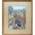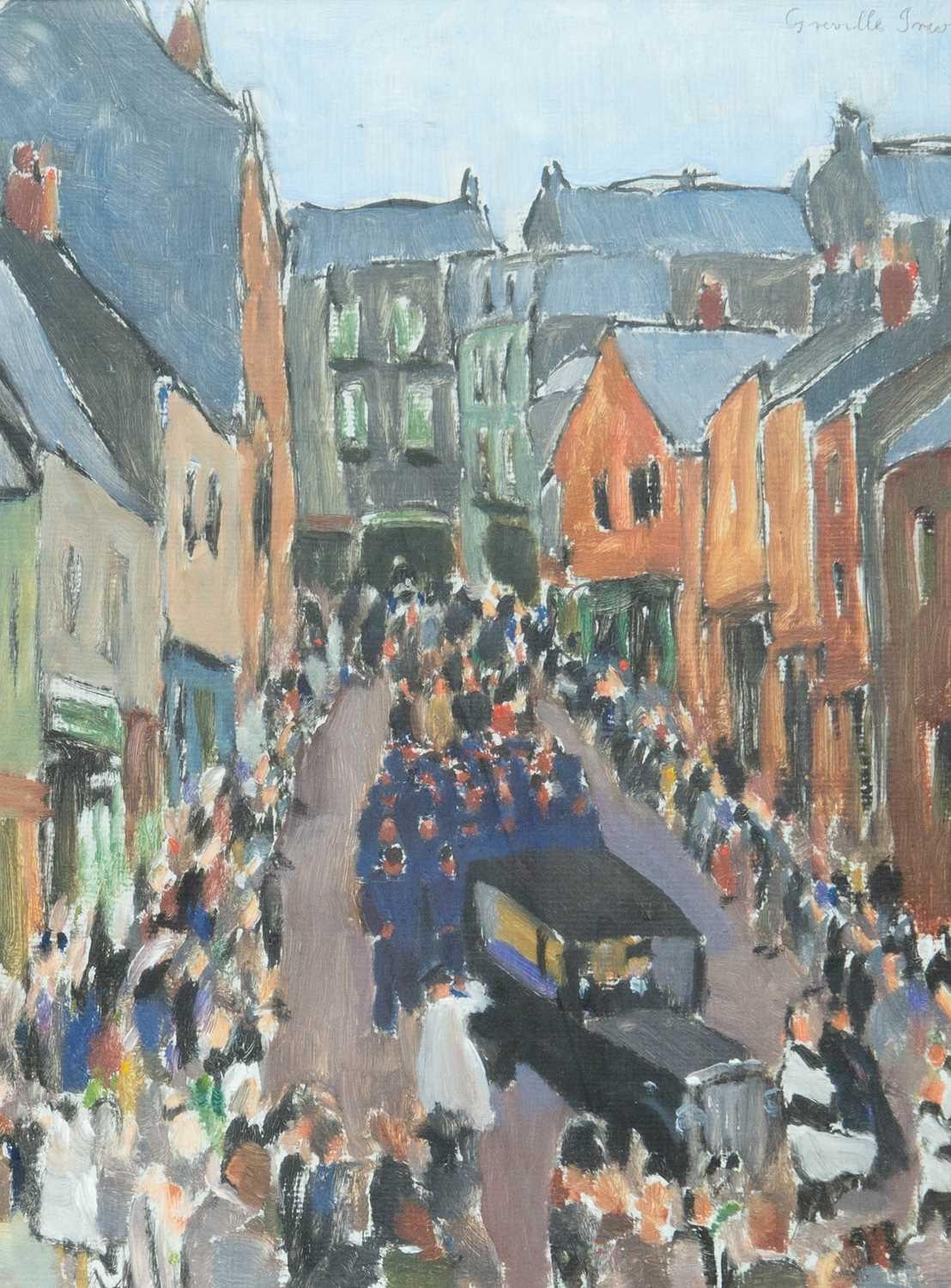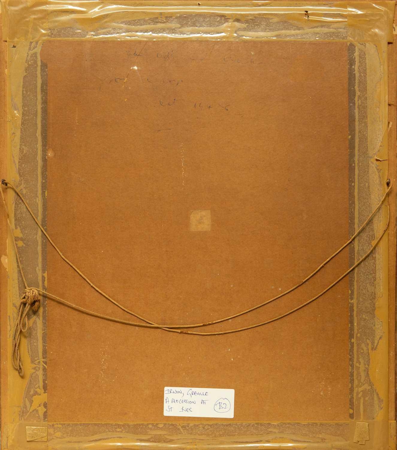 Greville IRWIN (1893-1947) The Cortege, St Ives (1946) Oil on canvas laid onto board, signed and dated '46, further signed to verso, 40 x 31cm, framed 59 x 50cm Cataloguer's Note This work depicts the funeral procession for the lives lost during the wreckage of the French Crabber 'Finisterre' of Cameret, the vessel was driven ashore by a strong northerly gale onto the rocks at Porthminster Point during the early hours of Saturday the 10th of August 1946, three of the four crew members were killed. The moving burial (depicted here) commenced at the Catholic Church in St Ives and was attended by more than thirty Bretons from Crabbers lying at Newlyn. Joseph Trevillion and Eugene Carn were buried at Barnoon Cemetary; the body of their shipmate Pierre Derrien was yet to be recovered. The burial at Barnoon Cemetary is depicted in a further painting by Greville Irwin, acquired by St Ives Guildhall in 1946. The Estate of Sir Geoffrey & Lady Holland