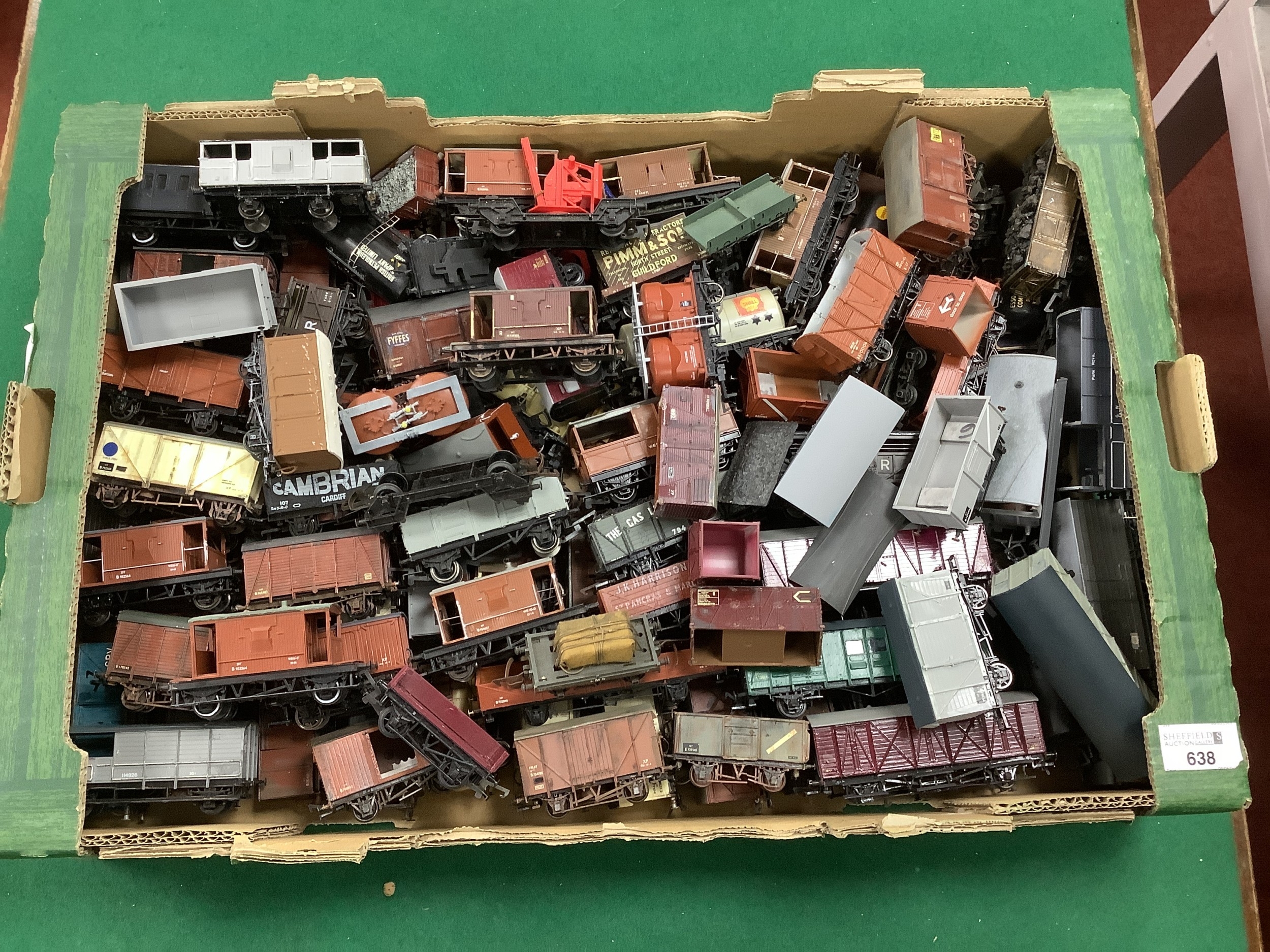 Approximately one hundred 00 gauge wagons by various manufacturers or kit-built, several with loads, many missing couplings or wheels, including several brake vans, all playworn.